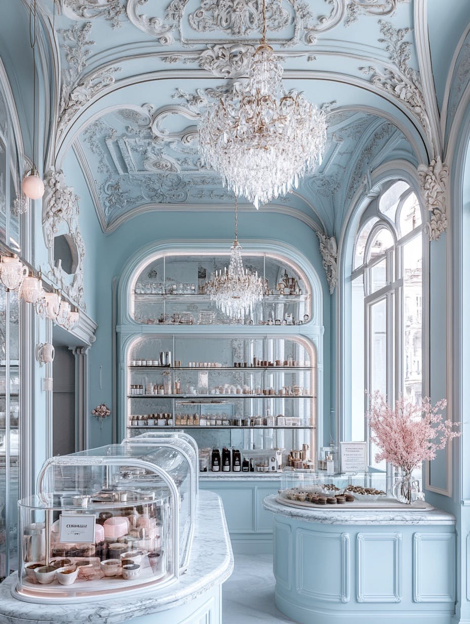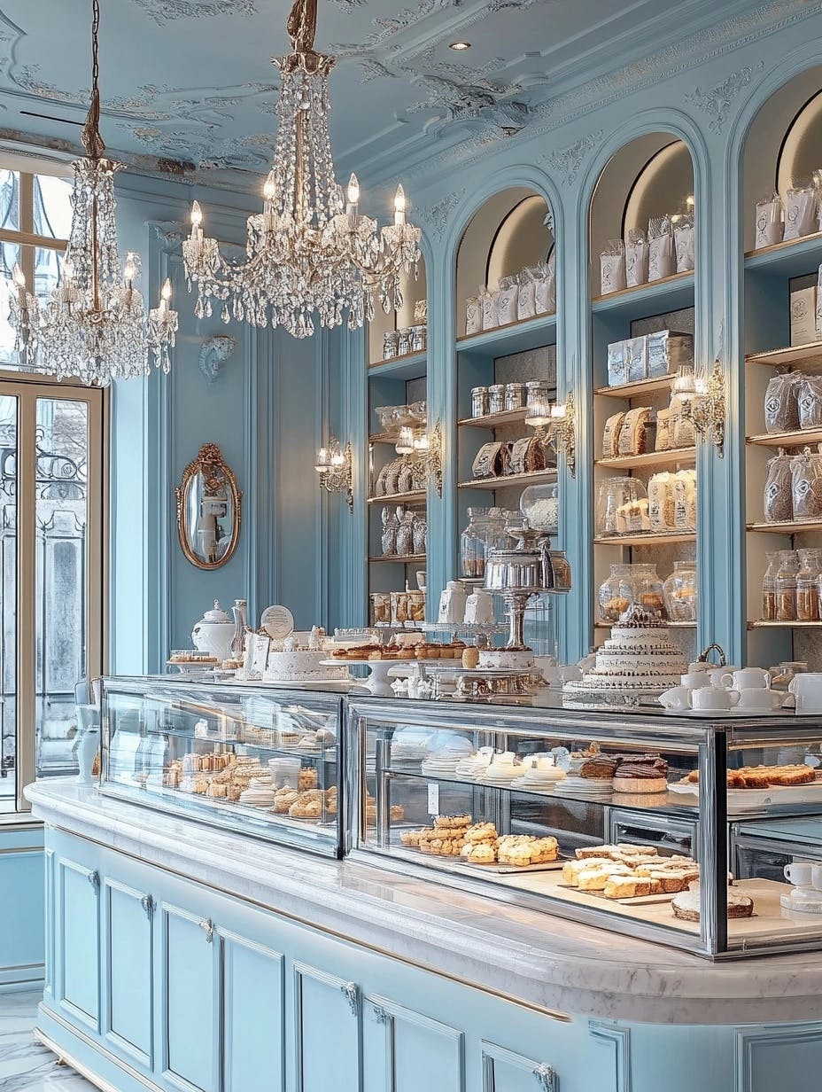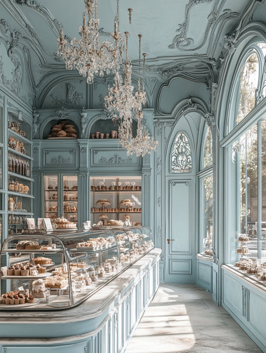 Elegant French patisserie, ornate Rococo-style interior, pastel blue walls with intricate moldings, marble countertops with a polished finish, glass display cases filled with macarons and pastries, crystal chandeliers hanging from the ceiling, soft natural light streaming through tall arched windows, delicate shelving showcasing jars and desserts, luxurious and inviting atmosphere, high-definition details, soft and warm tones, timeless sophistication. --chaos 10 --ar 3:4 --stylize 150 --v 6.1