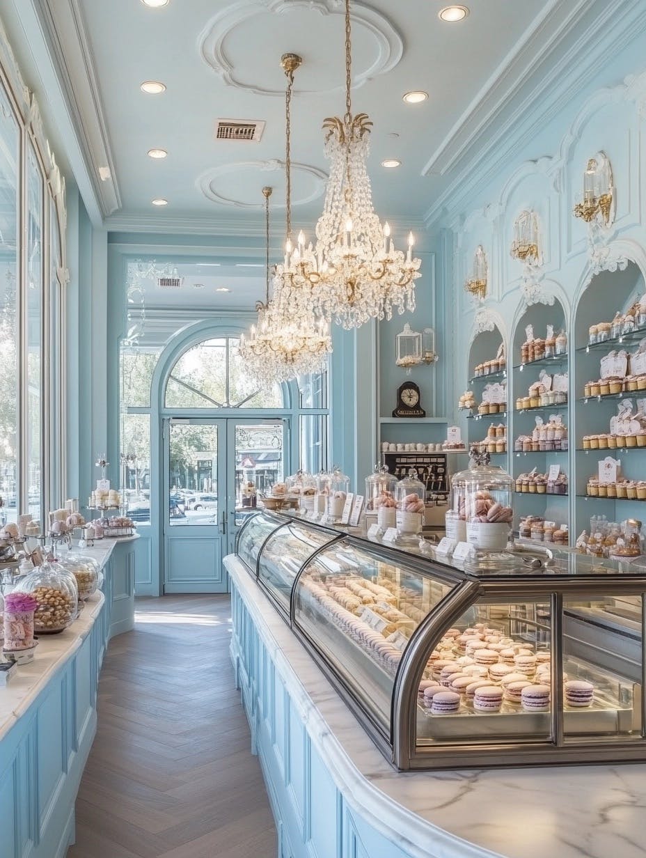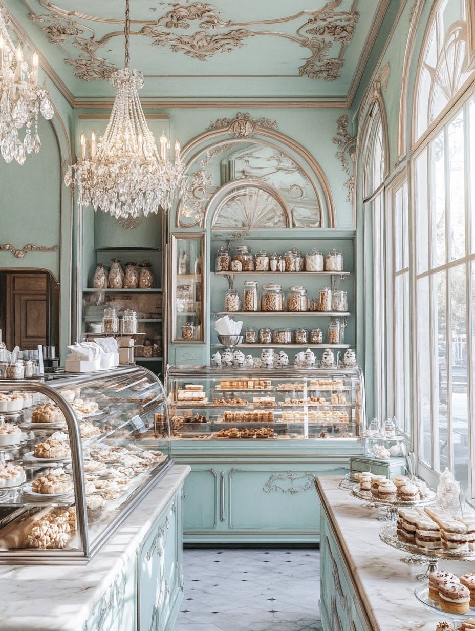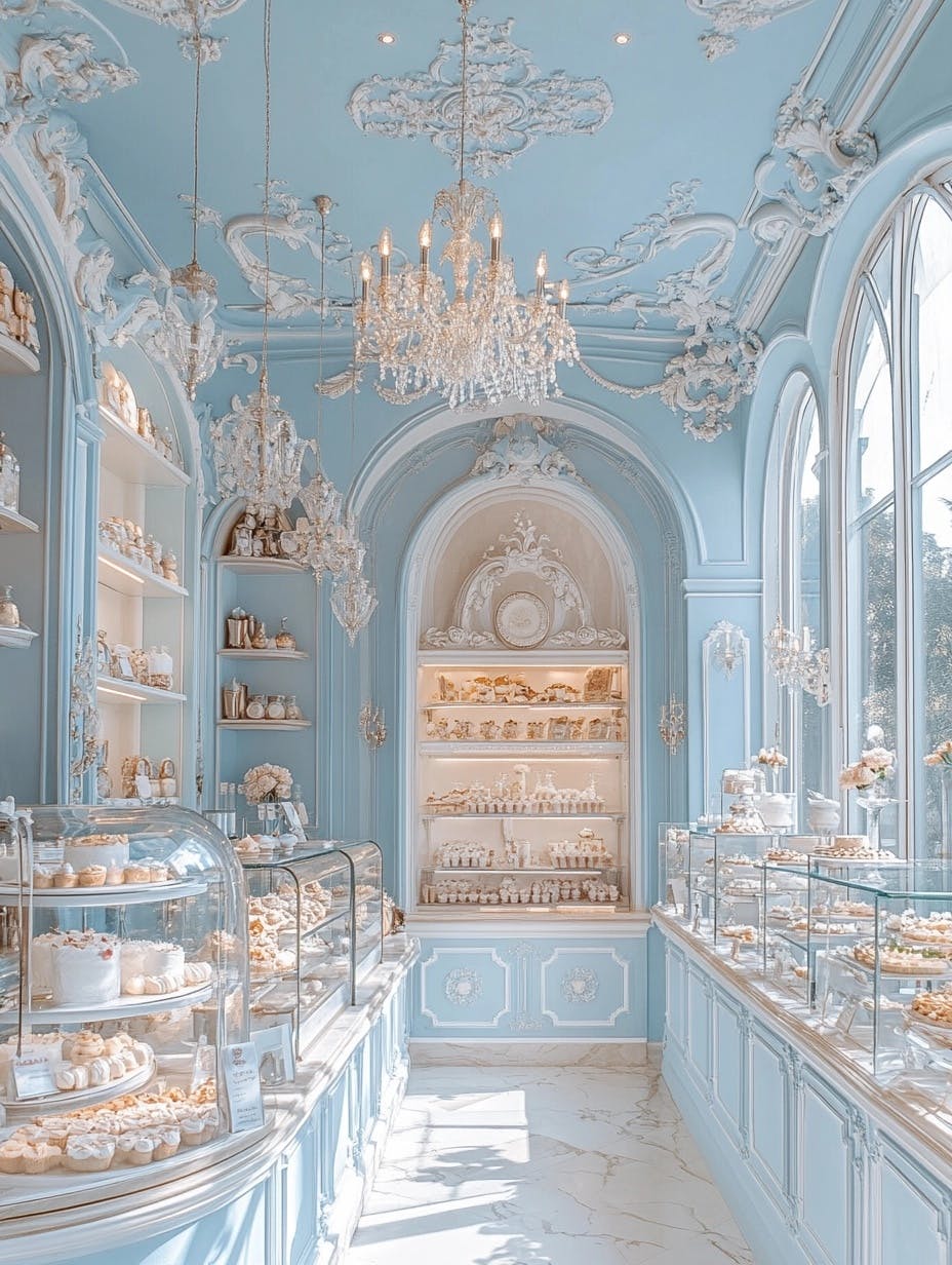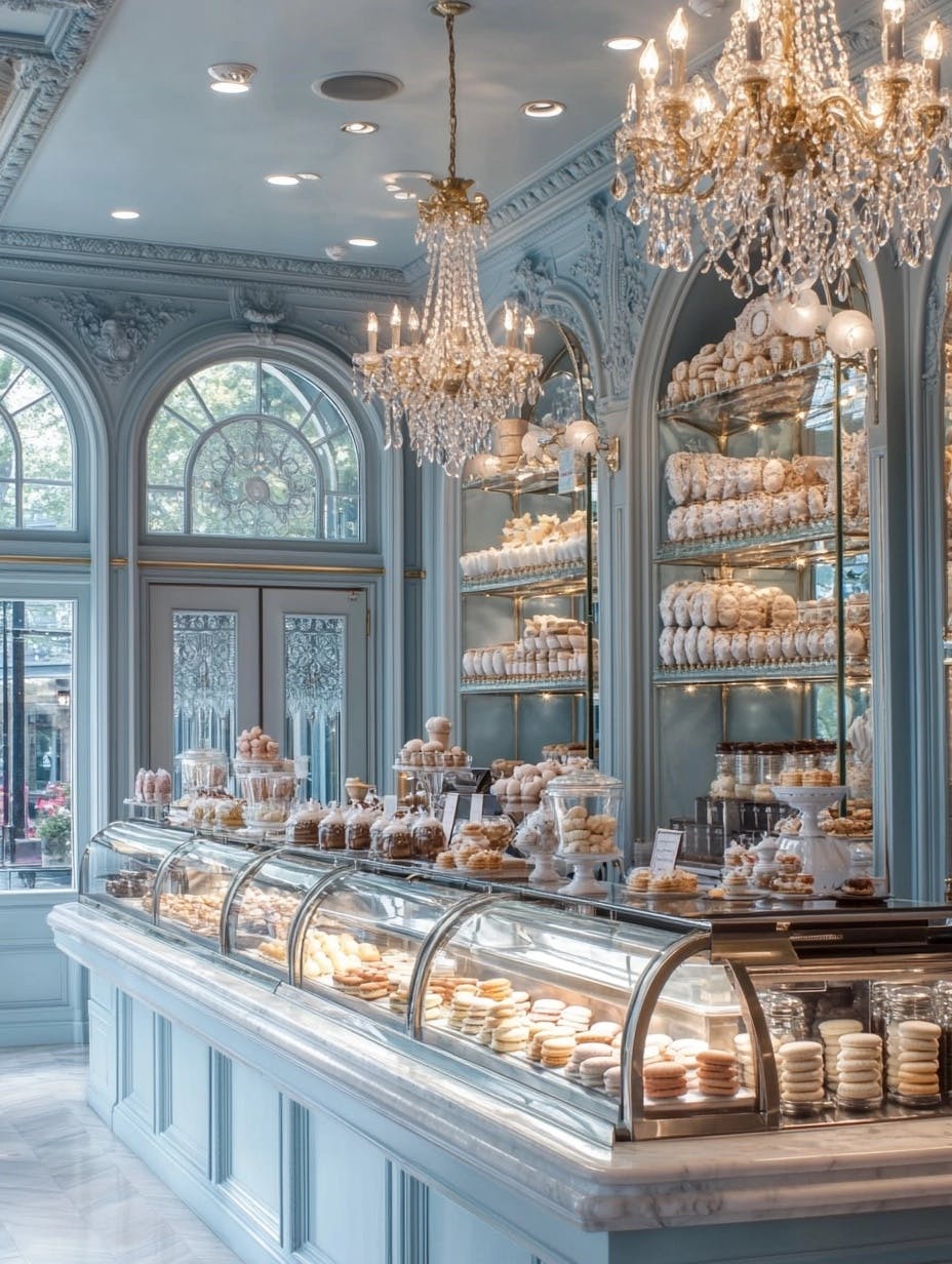 Elegant French patisserie, ornate Rococo-style interior, pastel blue walls with intricate moldings, marble countertops with a polished finish, glass display cases filled with macarons and pastries, crystal chandeliers hanging from the ceiling, soft natural light streaming through tall arched windows, delicate shelving showcasing jars and desserts, luxurious and inviting atmosphere, high-definition details, soft and warm tones, timeless sophistication. --chaos 10 --ar 3:4 --stylize 150 --v 6.1