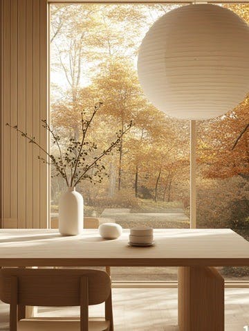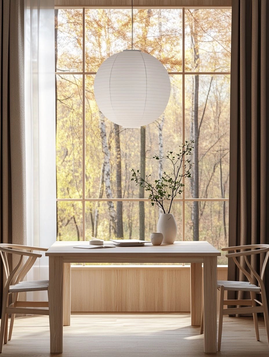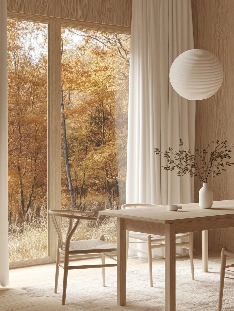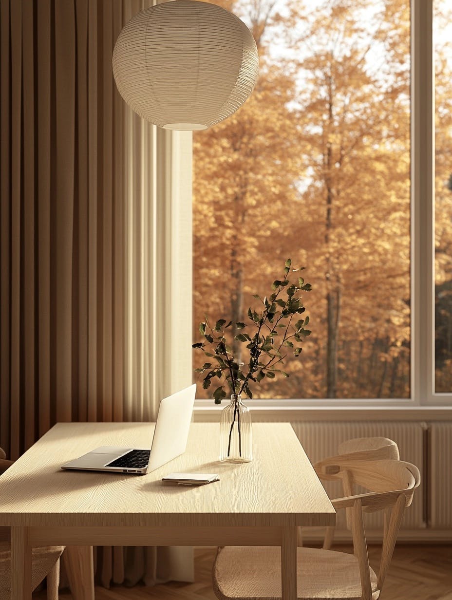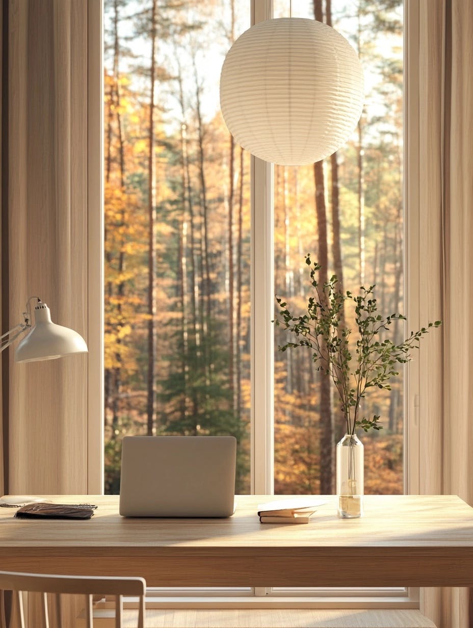 Warm, minimalist workspace with mid-century modern aesthetics, light wood panel walls, large window with autumn forest view, simple rectangular wooden table, sleek wooden chairs, white table lamp, vase with green stems for a natural touch, soft warm lighting, paper lantern overhead, calm and cozy ambiance, neutral color palette, clean lines, Scandinavian-inspired design, uncluttered and functional setup, inviting and serene atmosphere. --chaos 10 --ar 3:4 --v 6.1