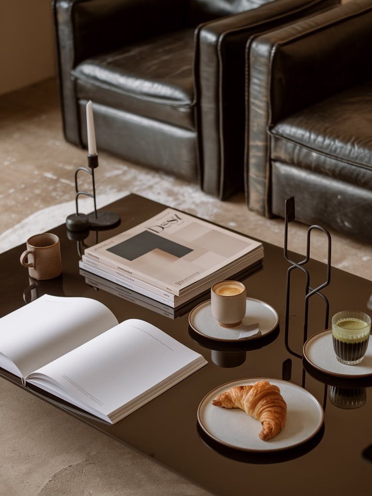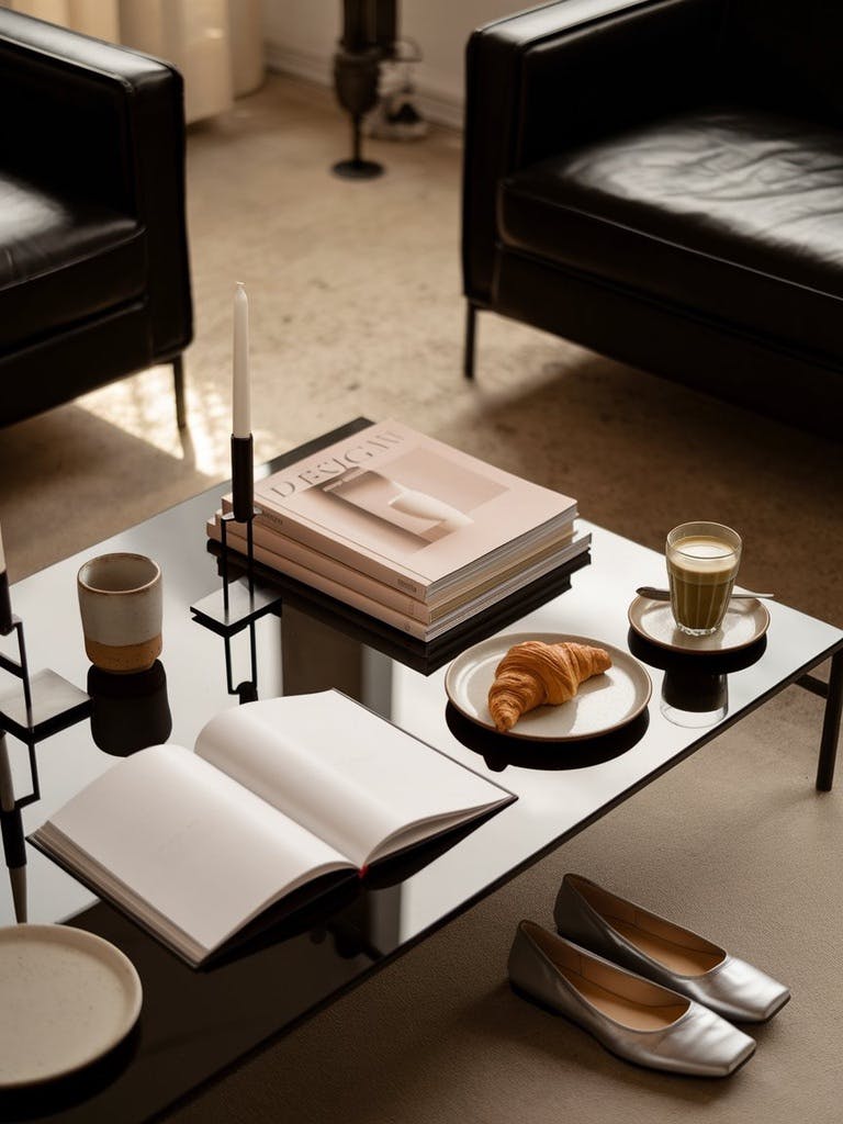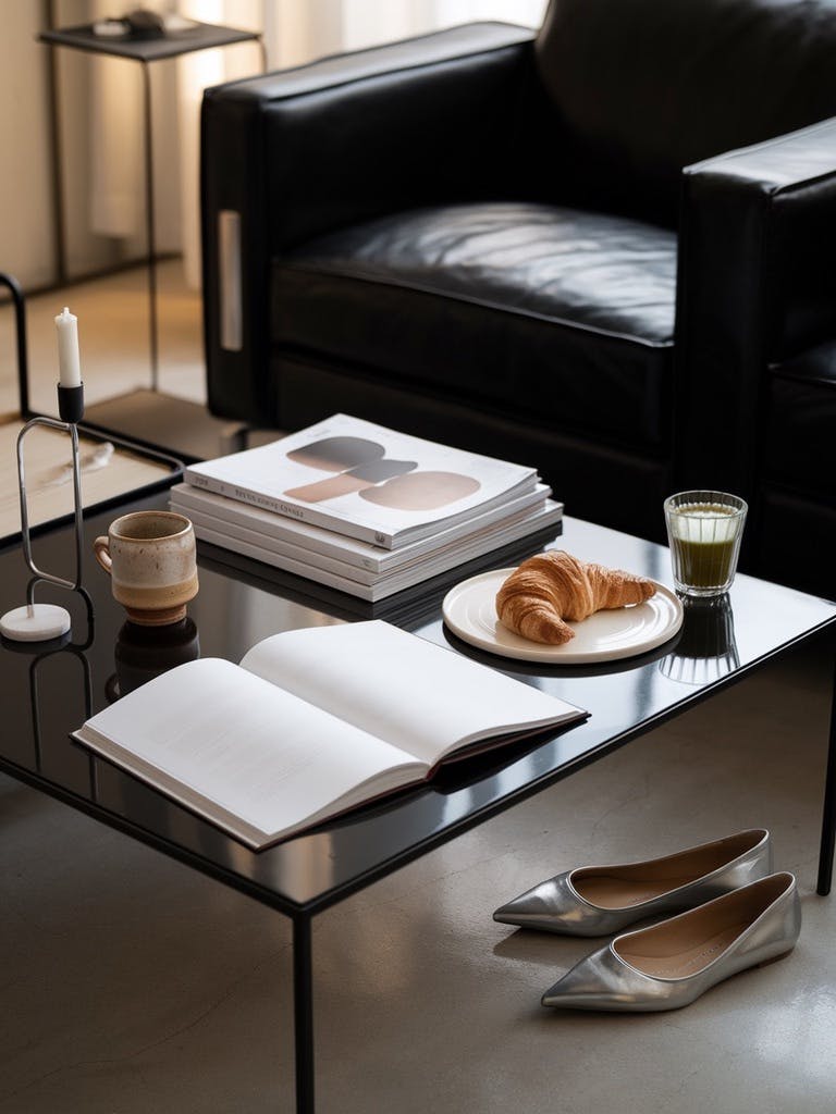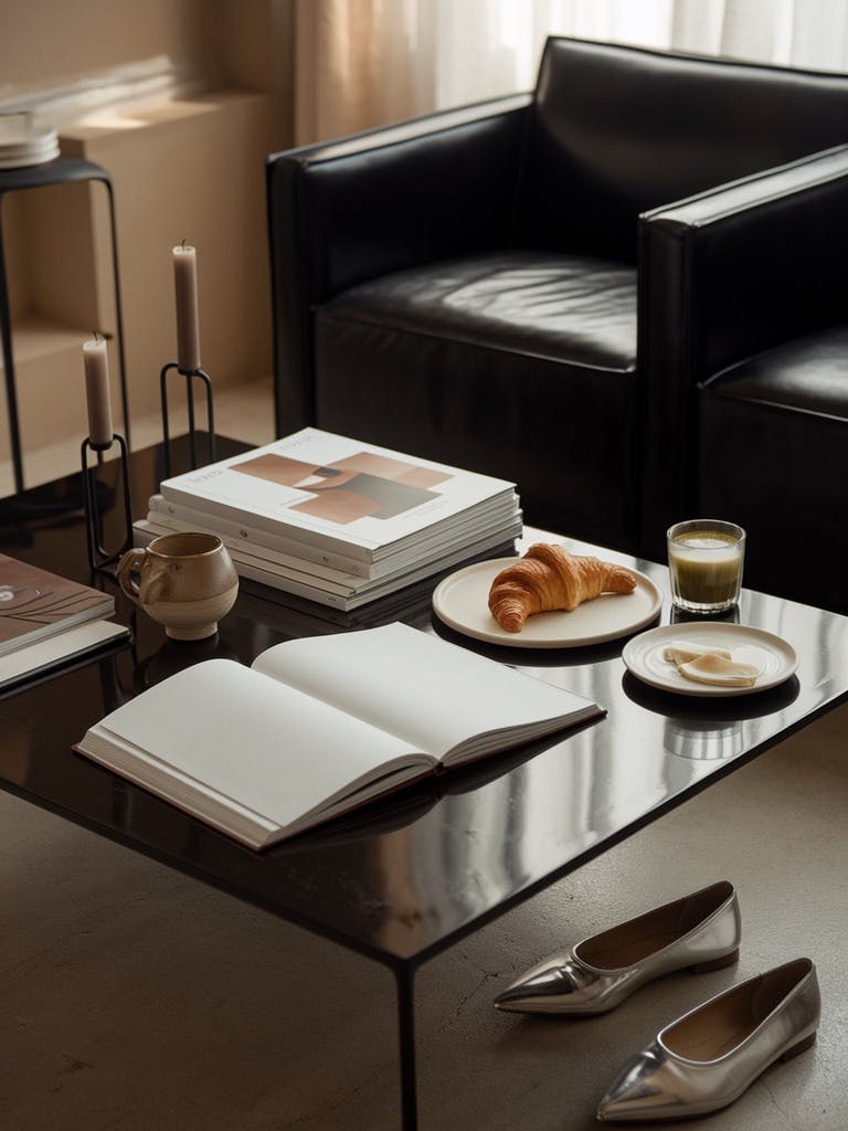 Minimalist coffee table setup, dark glossy surface, ceramic mug, open book with blank pages, stack of neutral-toned design magazines, croissant and espresso on white plates, glass of matcha, sleek modern candlestick holder, soft natural lighting, black leather furniture in the background, silver ballet flats, concrete floor, cozy and quiet ambiance, neutral earthy tones, warm and relaxing atmosphere