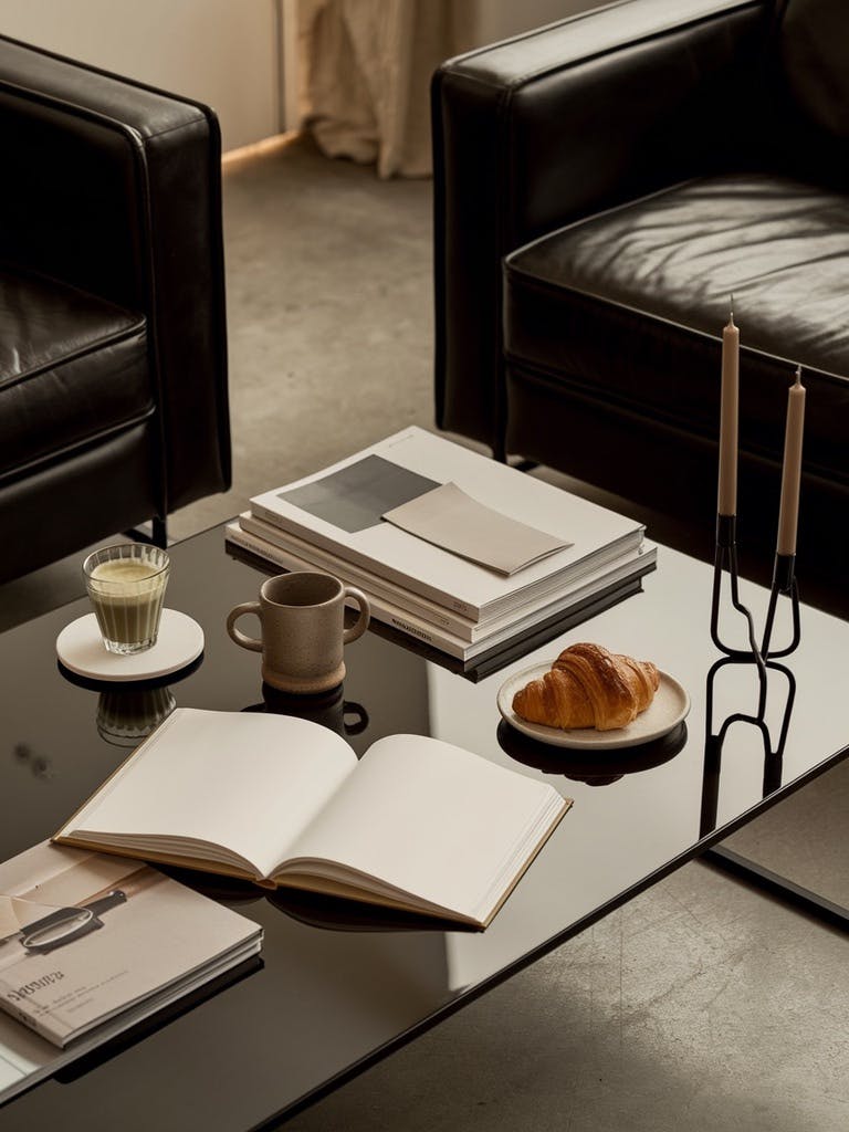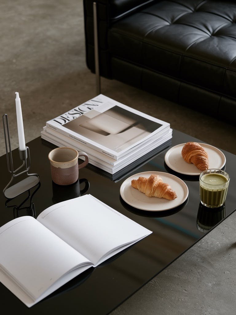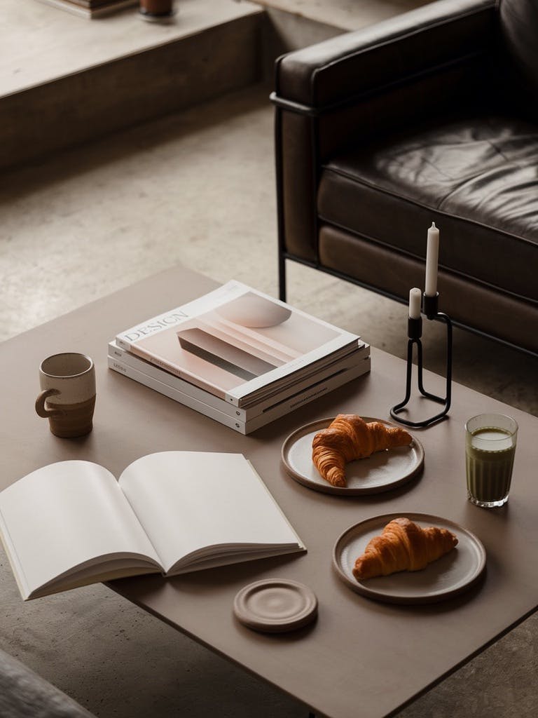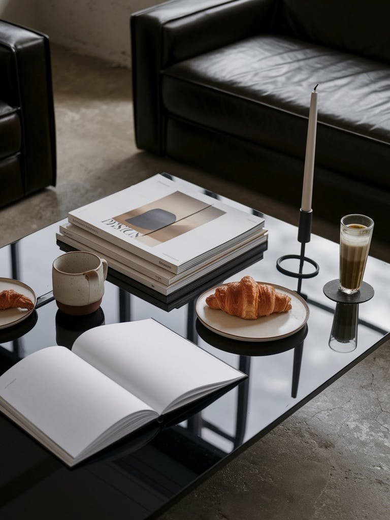Minimalist coffee table setup, dark glossy surface, ceramic mug, open book with blank pages, stack of neutral-toned design magazines, croissant and espresso on white plates, glass of matcha, sleek modern candlestick holder, soft natural lighting, black leather furniture in the background, silver ballet flats, concrete floor, cozy and quiet ambiance, neutral earthy tones, warm and relaxing atmosphere