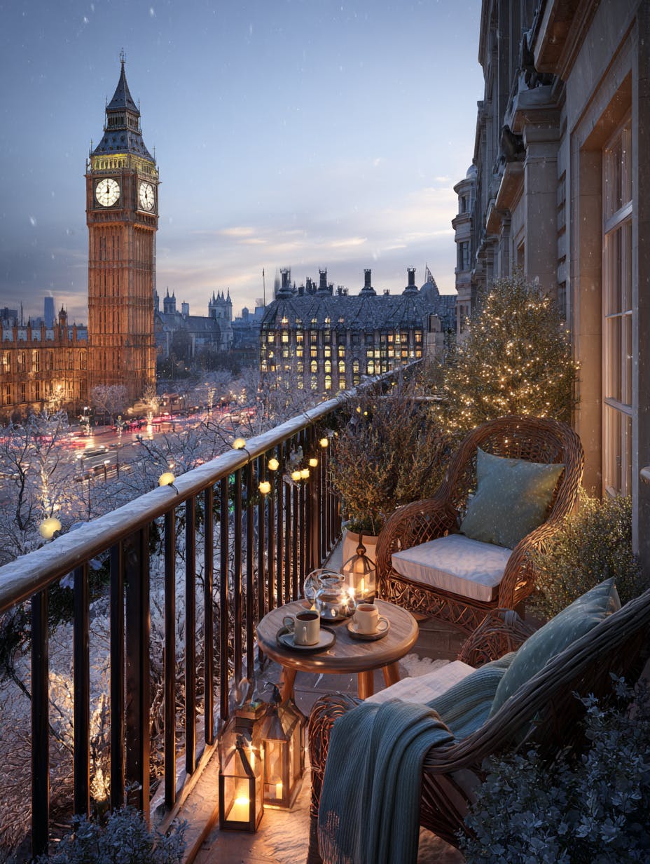 Christmas balcony overlooking Big Ben, winter evening in London, cozy festive setup, elegant outdoor furniture with cushions, warm fairy lights on Christmas tree, snow-covered plants and railing, hot tea and candles on a small round table, classic Victorian architecture, soft snowfall, twilight blue sky, glowing lanterns, peaceful and romantic holiday atmosphere, magical city view, high-detail realism, cinematic lighting, warm tones