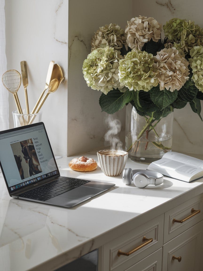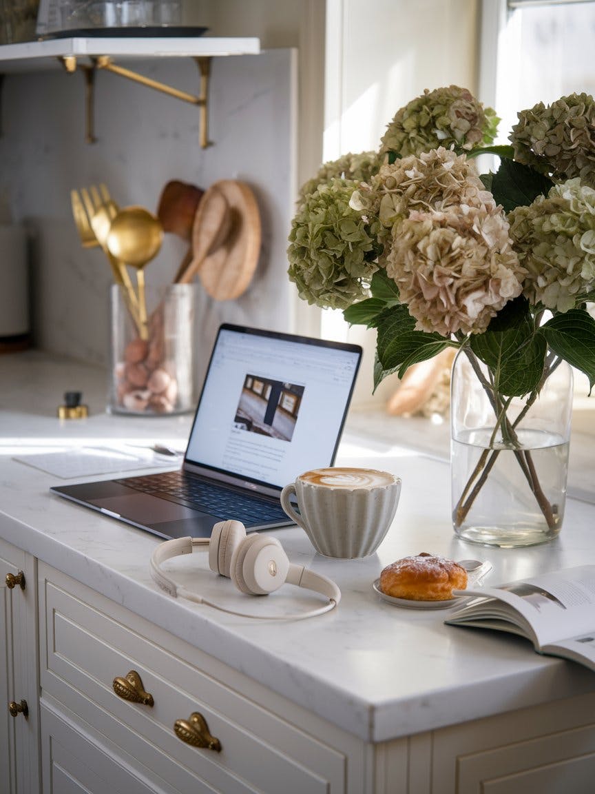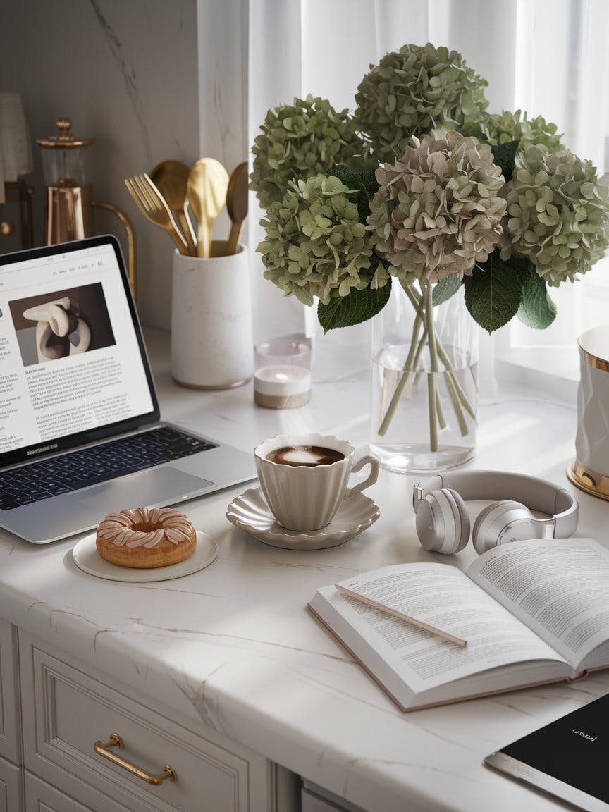 A cozy and elegant kitchen countertop scene, soft morning light, white marble surface with subtle veining, an open laptop displaying an art article, a steaming cup of coffee in a scalloped ceramic cup with a pastry on the side, an open book, wireless headphones resting nearby, a clear vase filled with lush hydrangea blooms in shades of green and beige, gold accents on kitchen utensils, minimalistic and luxurious aesthetic, serene and productive ambiance.