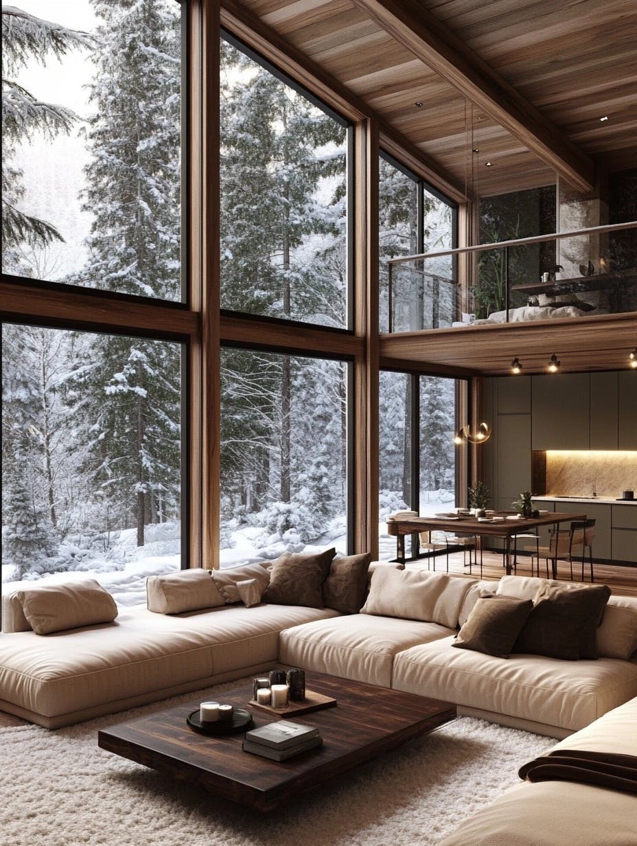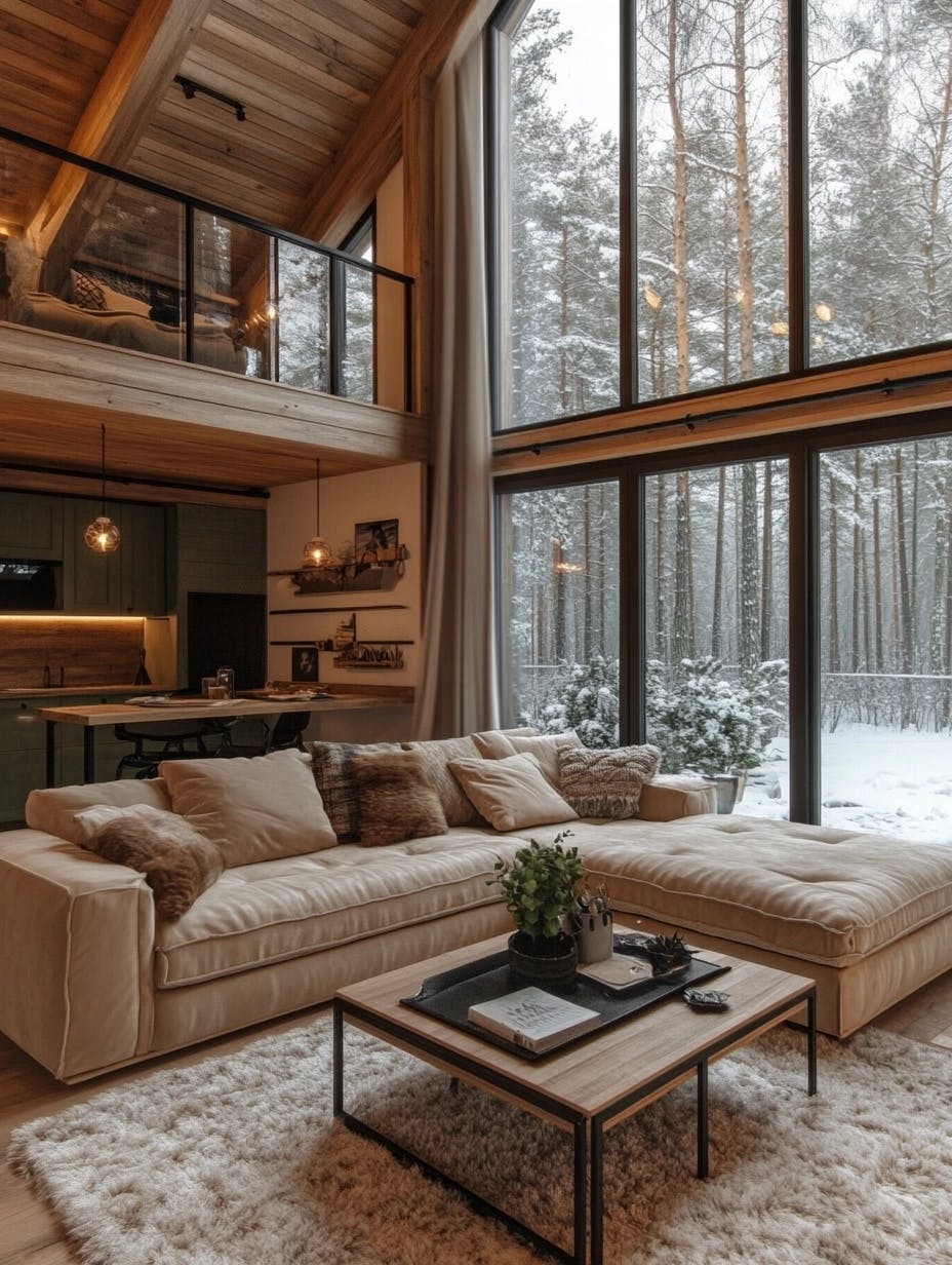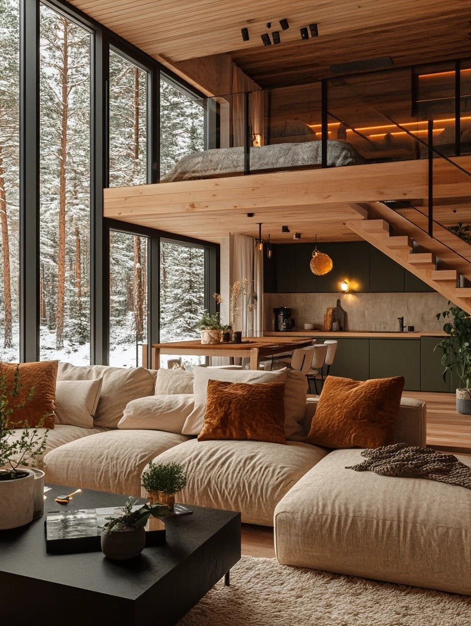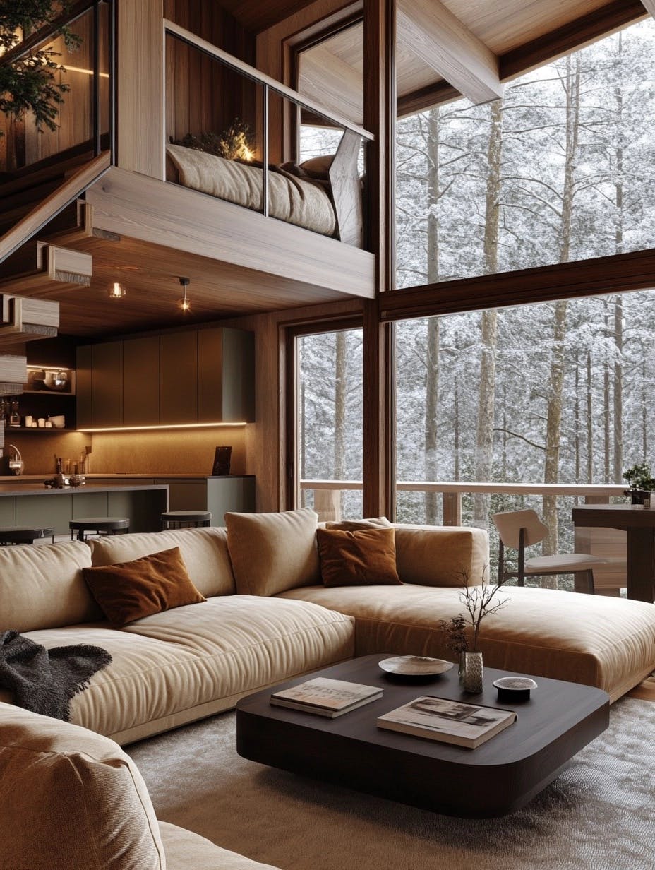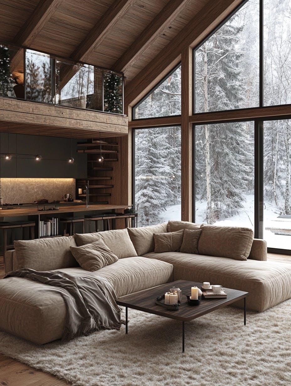 aesthetic, modern, A cozy modern cabin interior with high vaulted wooden ceilings, large floor-to-ceiling windows overlooking a winter forest, open-concept living space with a lofted bedroom, sleek wooden staircase leading to the upper level, minimalistic decor, neutral color palette of beige and brown tones, dark wood floors, L-shaped beige sofa with plush cushions, dark wood coffee table, soft textured rug, small plants on the table, modern kitchen with white and dark green cabinetry, stainless steel appliances, kitchen island with barstools, warm ambient lighting, stylish workspace with a sleek desk and chair tucked under the staircase. --chaos 10 --ar 3:4 --stylize 200 --v 6.1