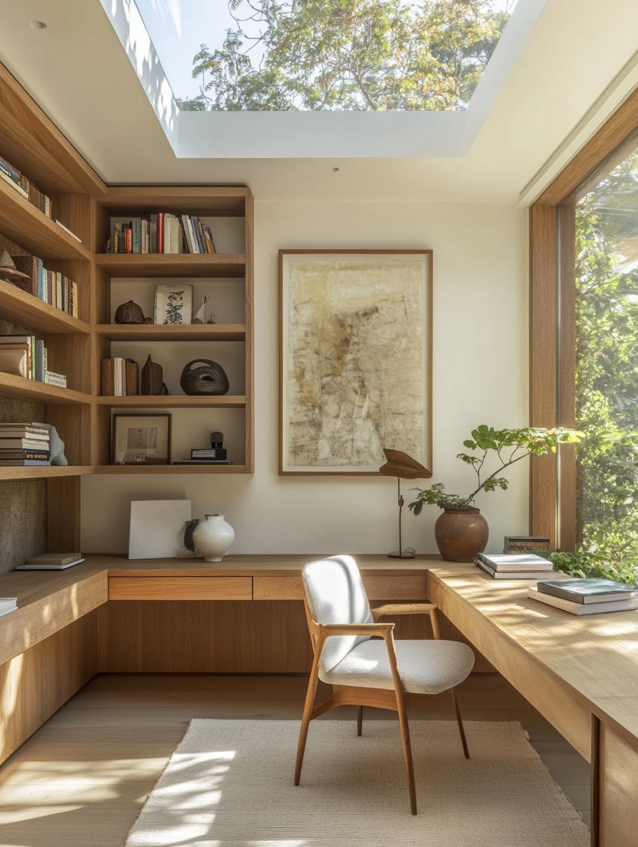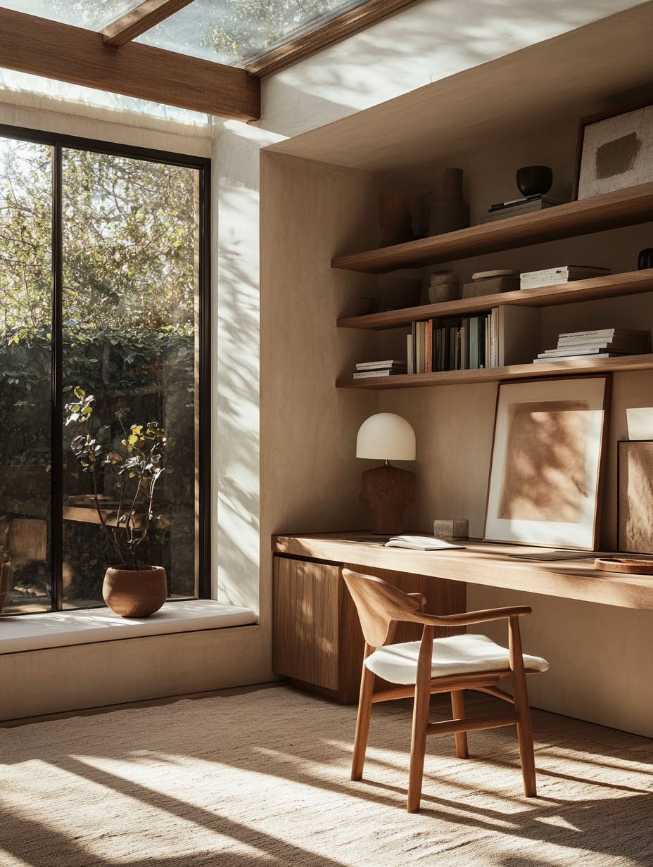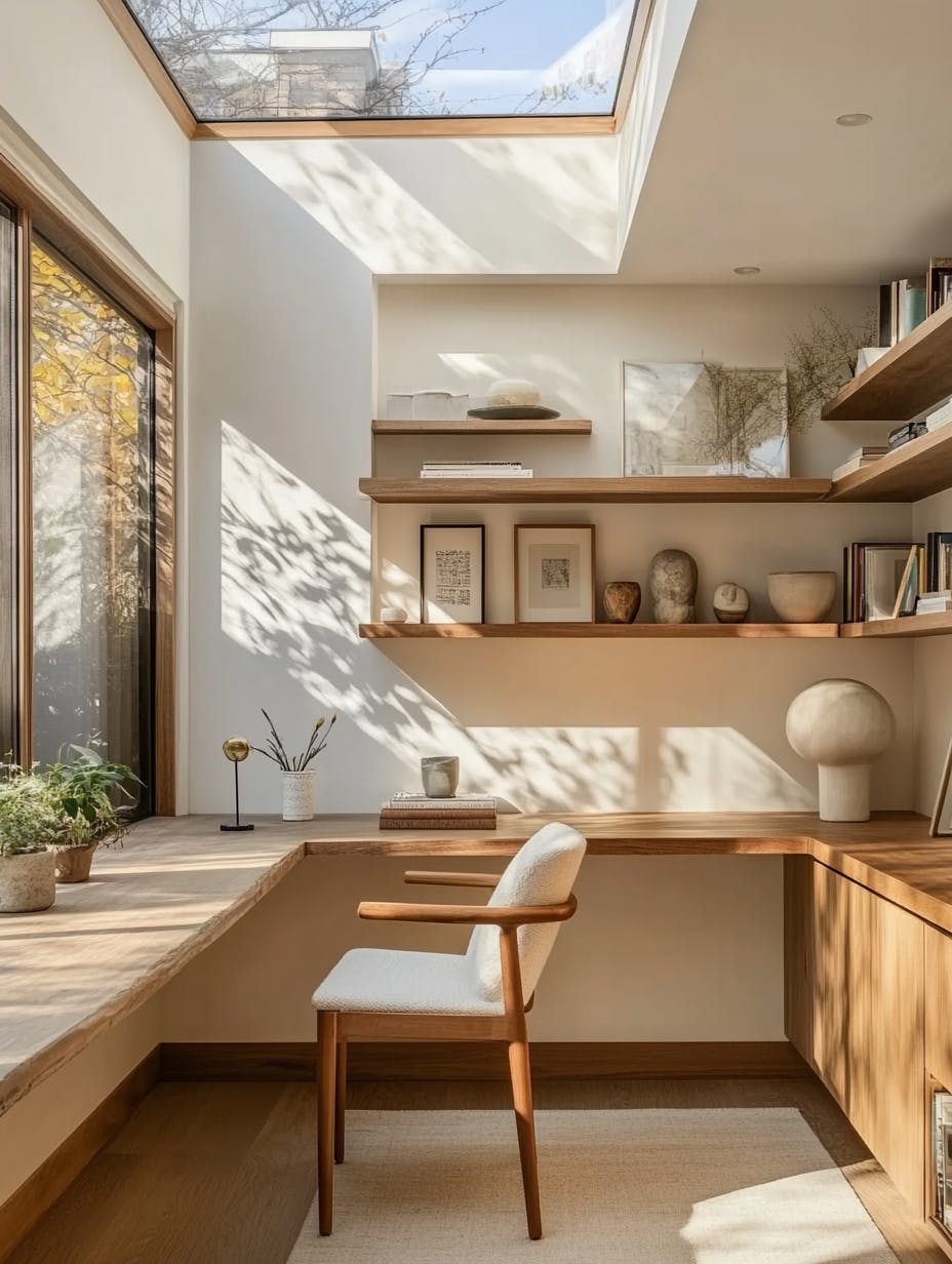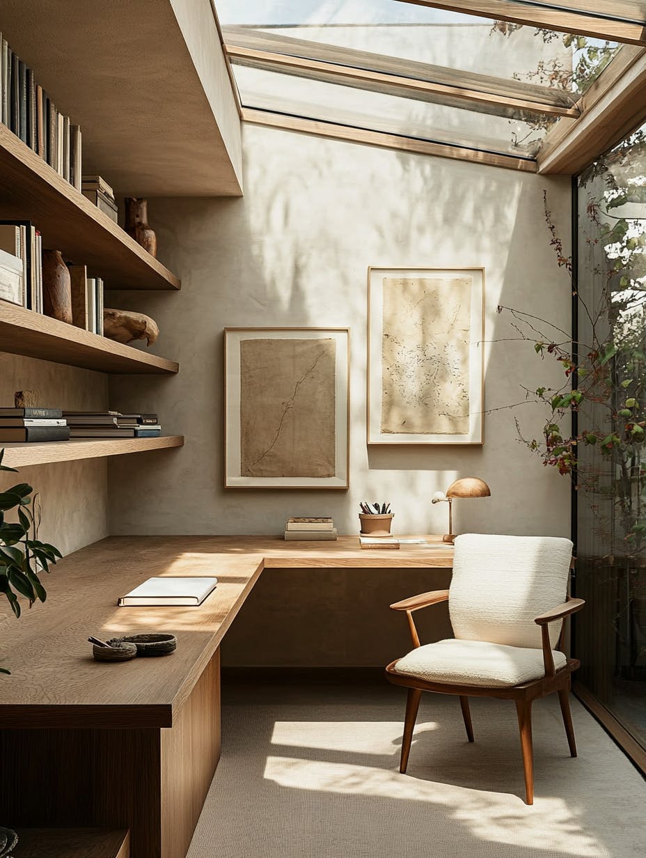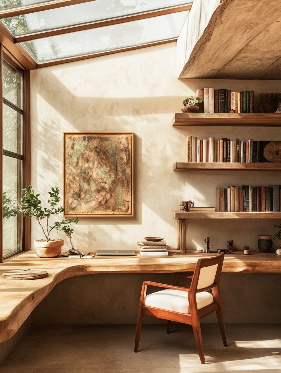 A cozy, sunlit home office with a minimalist and organic design, featuring a large skylight and floor-to-ceiling windows that allow natural light to stream in. A built-in wooden desk extends along the wall, complemented by a mid-century modern wooden chair with a white cushion. Floating wooden shelves filled with neatly arranged books and decorative pieces add warmth and texture. Earthy tones, soft shadows, and natural materials like wood, stone, and linen create a tranquil and inspiring workspace. Potted plants on the windowsill and desk bring a touch of greenery, while abstract artwork and a rustic framed painting add artistic charm. A peaceful and harmonious environment, perfect for creative work and reading. --ar 3:4