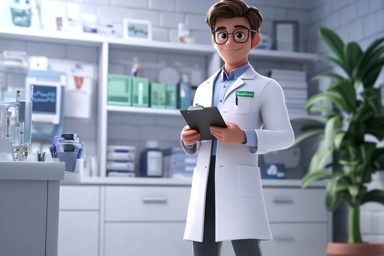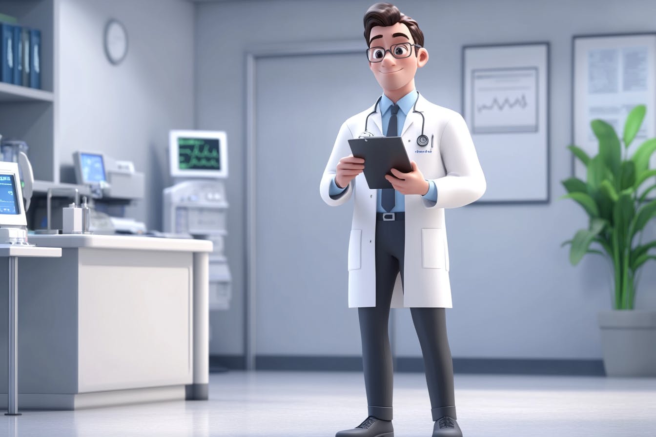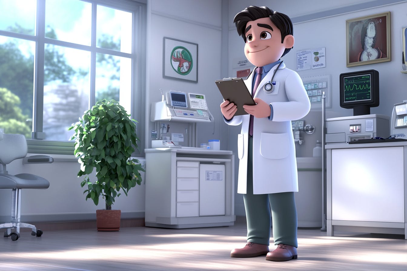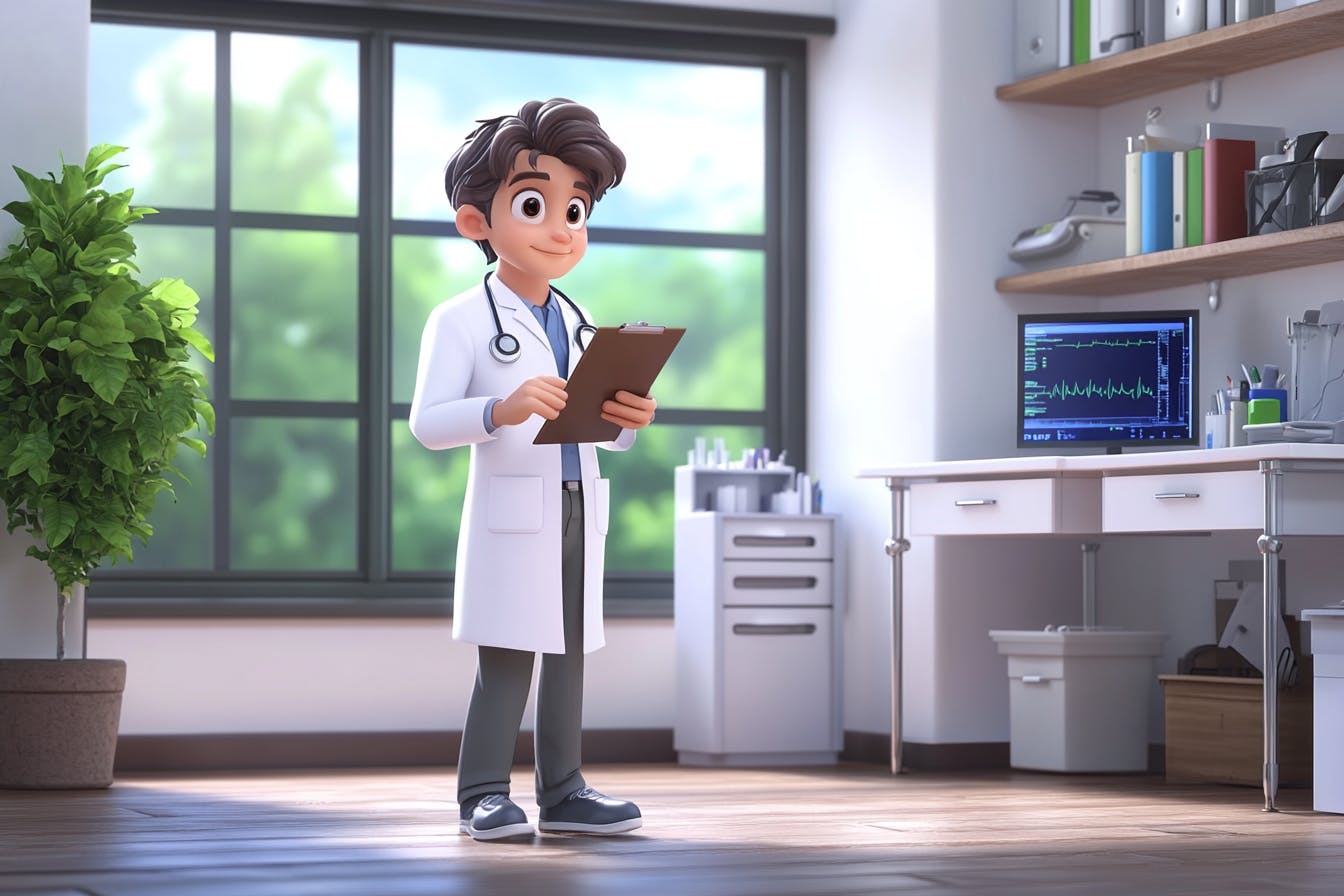 illustration, cartoon, style of A modern health clinic with white walls, sleek medical equipment, and a green plant in the corner, featuring a doctor in a white coat holding a clipboard, warm natural lighting, minimalistic decor, clean and professional atmosphere. --sref 2700920344