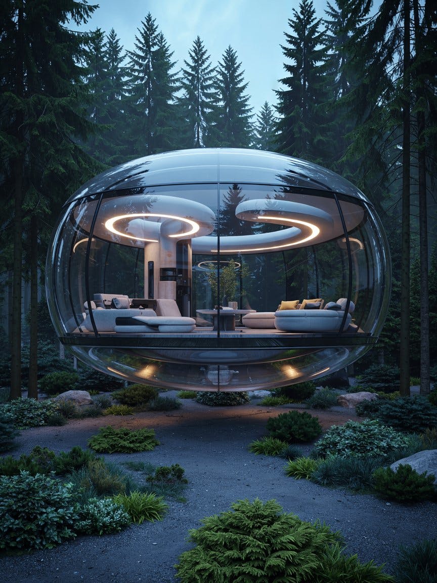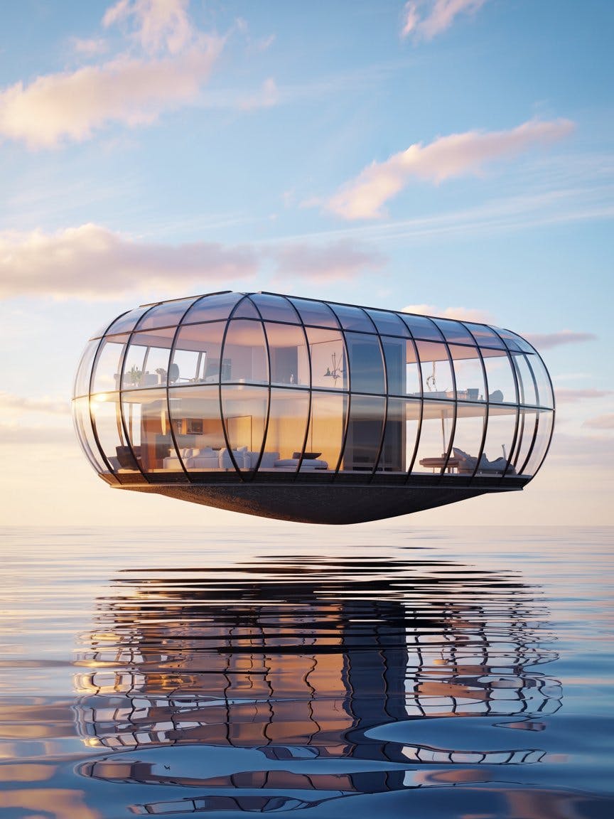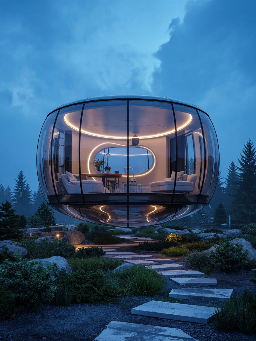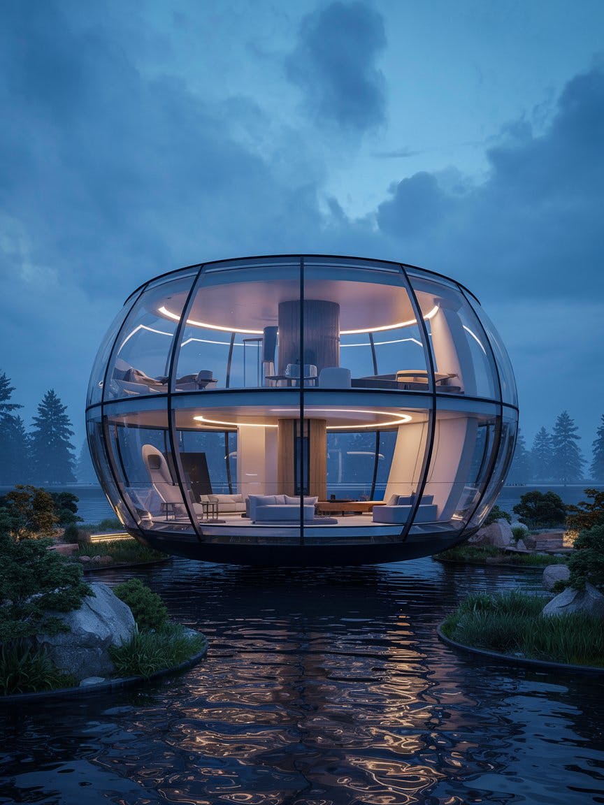 A floating house with transparent curved glass covering the entire outer wall, the bottom is not in contact with the ground and is floating in the air with translucent material, the interior of the building is organically connected by round movement, and the smart lighting system adjusts the light as it moves