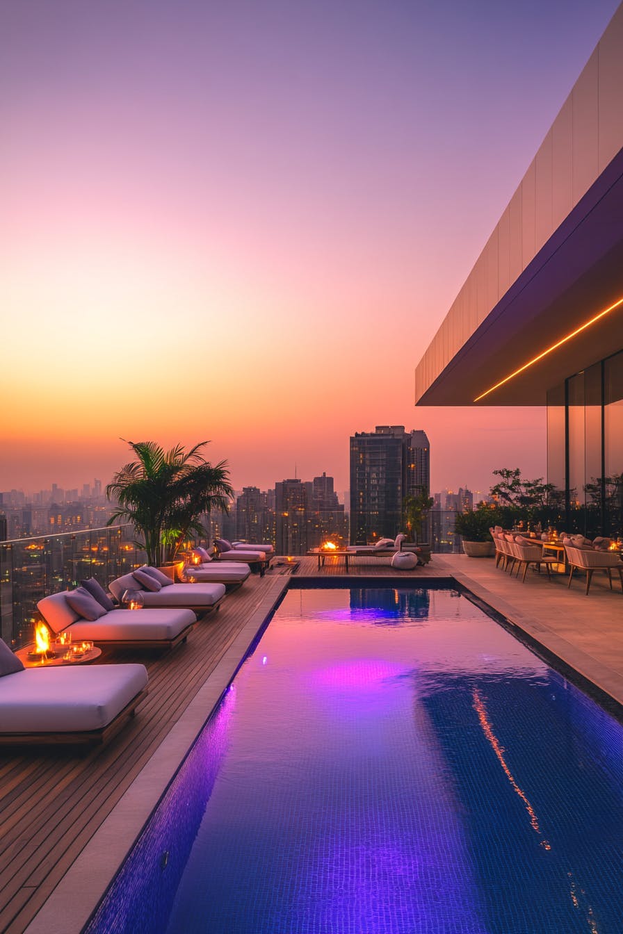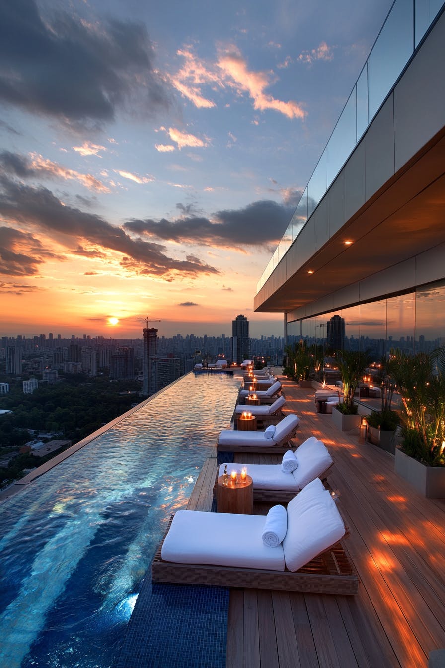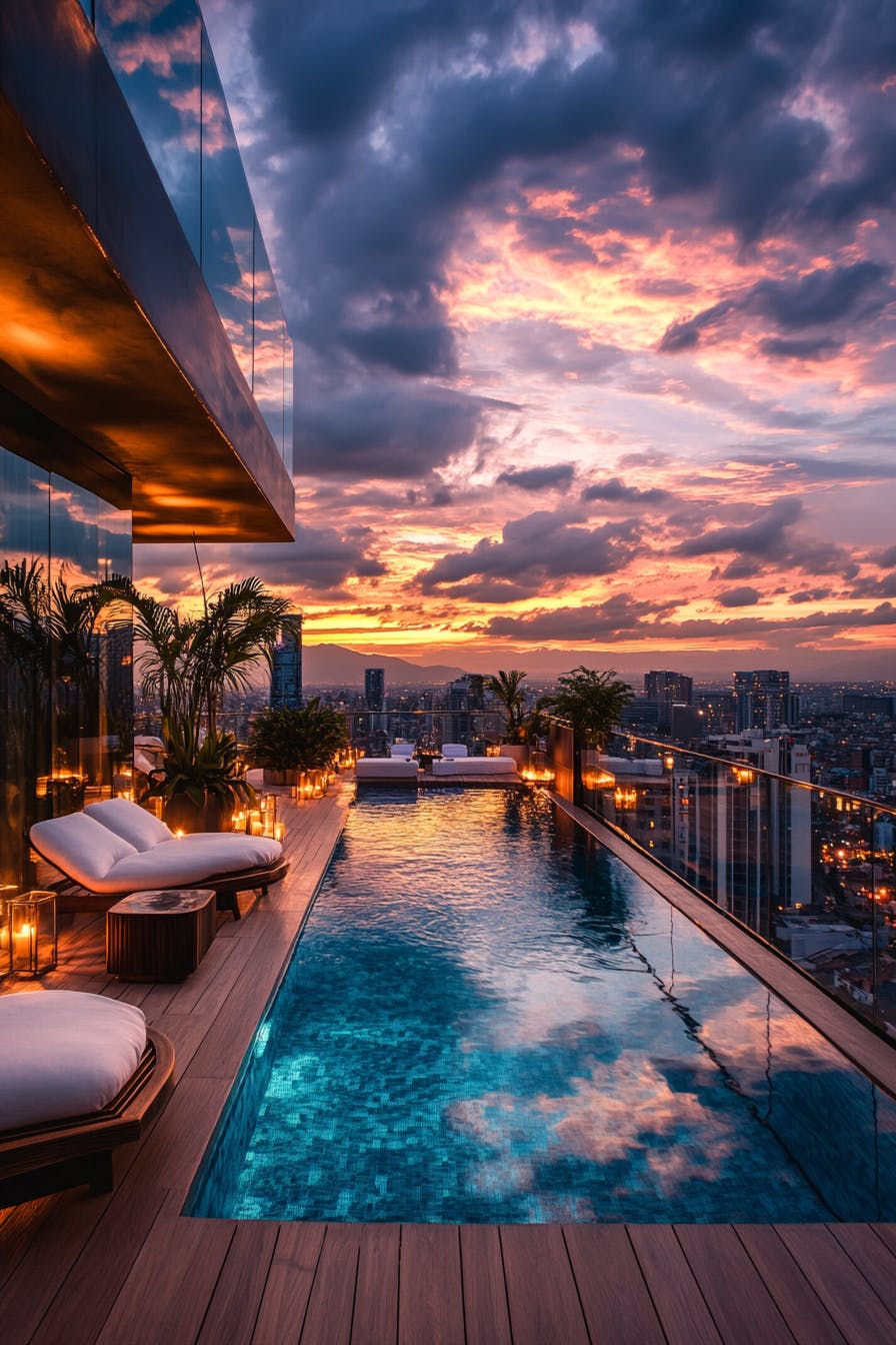 A luxurious rooftop pool area, infinity pool overlooking a stunning city skyline at sunset, modern glass railings, ambient LED lighting, plush lounge chairs with white cushions, sleek wooden deck, fire pits creating a cozy atmosphere, elegant cocktail tables with glowing candles, lush greenery and potted palm trees, warm golden reflections on the water, high-end resort ambiance, cinematic lighting, ultra-HD details, breathtaking panoramic view --ar 3:2