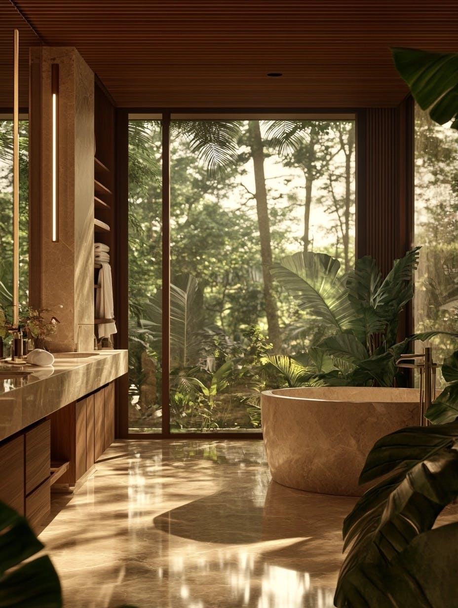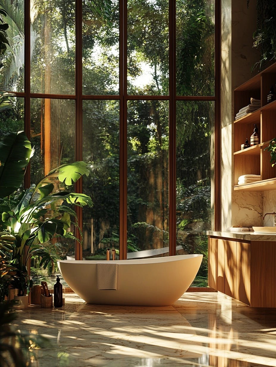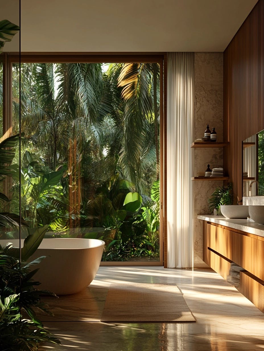 Luxury bathroom immersed in nature, floor-to-ceiling windows revealing a tropical jungle, sunlight streaming through leaves, marble floors with organic veins, modern freestanding bathtub with sleek curves, wooden cabinetry with open shelving, soft ambient lighting, large tropical plants filtering the light, serene and spa-like atmosphere, a balance of modern design and natural tranquility, high-end minimalist aesthetic --chaos 10 --ar 3:4 --stylize 200 --v 6.1