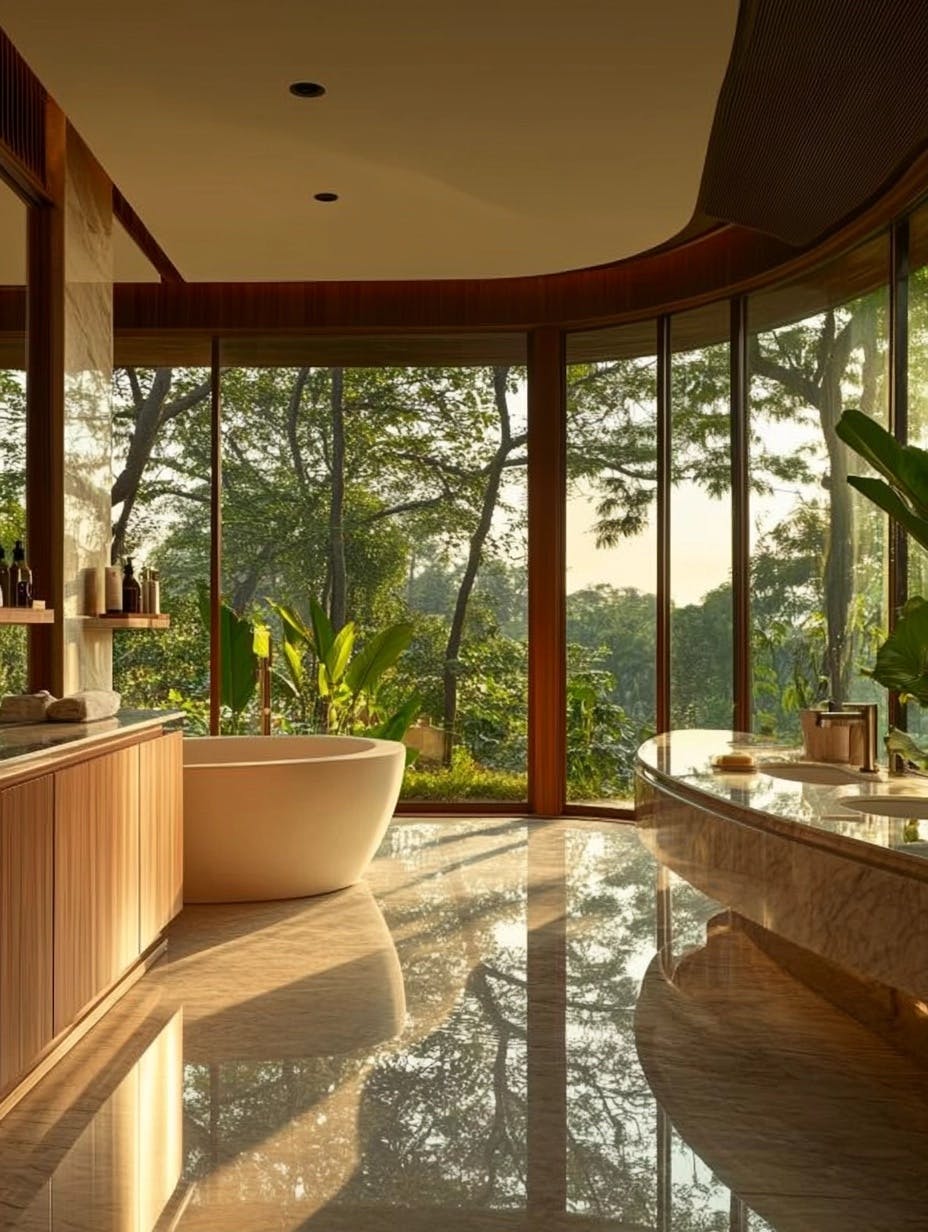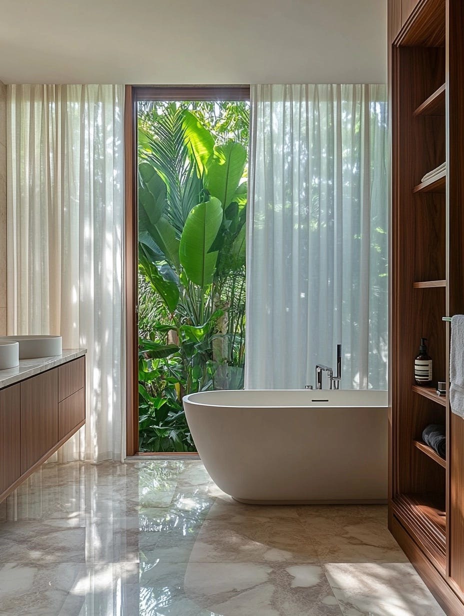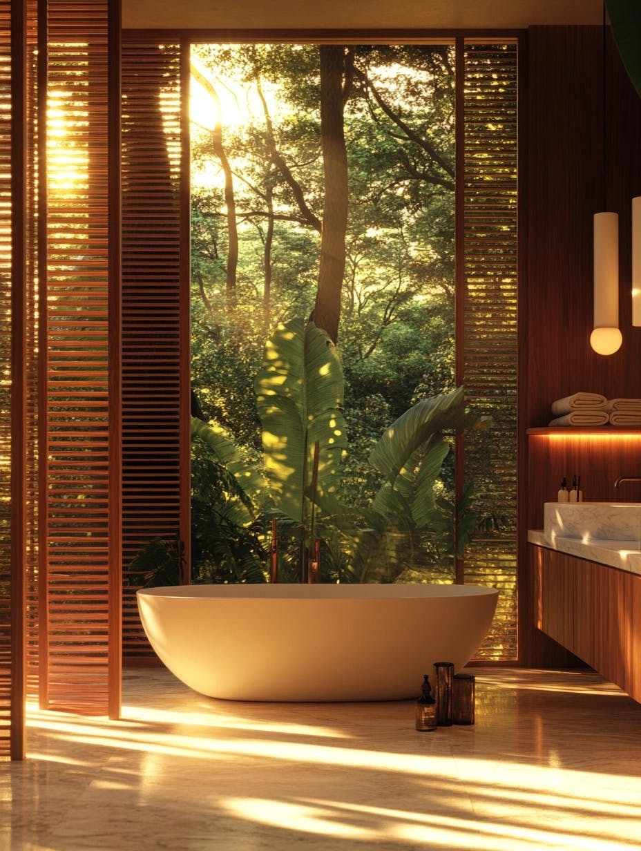 Luxury bathroom immersed in nature, floor-to-ceiling windows revealing a tropical jungle, sunlight streaming through leaves, marble floors with organic veins, modern freestanding bathtub with sleek curves, wooden cabinetry with open shelving, soft ambient lighting, large tropical plants filtering the light, serene and spa-like atmosphere, a balance of modern design and natural tranquility, high-end minimalist aesthetic --chaos 10 --ar 3:4 --stylize 200 --v 6.1