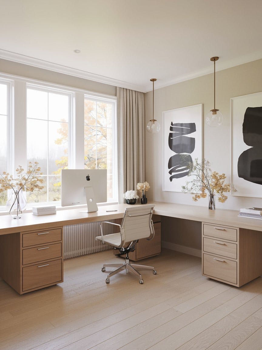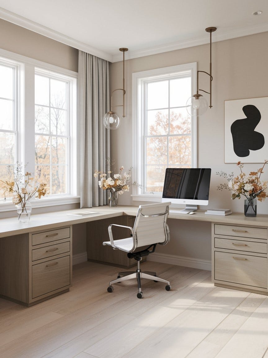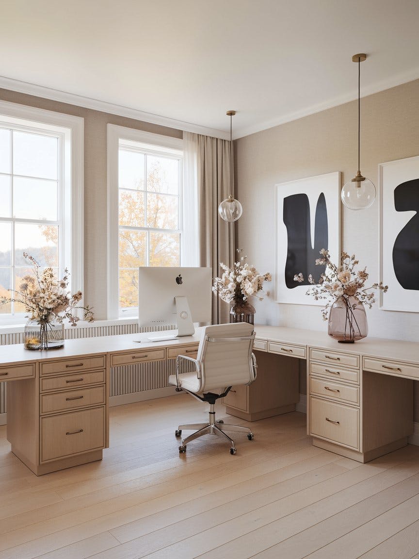 A serene, modern home office with a minimalist design, featuring a spacious L-shaped wooden desk with elegant drawers, a comfortable white swivel chair, and a sleek computer setup. Large windows allow natural light to flood the space, offering a scenic view of the autumn trees outside. The neutral-toned walls are adorned with abstract black-and-white artwork, complemented by delicate floral arrangements in glass vases. Soft pendant lighting with glass globes adds warmth and sophistication, while the light hardwood flooring enhances the airy, tranquil ambiance. The perfect balance of functionality and aesthetics in a contemporary workspace.