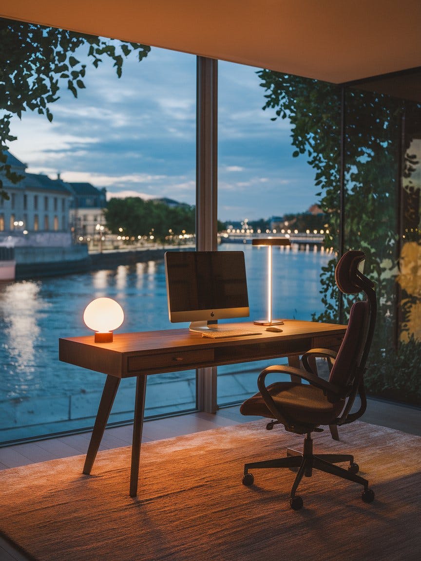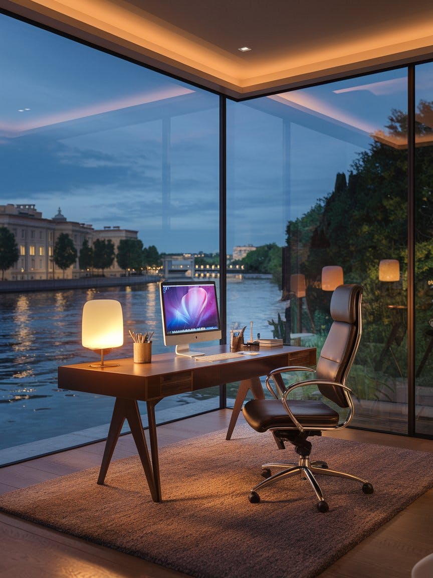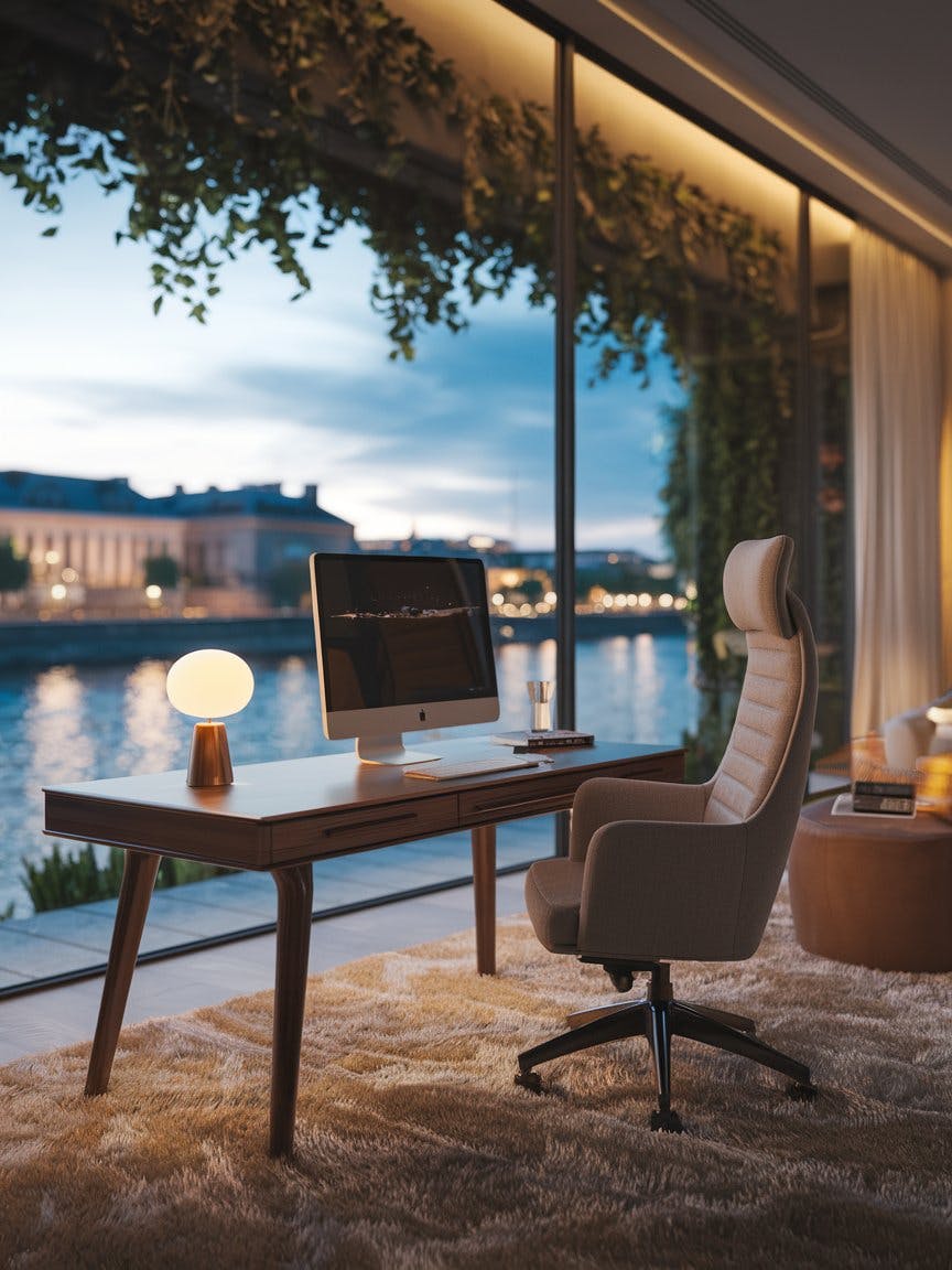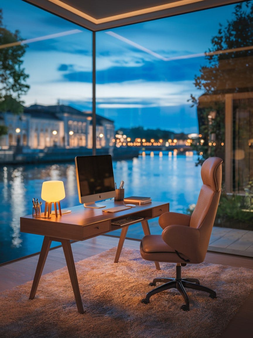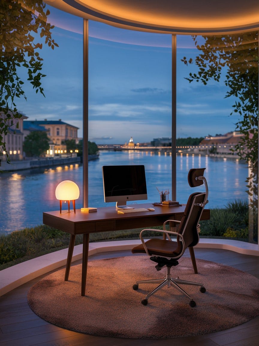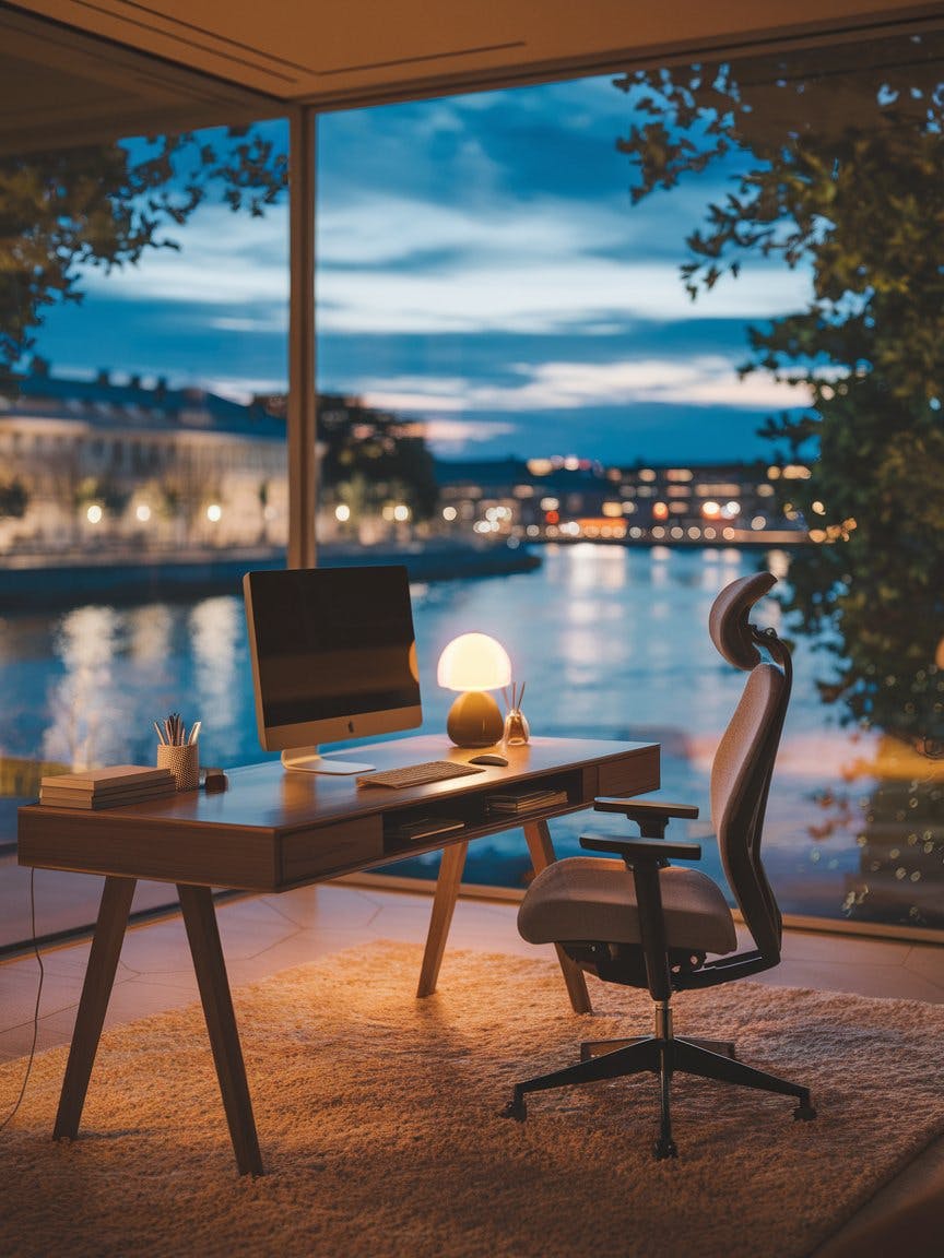 A cozy, modern home office with a stunning waterfront view at dusk, a sleek wooden desk with a computer, a warm-lit table lamp, and neatly arranged stationery, a plush ergonomic chair on a soft textured rug, floor-to-ceiling window overlooking a serene river with city lights reflecting on the water, elegant European-style buildings in the background, lush greenery framing the view, a peaceful and inspiring workspace, warm ambient lighting, high-definition details, cinematic photography.