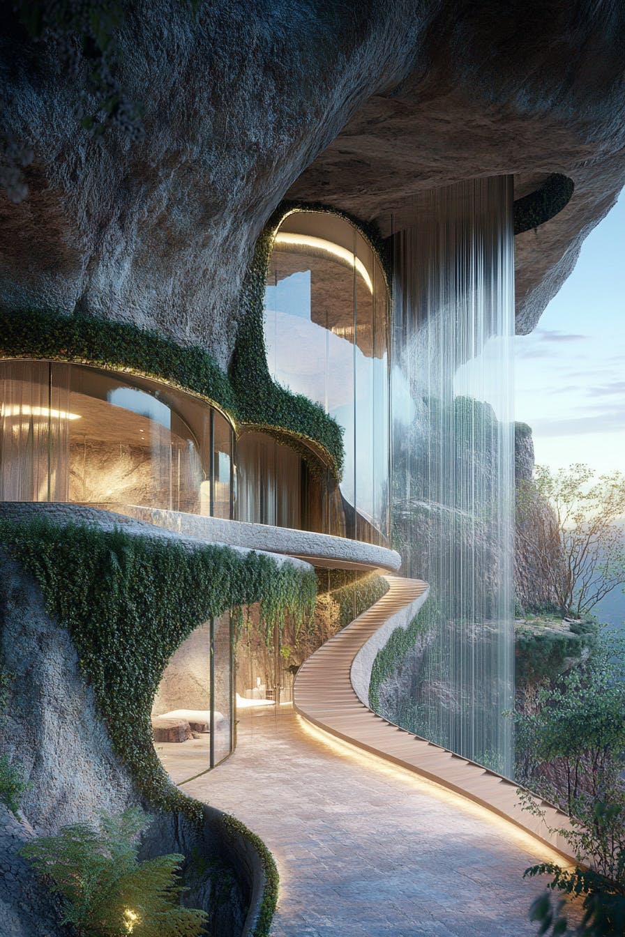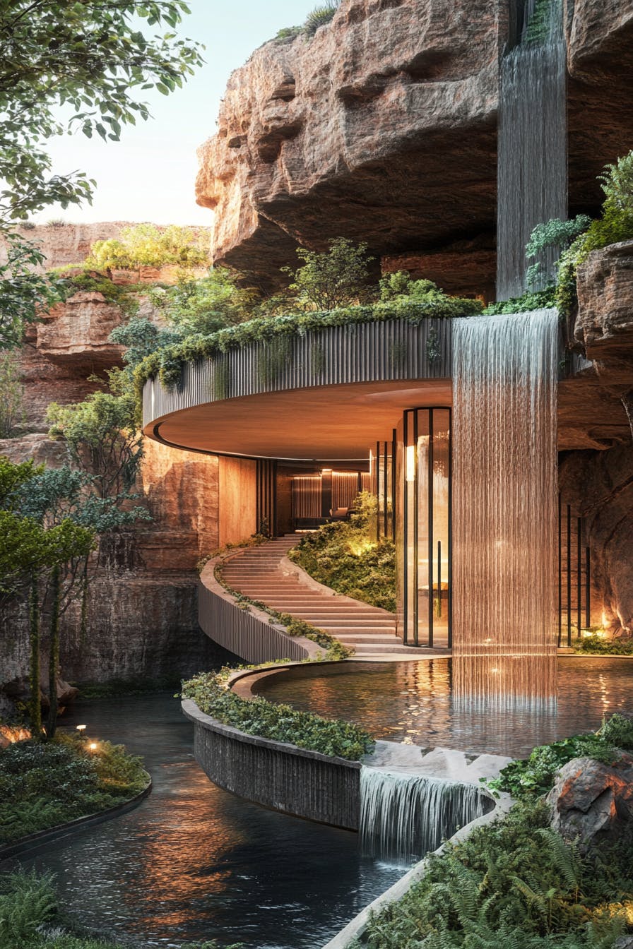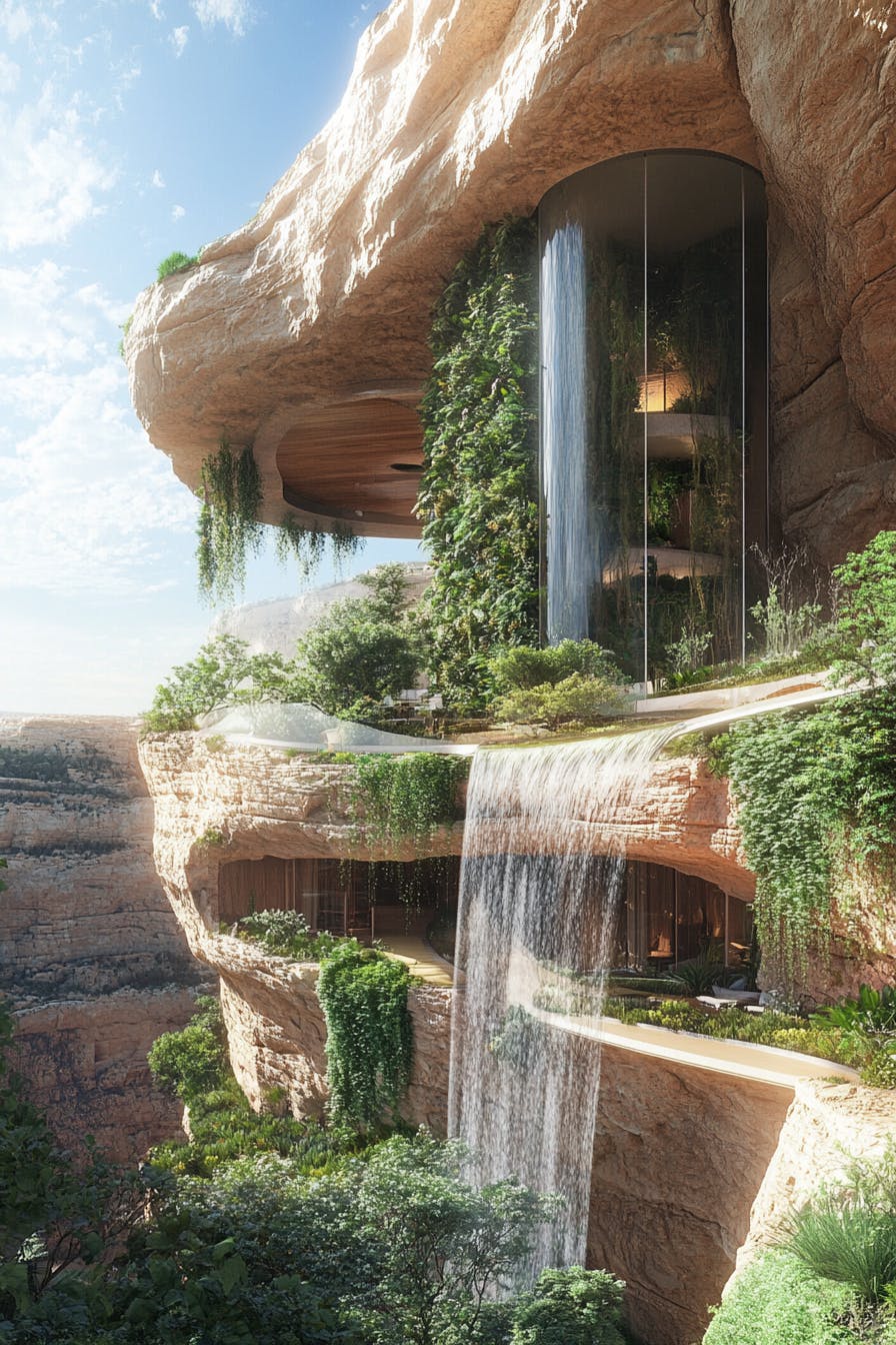 A futuristic sustainable retreat embedded into a mountainside, featuring walls made of living greenery, an AI-driven waterfall that recycles water, and curved hallways that feel like an organic part of the rock formation. The rooms have massive glass facades revealing breathtaking canyon views. --ar 2:3
