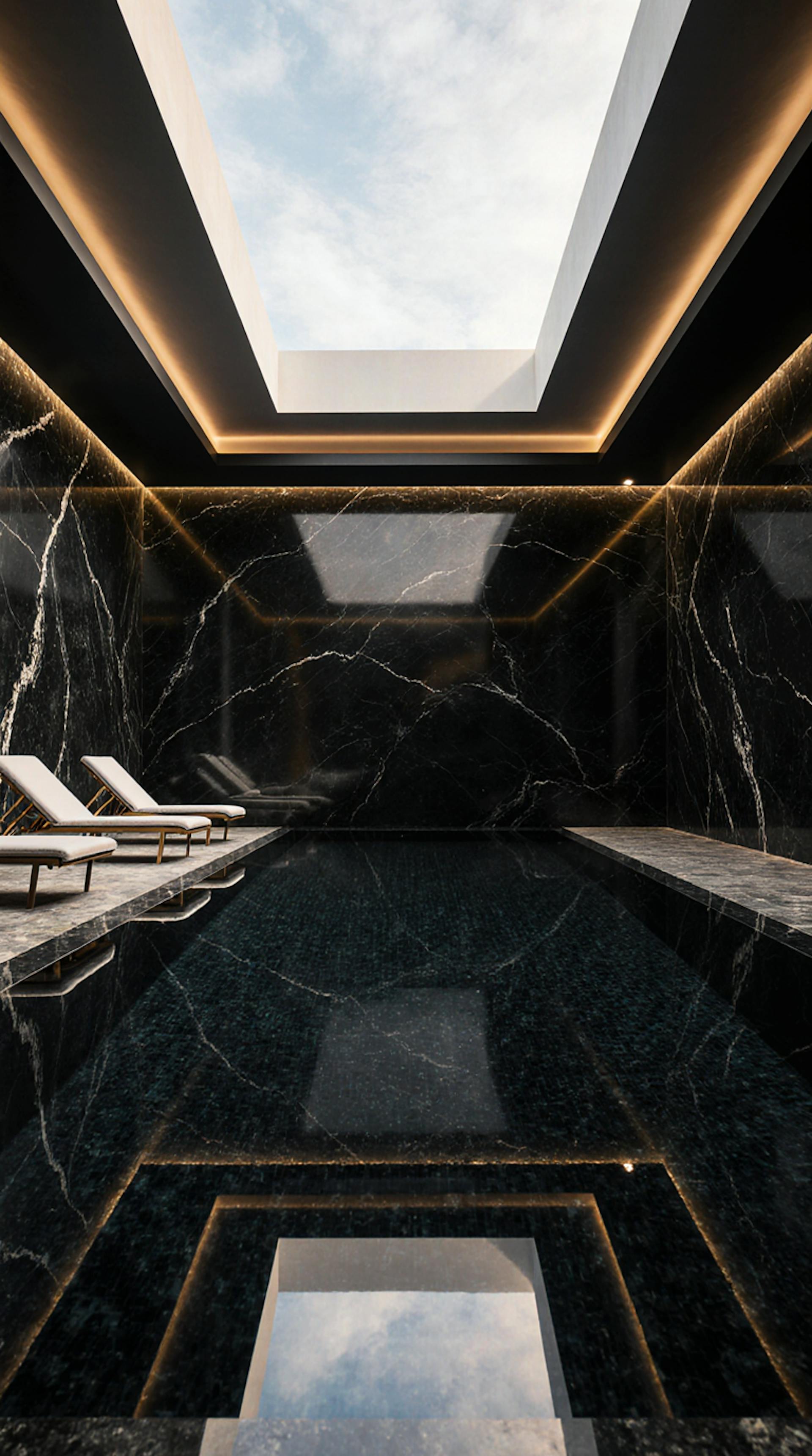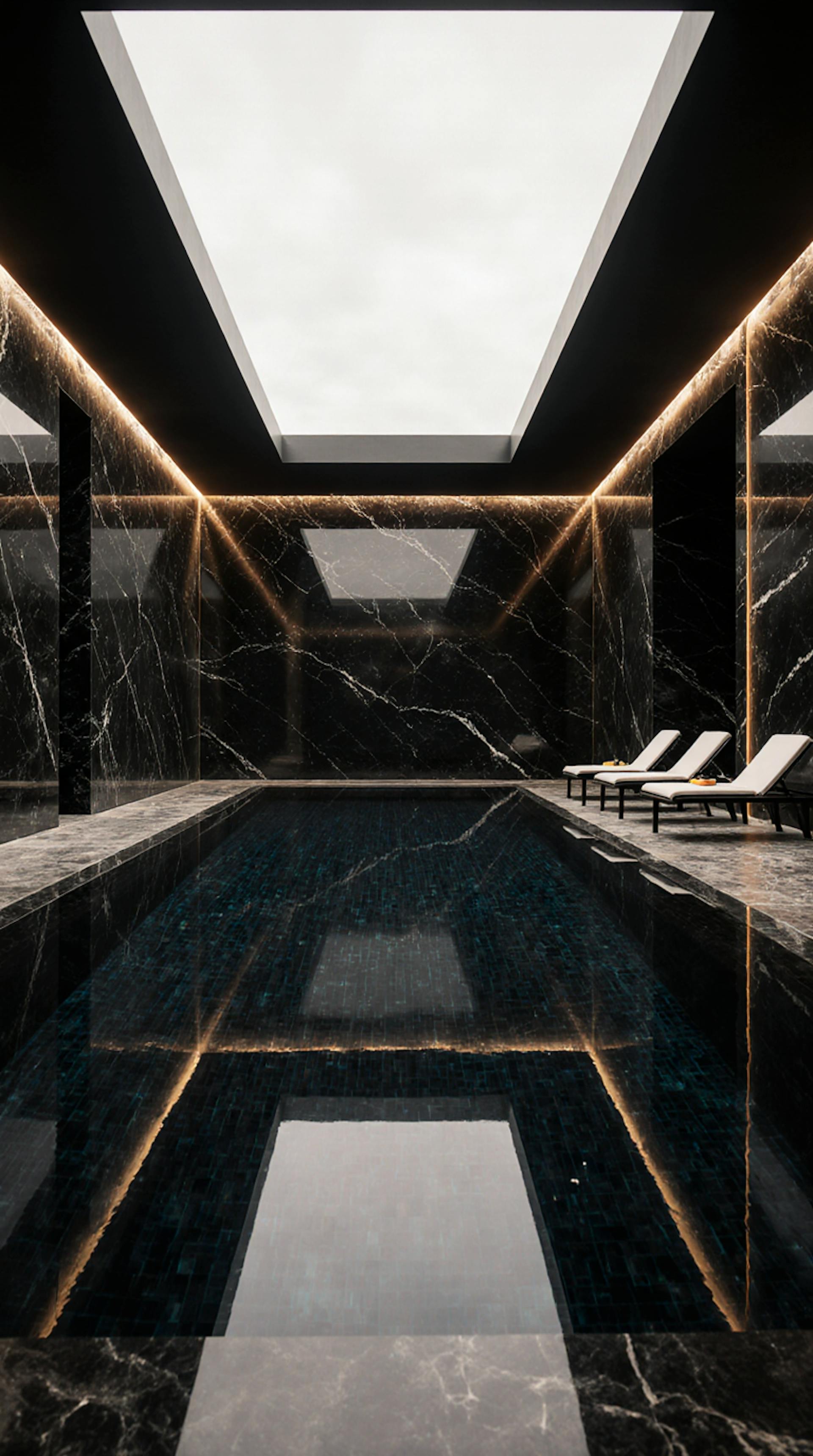 a sculptural indoor pool with black marble walls | Hyein Lee