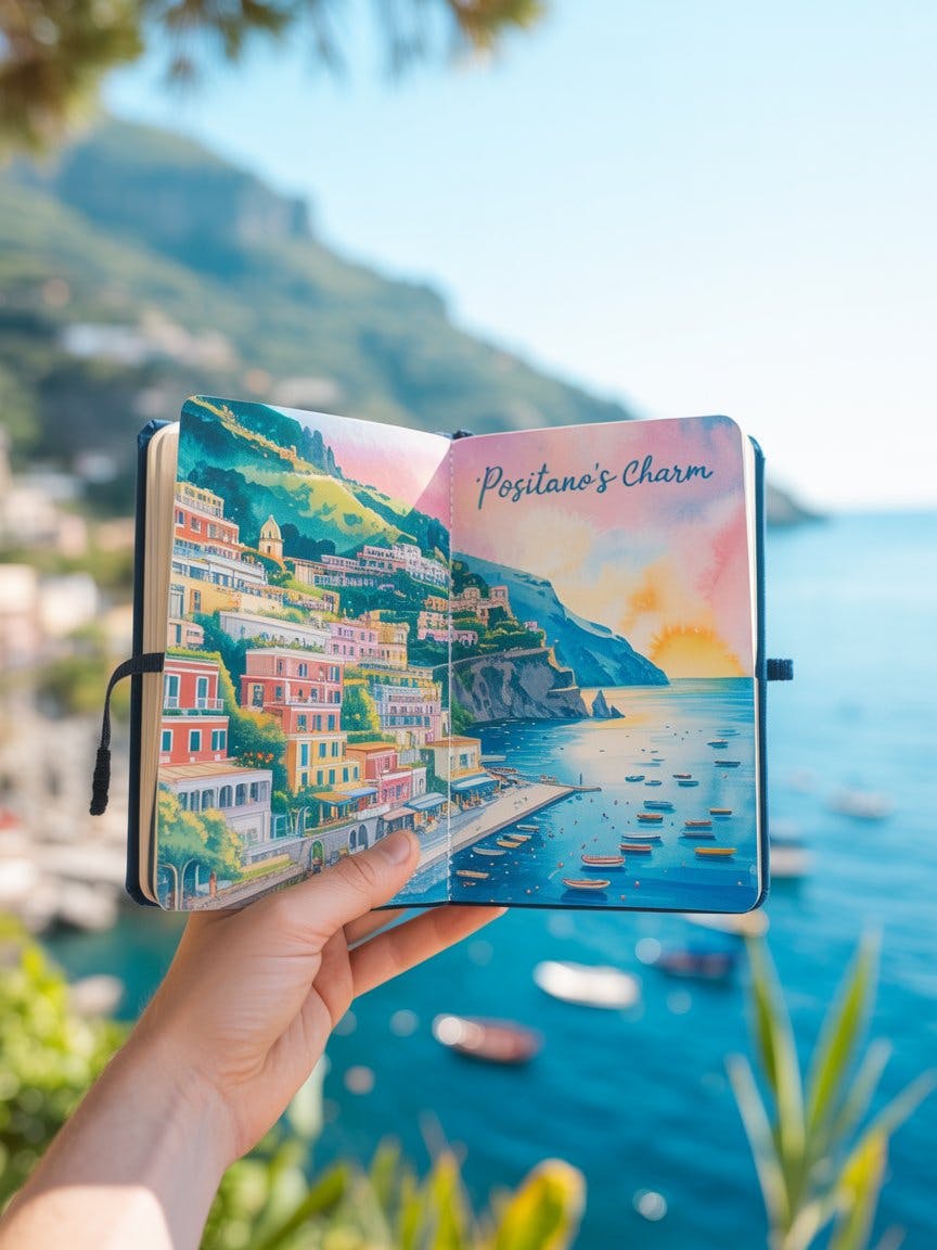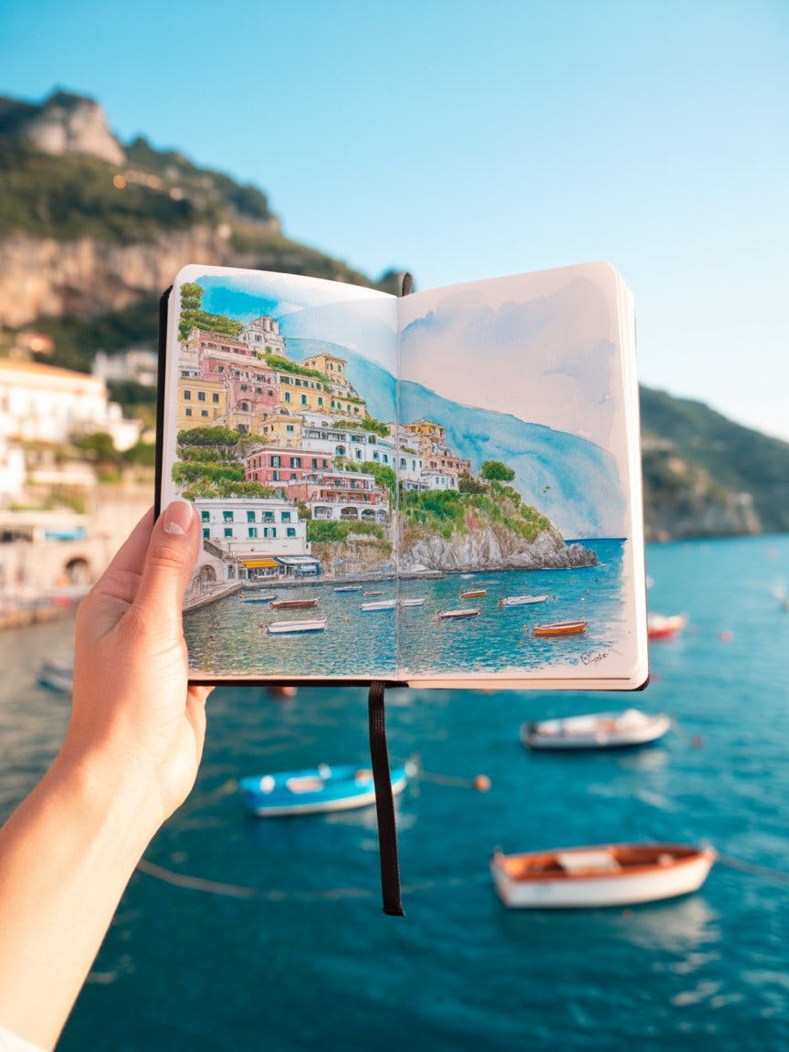 aesthetic photography, Hand holding an open sketchbook in front of a Mediterranean coastal town, sketchbook painting blending seamlessly with real background, colorful hillside houses, steep cliffs by the ocean, bright blue sea with small boats, summer travel scene, artistic travel journal, vibrant pastel colors, dreamy and creative composition, perspective illusion, Positano-inspired seaside, artistic photography with watercolor-style illustration
