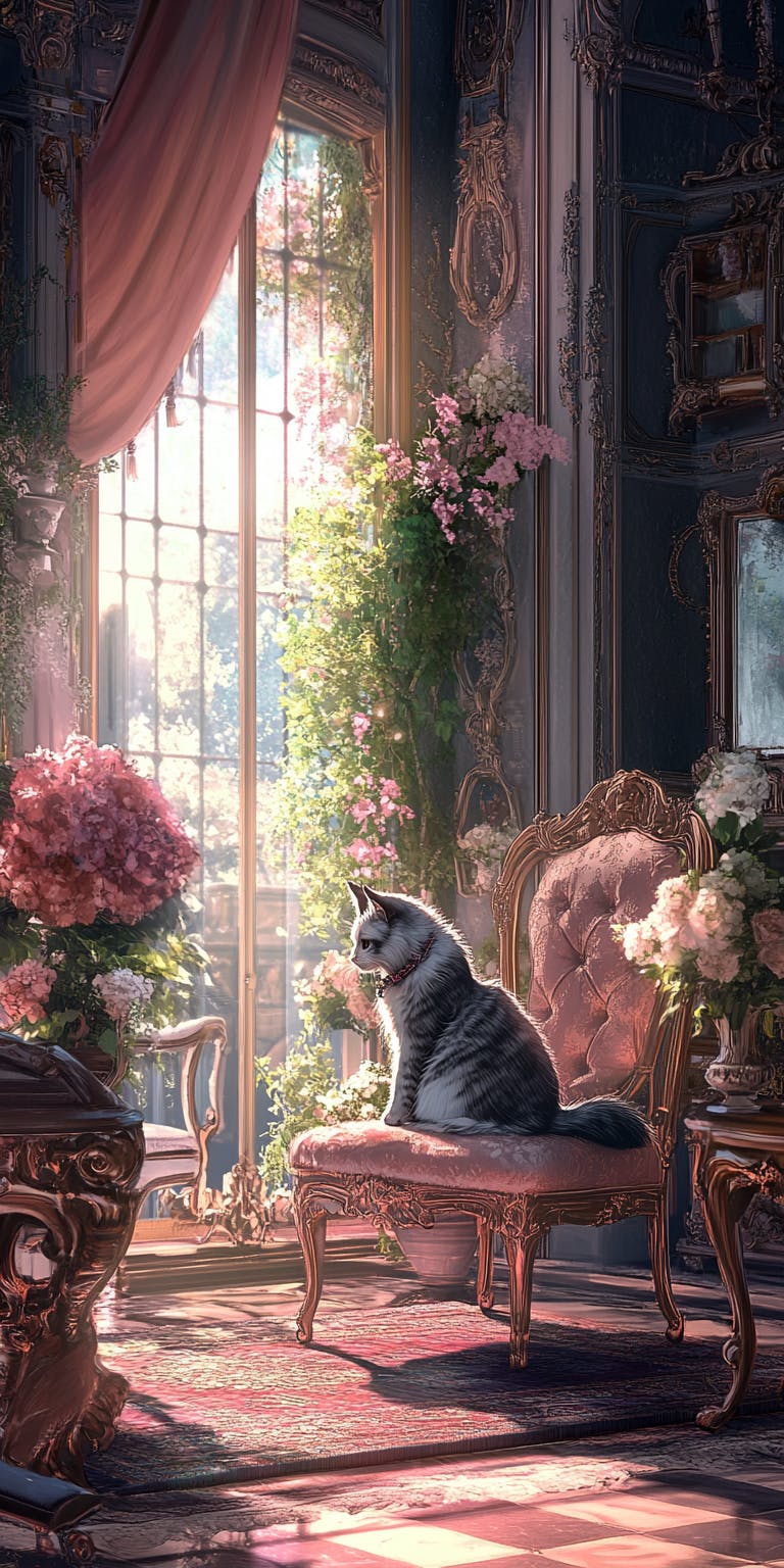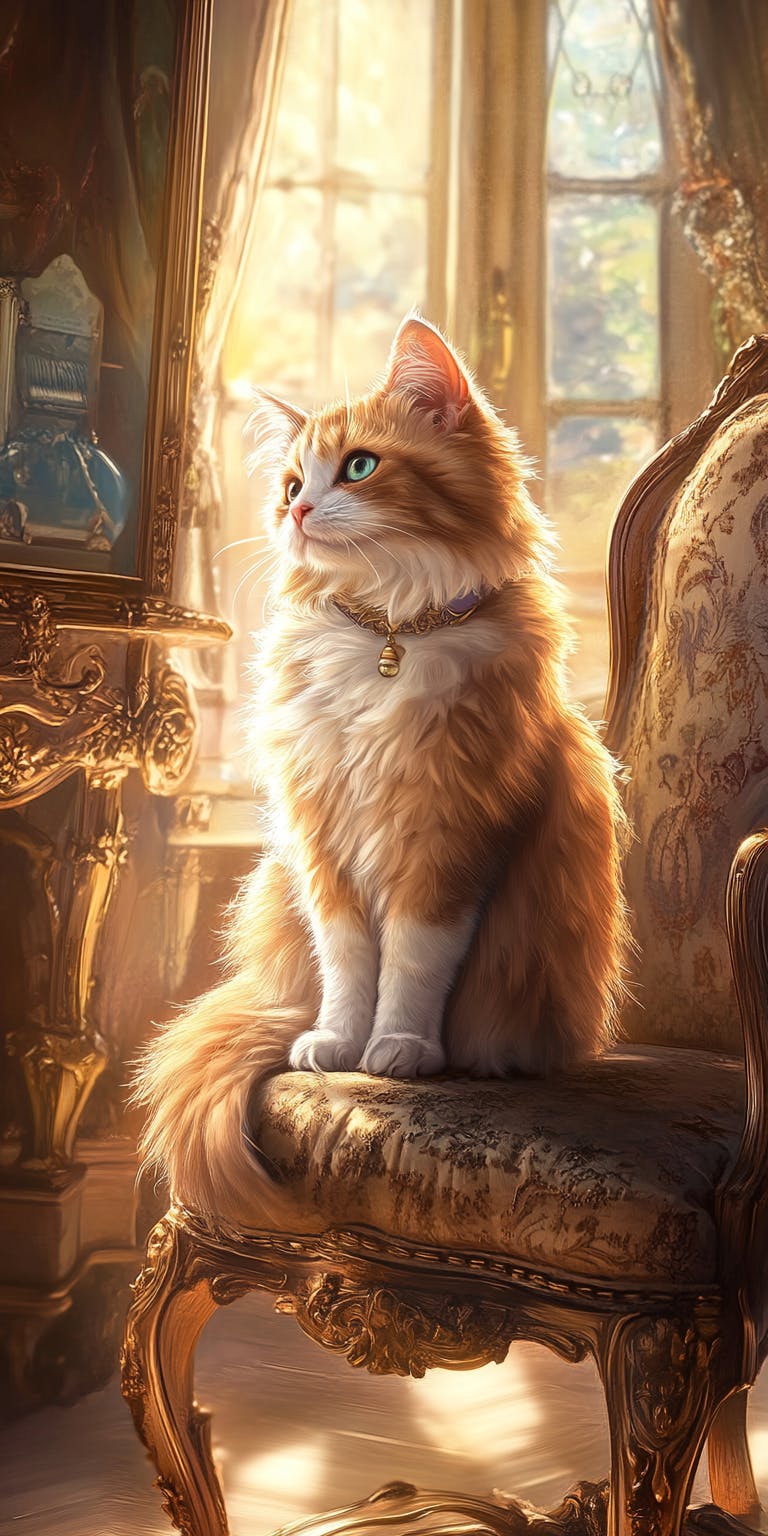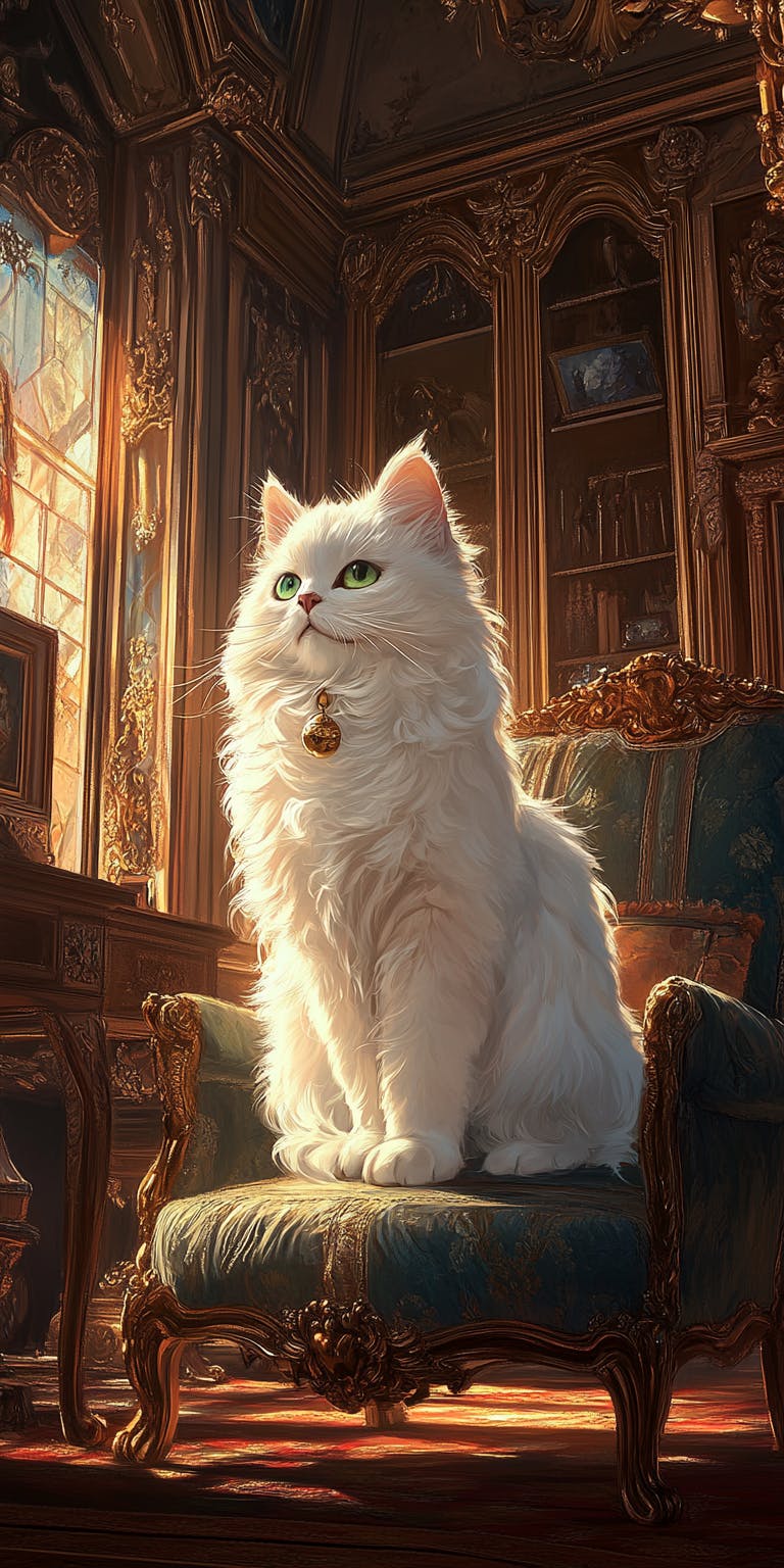 2d anime, perfect anime illustration, cozy room in soft sunlight, Majestic Persian cat, fur glowing in soft sunlight, sitting on a velvet cushion, surrounded by antique furniture, baroque style, delicate linework, dreamy and peaceful atmosphere, warm and inviting colors, high-definition details --chaos 10 --ar 1:2