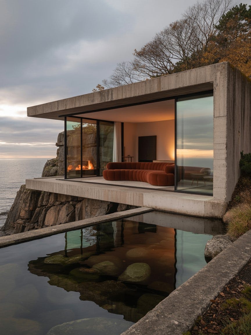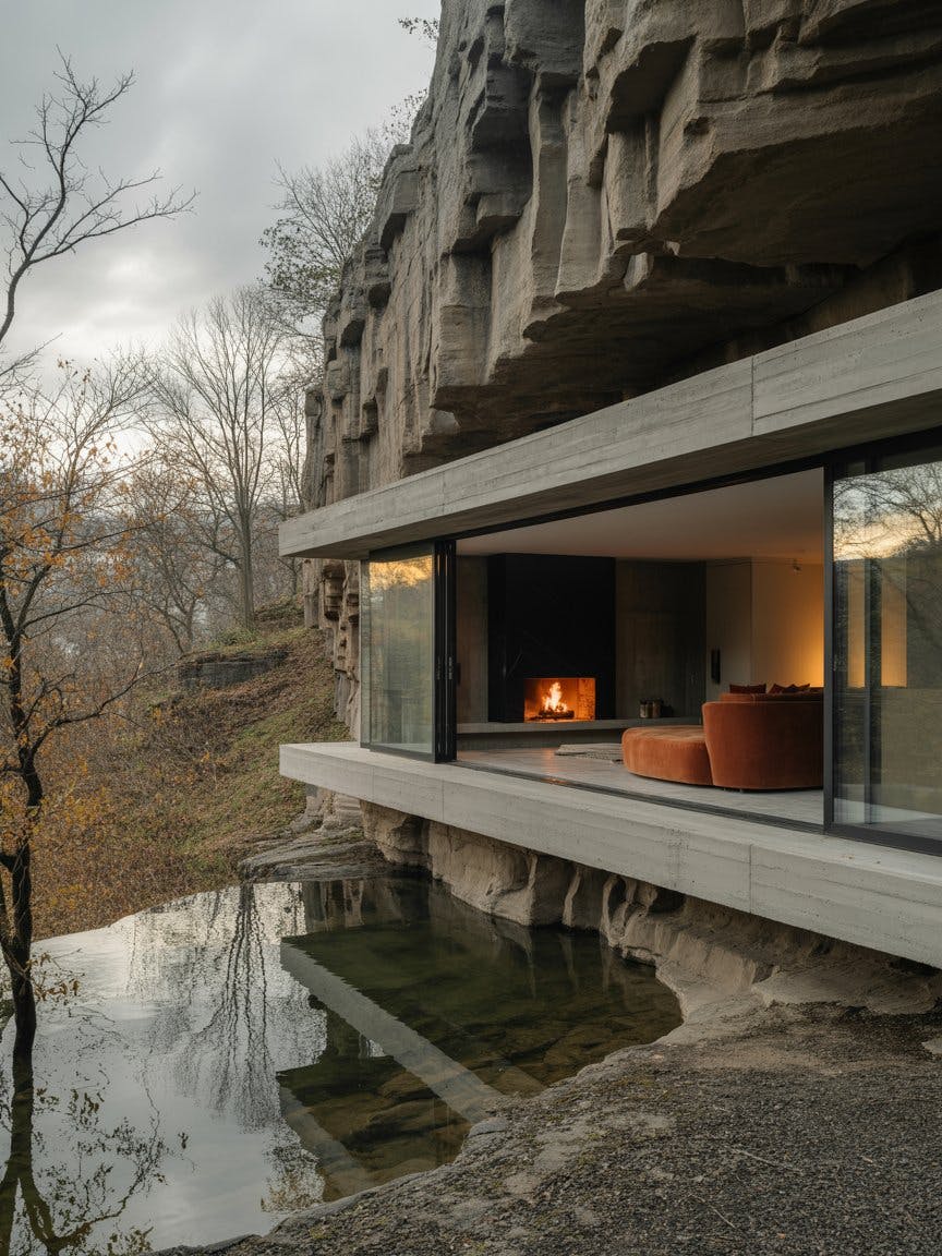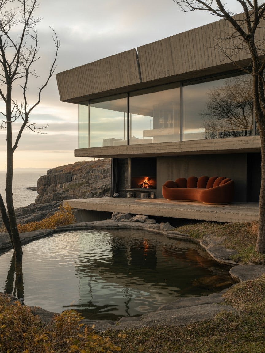 Brutalist cliffside retreat, modern concrete architecture embedded in rocky terrain, large glass windows reflecting overcast sky, minimalistic interior with a curved rust-colored velvet sofa, open fireplace with warm glow, tranquil natural pond reflecting structure and bare trees, autumn branches surrounding the space, soft golden hour lighting, serene and moody ambiance, raw textures of concrete and stone, harmonious contrast between nature and architecture, high-resolution, ultra-realistic, cinematic framing, cozy brutalism aesthetic