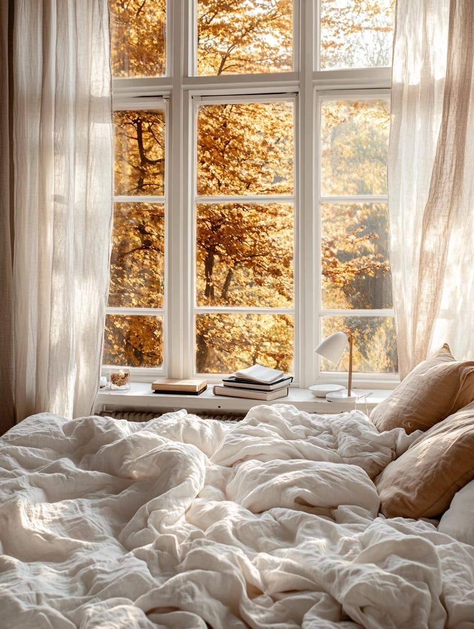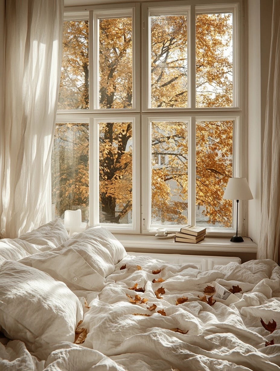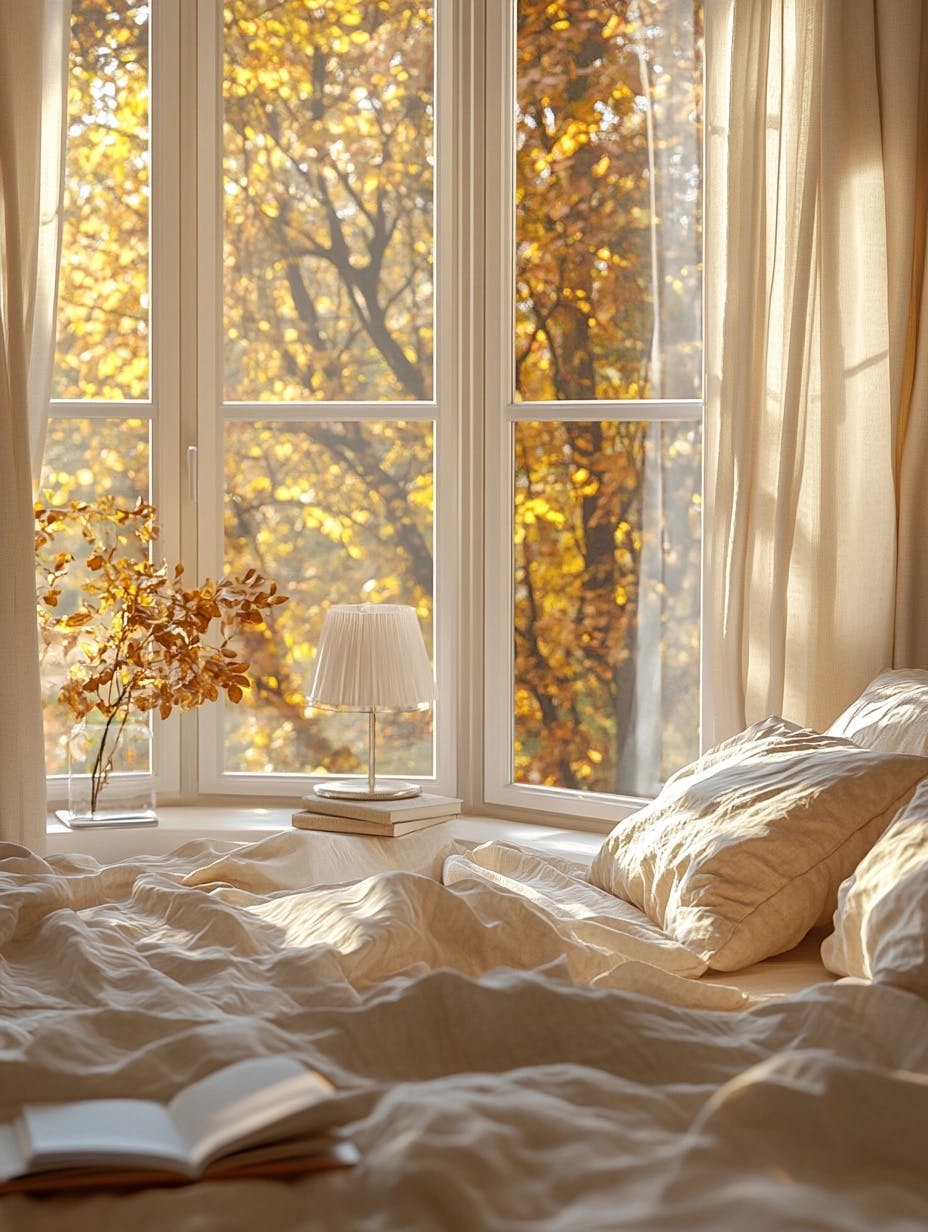 Cozy bedroom bathed in soft golden autumn sunlight, large bay windows with white wooden frames, golden-brown leaves visible outside, sheer curtains gently blowing, unmade bed with crumpled white linen bedding, neutral-colored pillows, warm and peaceful atmosphere, mini lamp and books on the windowsill, calm and inviting morning vibes, soft shadows, natural tones, serene and tranquil ambiance --chaos 10 --ar 3:4 --stylize 200 --v 6.1