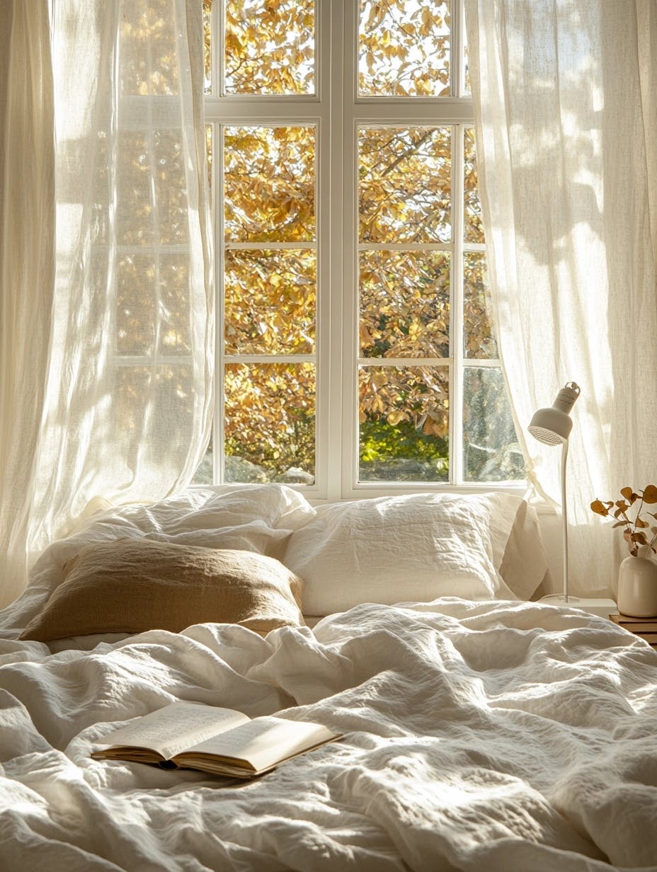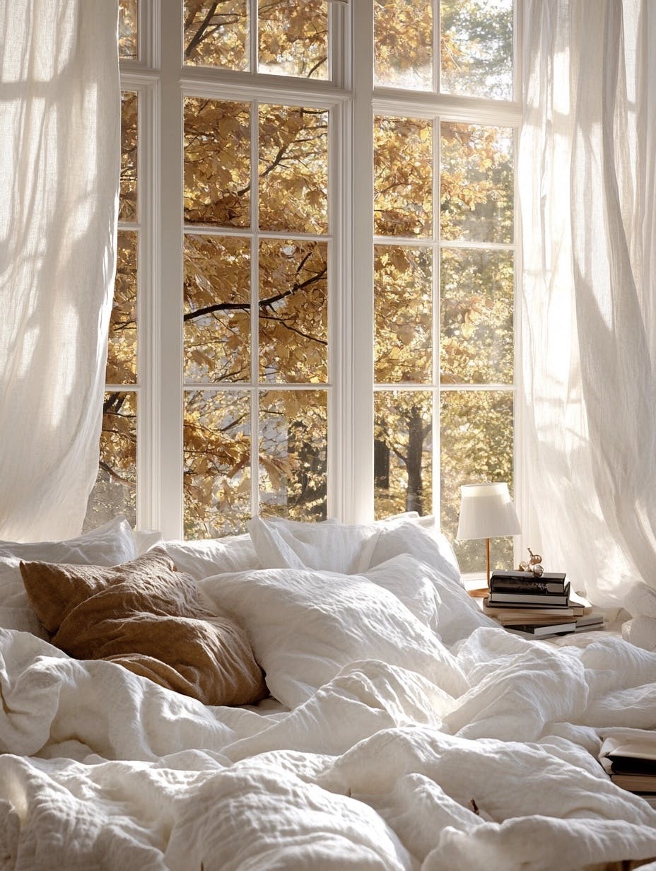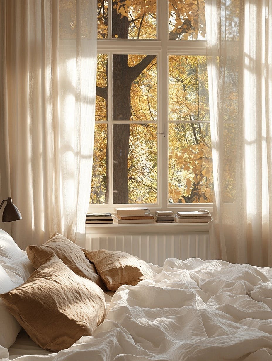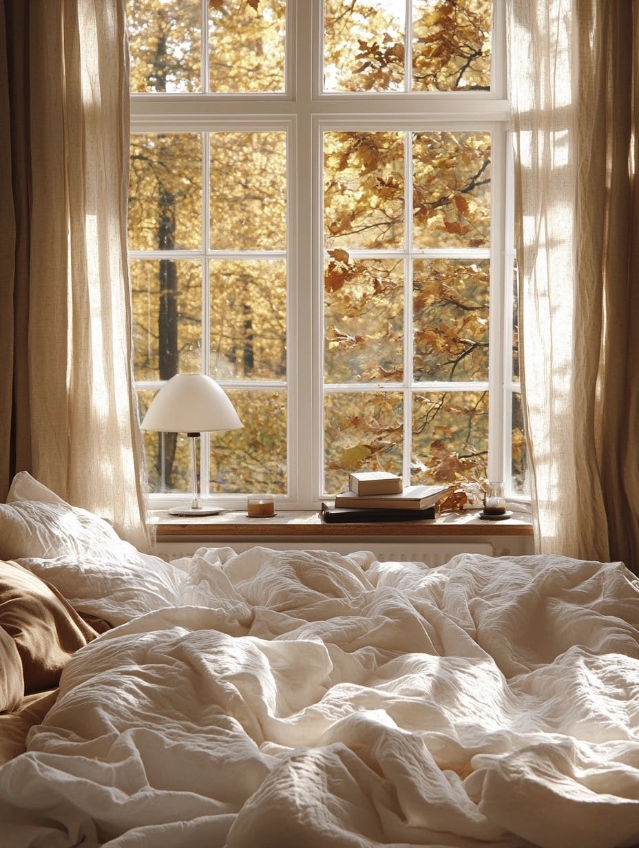 Cozy bedroom bathed in soft golden autumn sunlight, large bay windows with white wooden frames, golden-brown leaves visible outside, sheer curtains gently blowing, unmade bed with crumpled white linen bedding, neutral-colored pillows, warm and peaceful atmosphere, mini lamp and books on the windowsill, calm and inviting morning vibes, soft shadows, natural tones, serene and tranquil ambiance --chaos 10 --ar 3:4 --stylize 200 --v 6.1