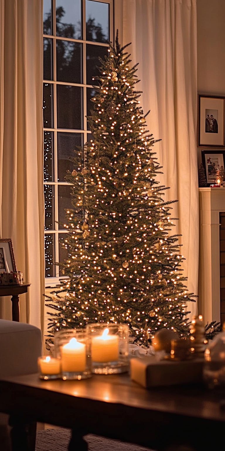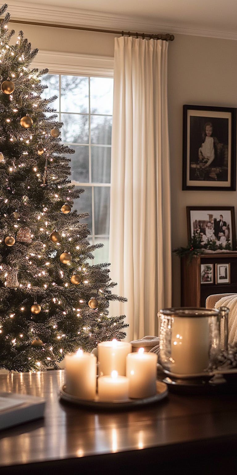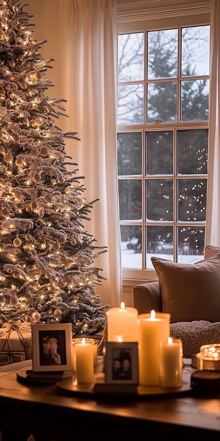 https://s.mj.run/L2LlkTTWe5o Cozy Christmas living room, warmly lit Christmas tree with soft golden lights, vintage decor, white curtains framing a tall window, candles glowing on a wooden table, family photos displayed in elegant frames, soft beige and brown tones, inviting and serene holiday atmosphere, classic and timeless design, soft lighting with reflections on the glass, peaceful and intimate setting. --chaos 10 --ar 1:2 --v 6.1