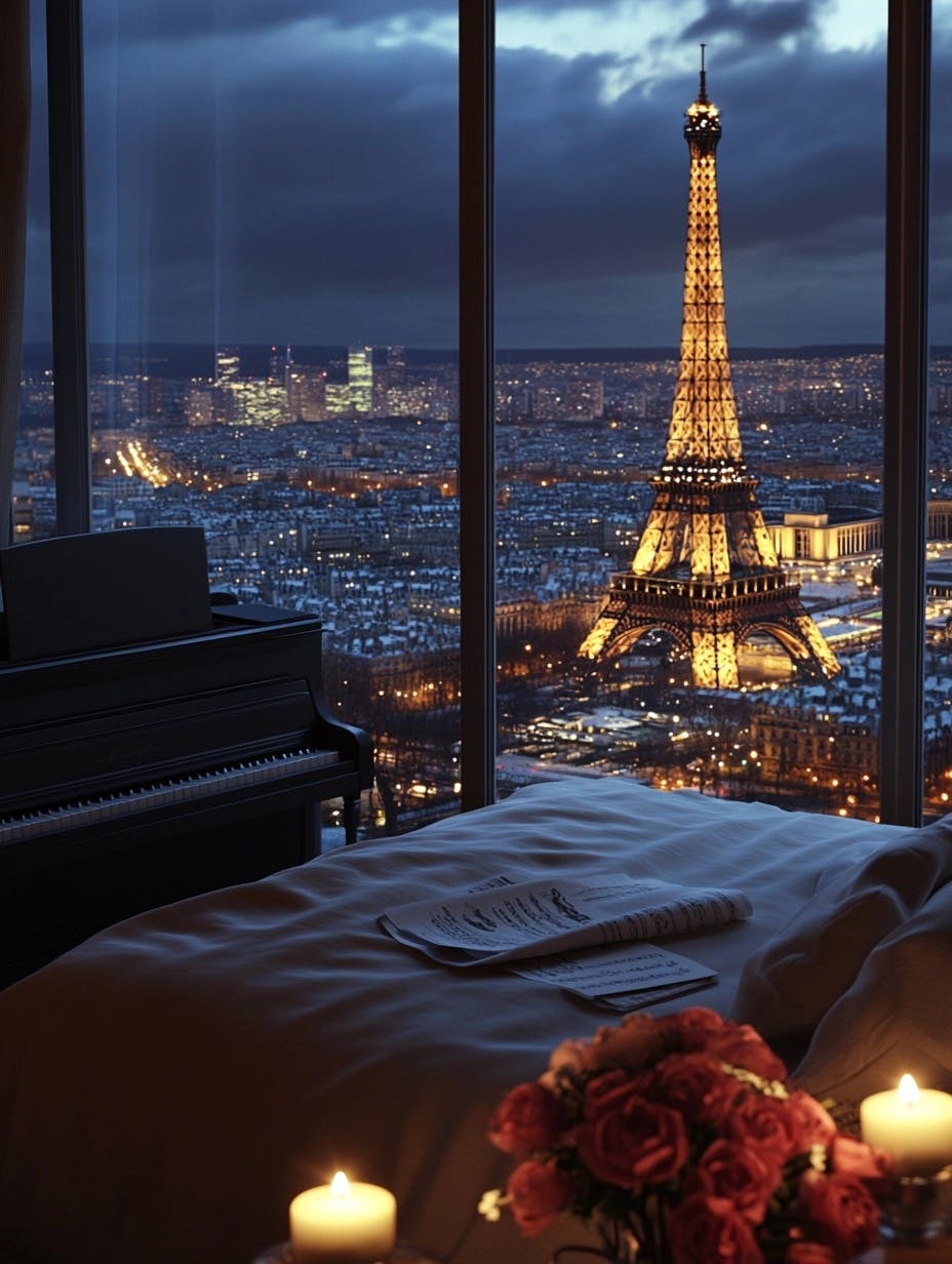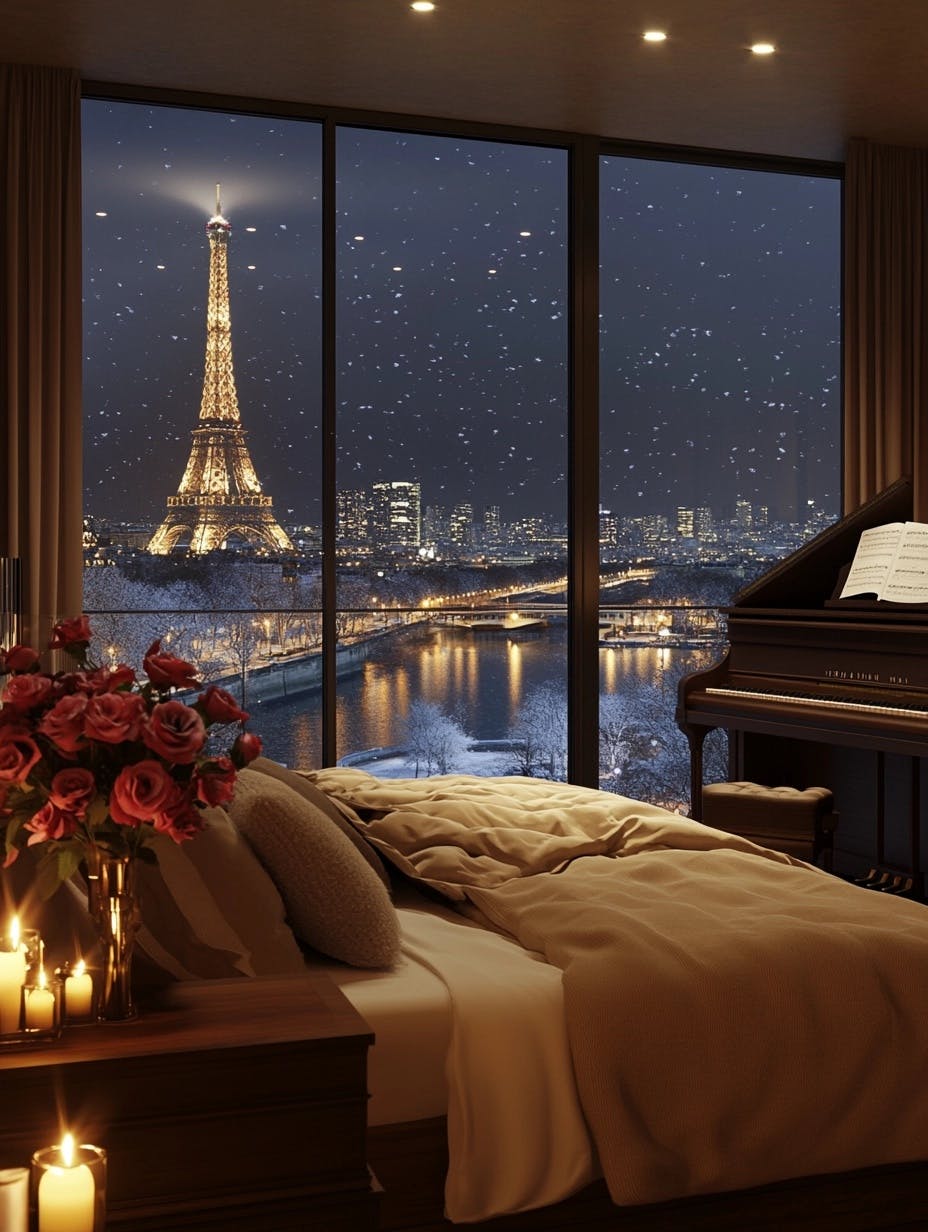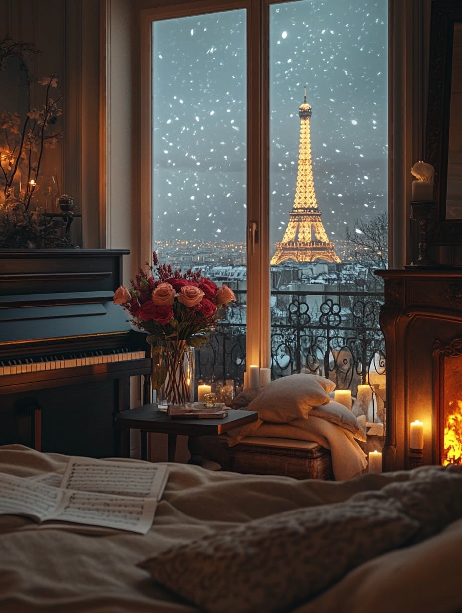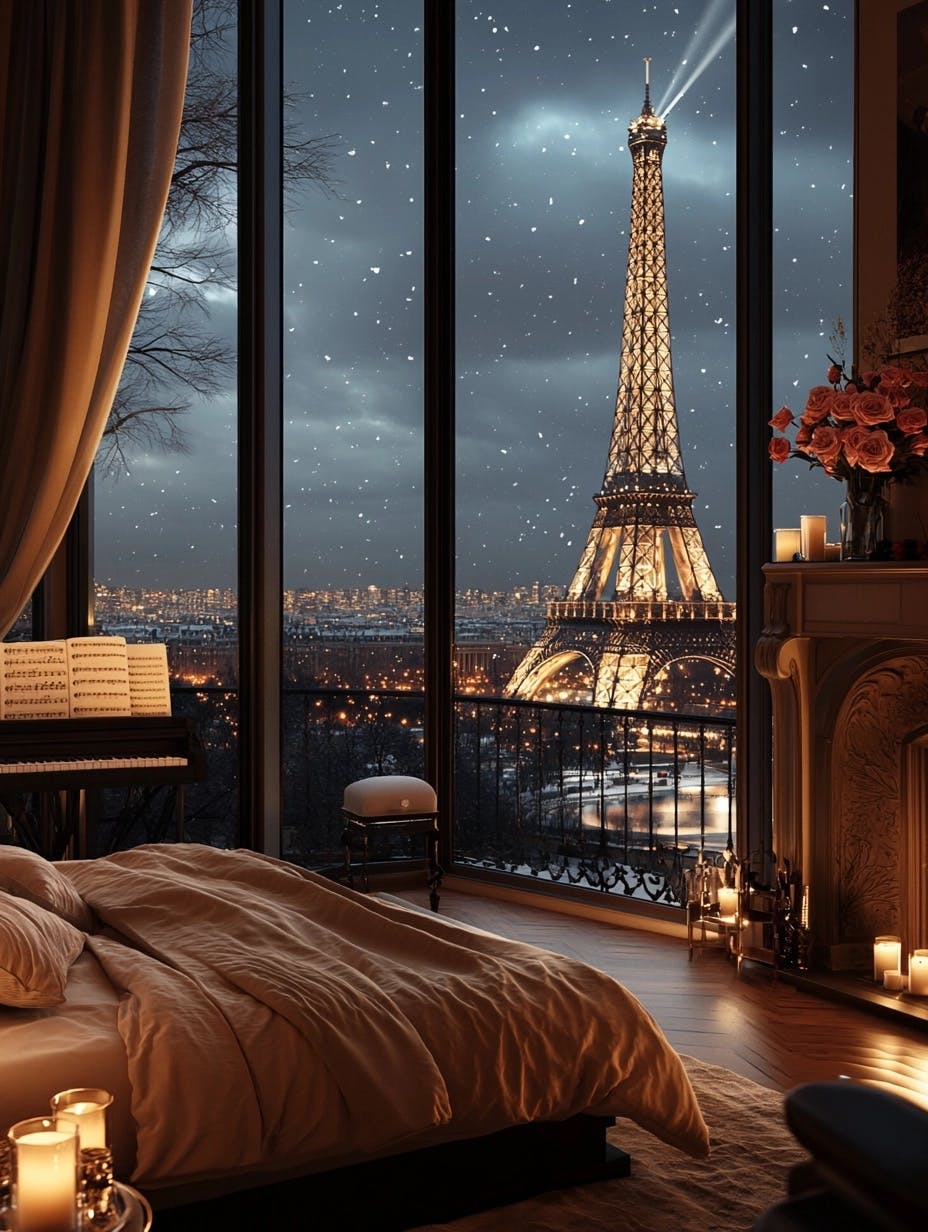aesthetic photoshoot, Arched floor-to-ceiling windows overlooking the Eiffel Tower, nighttime Paris skyline with city lights, snow gently falling outside, cozy modern bedroom interior, soft beige bed with plush pillows and blankets, warm candlelight on bedside tables, elegant bouquet of pink and red flowers in a vase, vintage upright piano with sheet music, dimly lit ambient lighting, sleek wooden floors, modern fireplace with a soft glowing fire, luxurious and intimate atmosphere, rich wood accents, tranquil and romantic vibe, detailed textures, high-definition realism, serene and warm ambiance, perfect view of Paris in winter. --chaos 15 --ar 3:4 --v 6.1