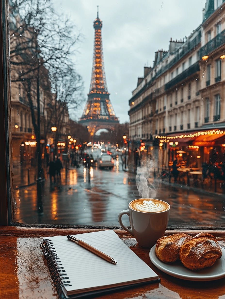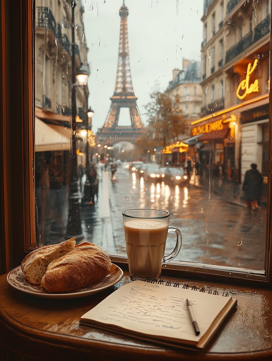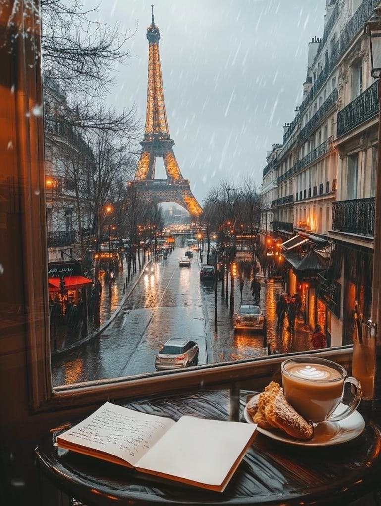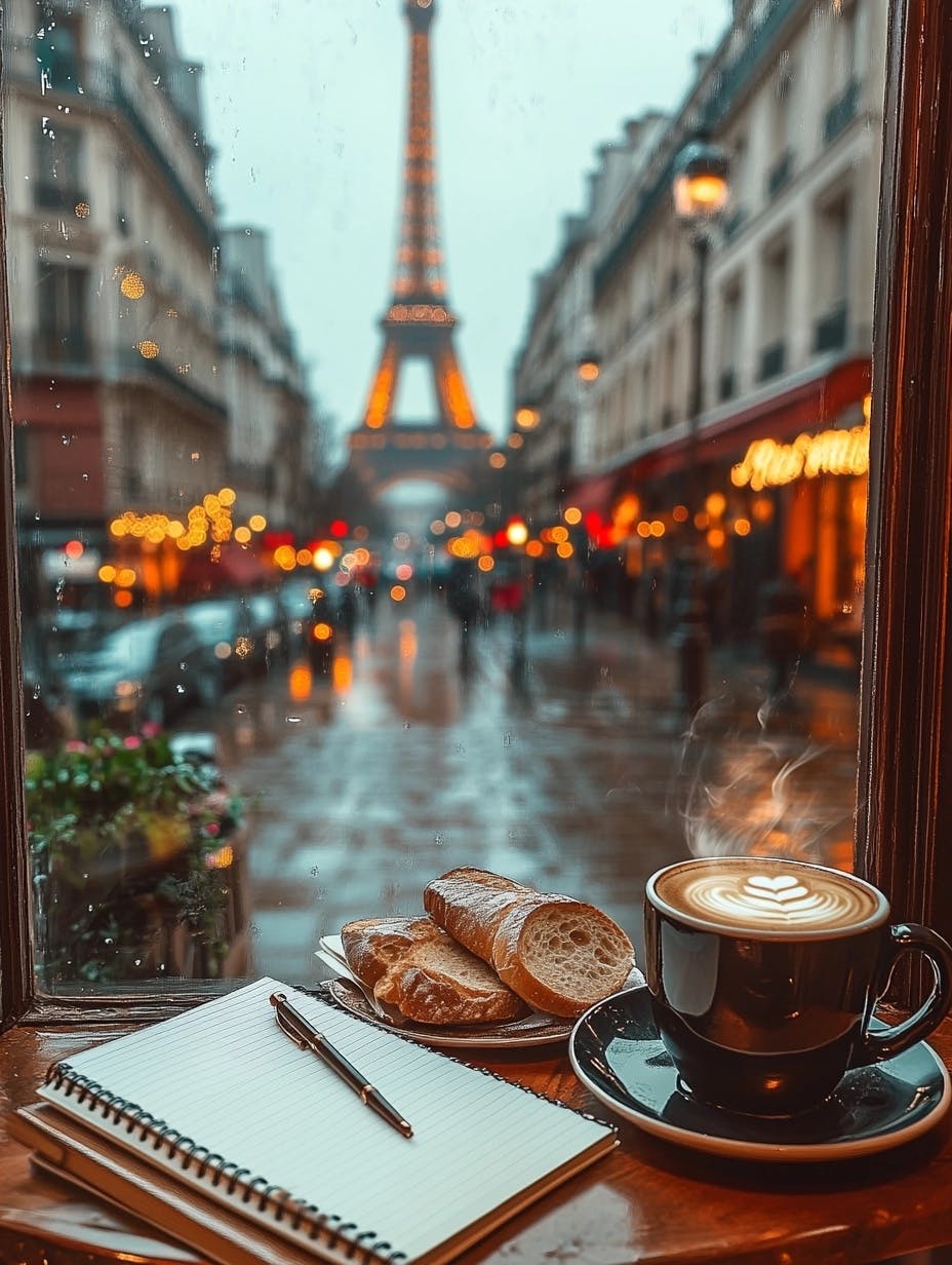 aesthetic, realistic, moody Cozy Parisian café setting with a view of the Eiffel Tower in the background, view from a second floor cafe, rainy day with soft reflections on the wet streets, warm, notebook and cup of steaming coffee, mug of creamy latte next to a plate of bread, bustling street with classic Parisian architecture and twinkling lights, romantic and serene atmosphere, perfect for enjoying a peaceful moment of writing and reflection --chaos 10 --ar 3:4 --stylize 200 --v 6.1