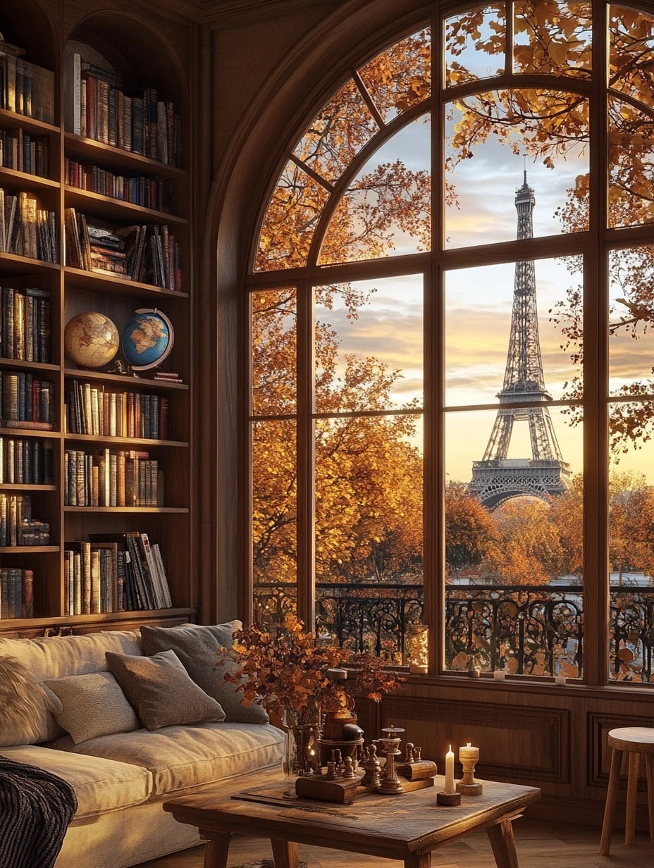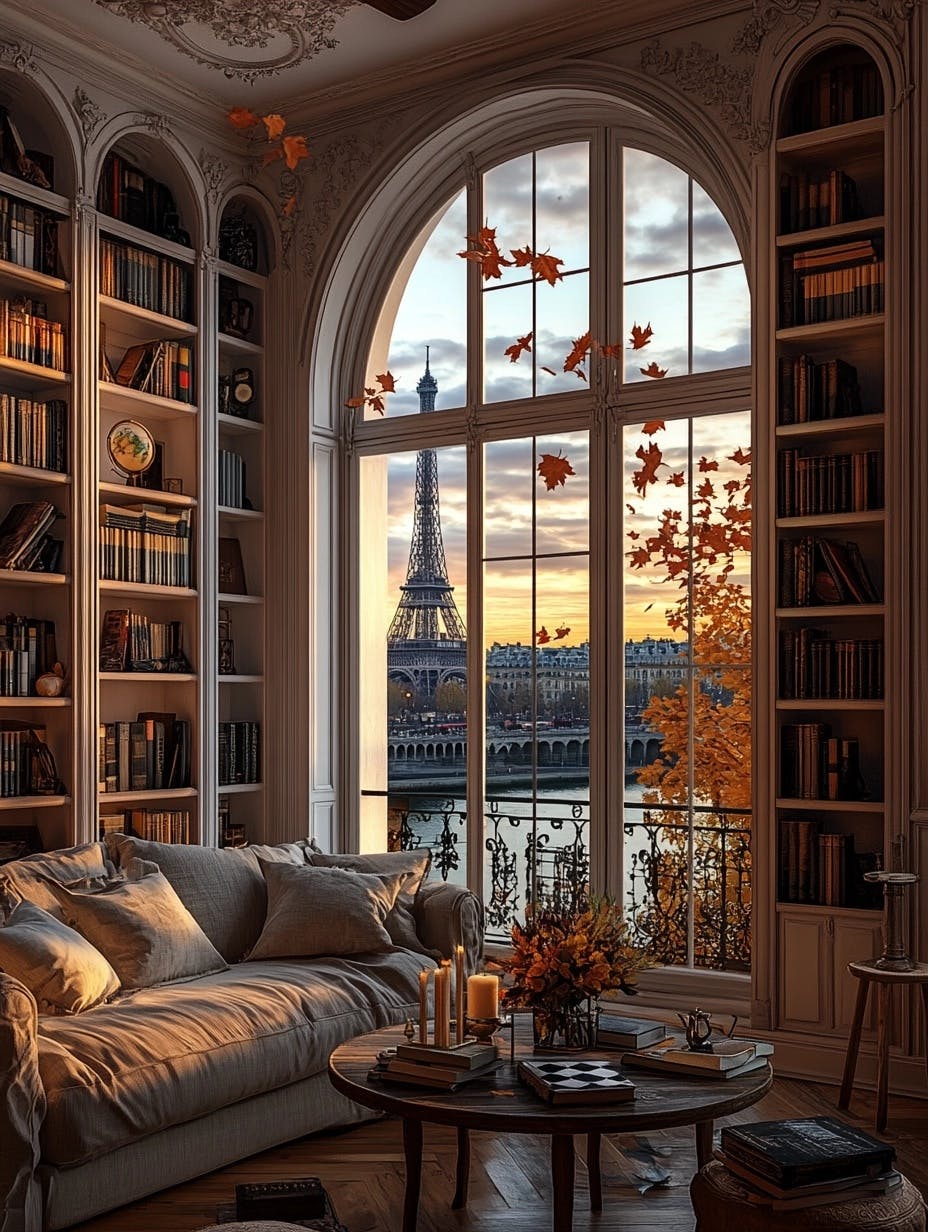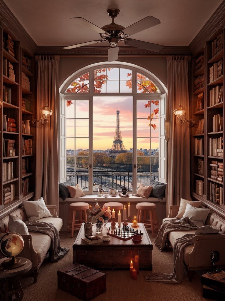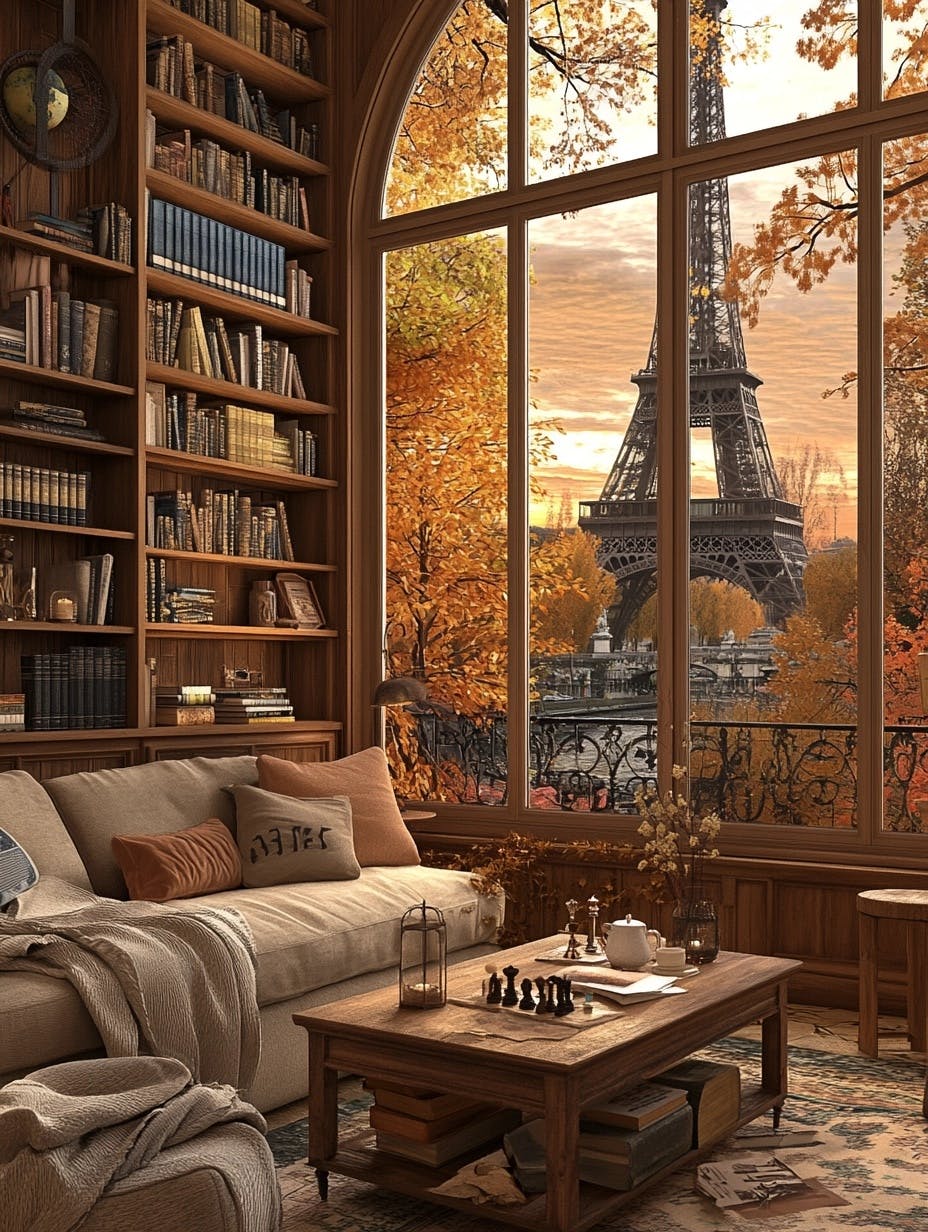 photorealistic, Cozy Parisian library with a warm, rustic interior, large arched windows overlooking the Eiffel Tower and the Seine River, autumn leaves gently falling outside, sunset sky painted with shades of orange and pink, wooden bookshelves filled with vintage books, soft lighting from a classic ceiling fan, a comfortable beige couch with throw blankets and pillows, a wooden coffee table adorned with candles, flowers in a vase, and a chess set, a globe and old suitcases as decoration, stools by the window, a teapot and cups on the windowsill, creating a peaceful, serene atmosphere.