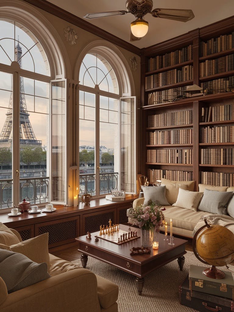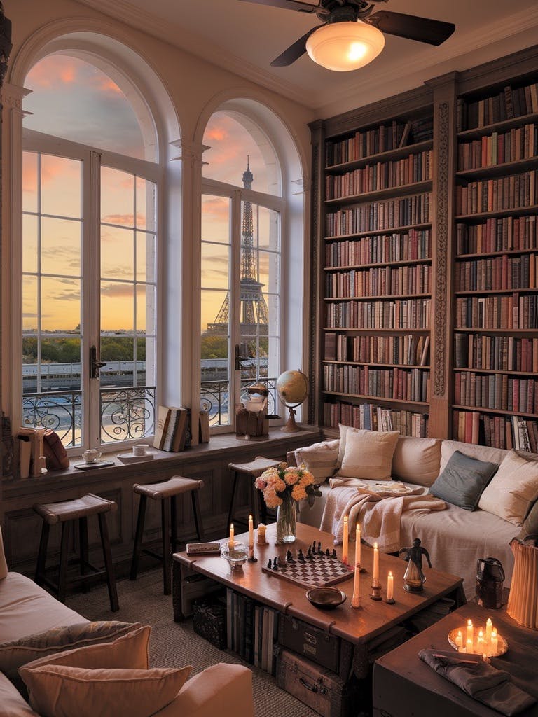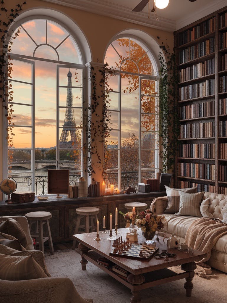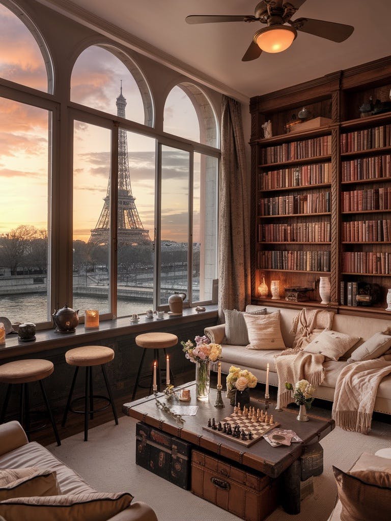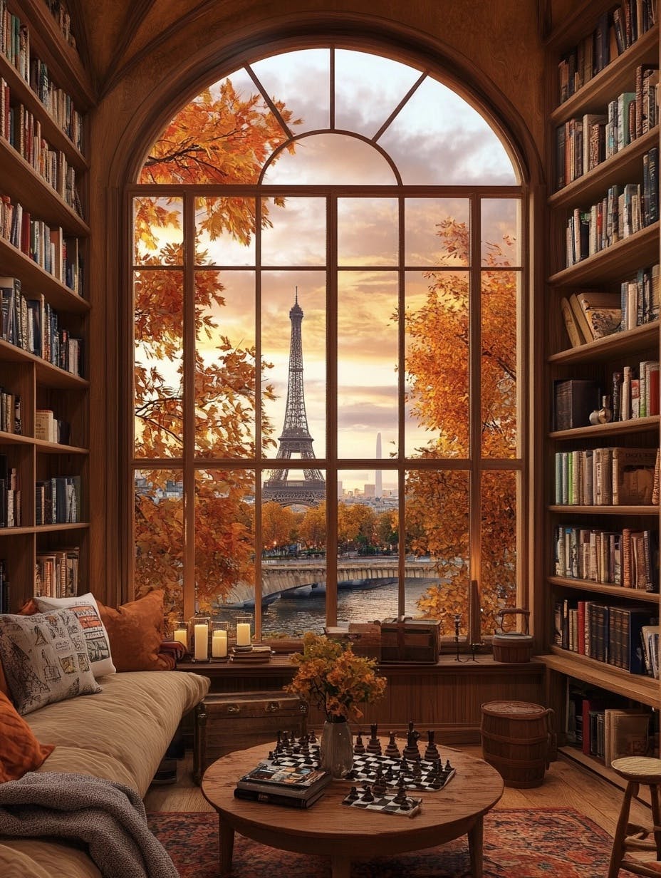 photorealistic, Cozy Parisian library with a warm, rustic interior, large arched windows overlooking the Eiffel Tower and the Seine River, autumn leaves gently falling outside, sunset sky painted with shades of orange and pink, wooden bookshelves filled with vintage books, soft lighting from a classic ceiling fan, a comfortable beige couch with throw blankets and pillows, a wooden coffee table adorned with candles, flowers in a vase, and a chess set, a globe and old suitcases as decoration, stools by the window, a teapot and cups on the windowsill, creating a peaceful, serene atmosphere.