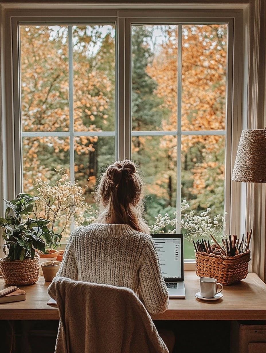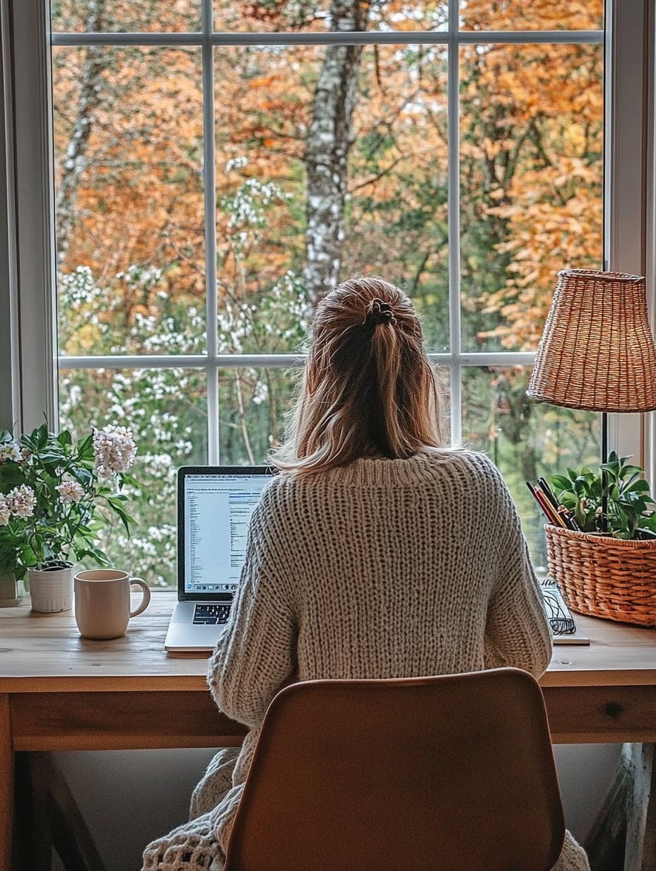 Cozy workspace, a woman in a light knit sweater sitting at a wooden desk, warm natural light streaming through a large window, rustic and minimalist decor, soft pastel tones, a laptop open with work in progress, a ceramic mug of tea, a woven basket with pens and stationery, a linen lampshade adding warmth, a serene and peaceful atmosphere, spring-inspired aesthetic, high-definition details, soft and refreshing textures. --ar 3:4