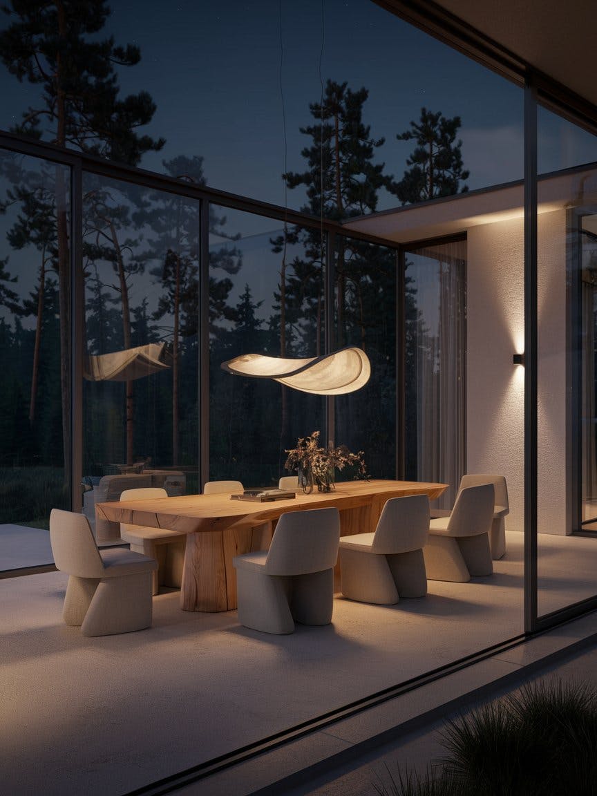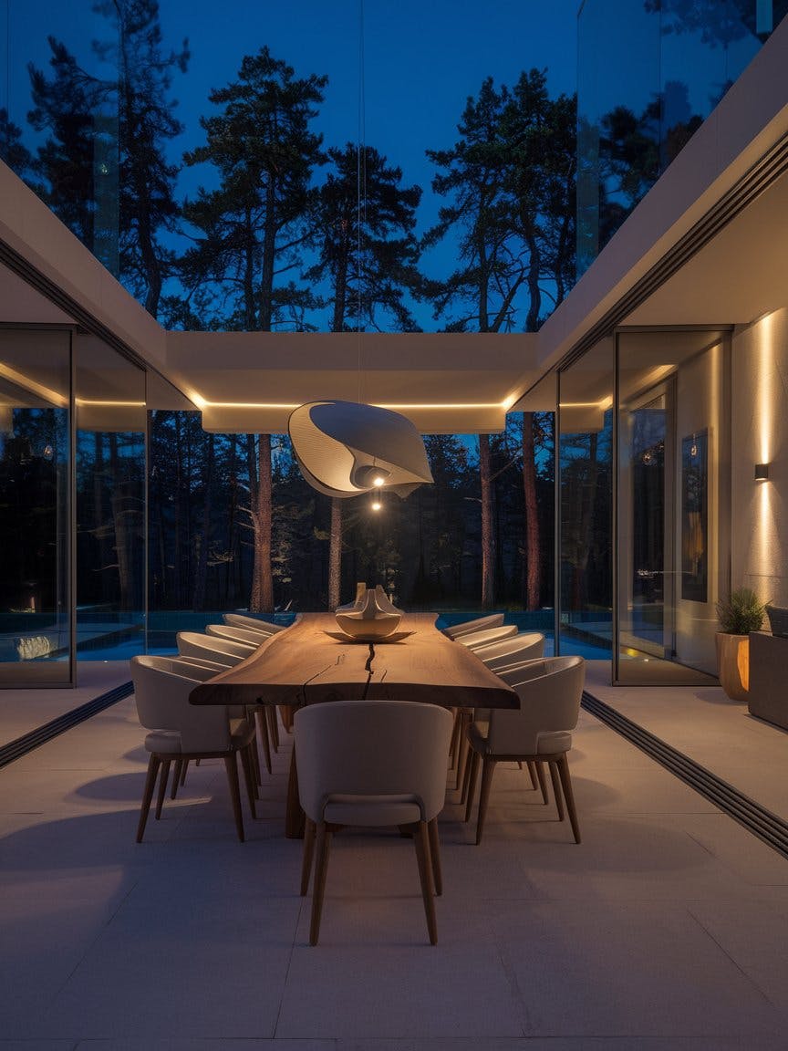 Elegant dining room with floor-to-ceiling glass overlooking the pine forest, large natural wood dining table, designer chairs in neutral tones, sculptural pendant light above the table, ambient wall lighting, minimalistic and organic design elements, serene nighttime atmosphere, smooth stone floor, luxury modern aesthetic with forest backdrop, seamless indoor-outdoor connection
