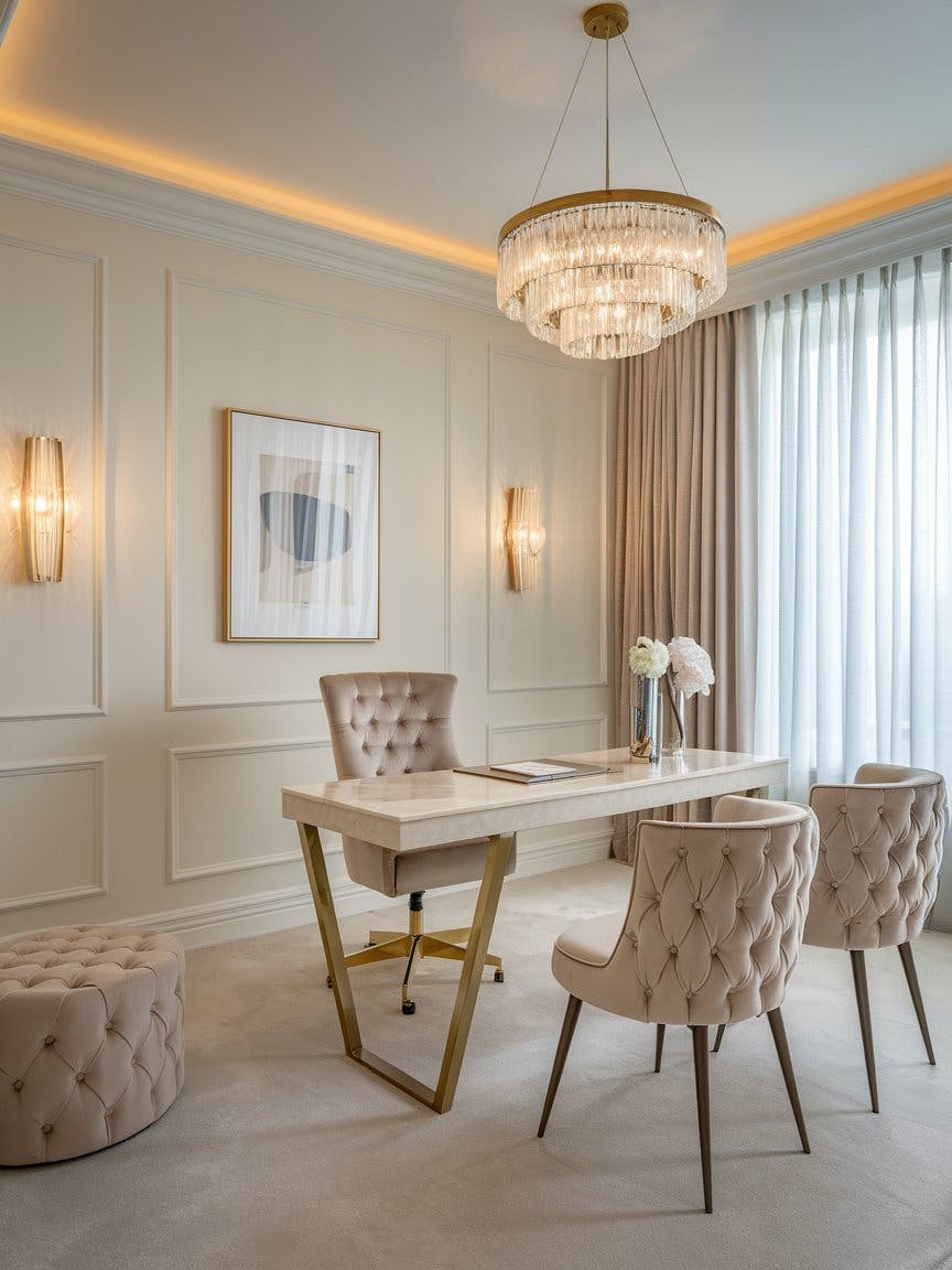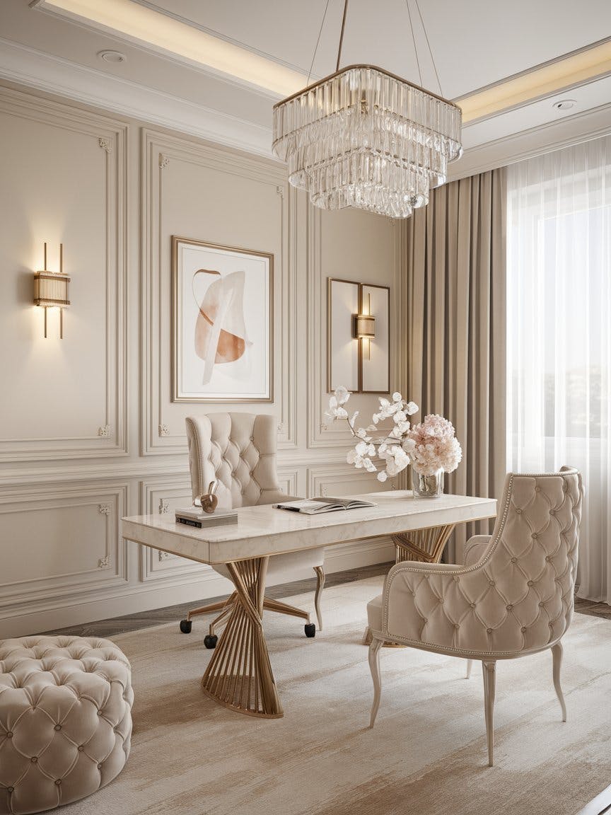Elegant and modern home office, neutral ivory and beige color palette with subtle gold accents, sleek marble desk with sculptural gold legs, contemporary tufted velvet chairs with refined detailing, a statement crystal chandelier adding sophistication, minimalist wall sconces providing warm ambient lighting, delicate floral arrangements in white and soft blush tones, abstract framed artwork on paneled walls, sheer neutral curtains for a soft, airy feel, a plush round ottoman with subtle tufting, clean lines and balanced textures, sophisticated and timeless atmosphere, high-end interior design, high-definition details, warm and inviting modern elegance.