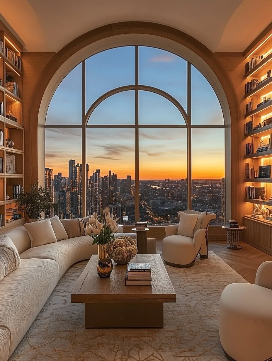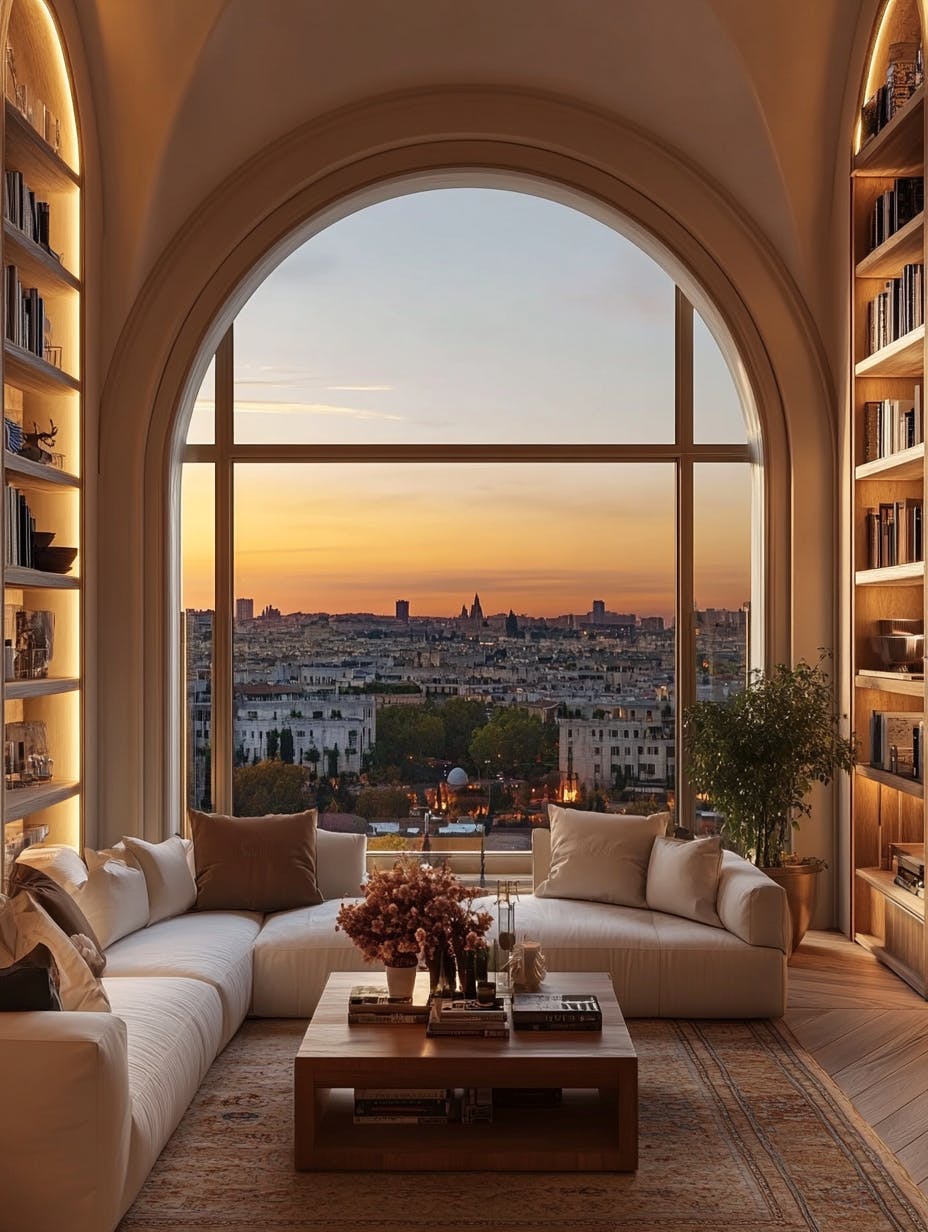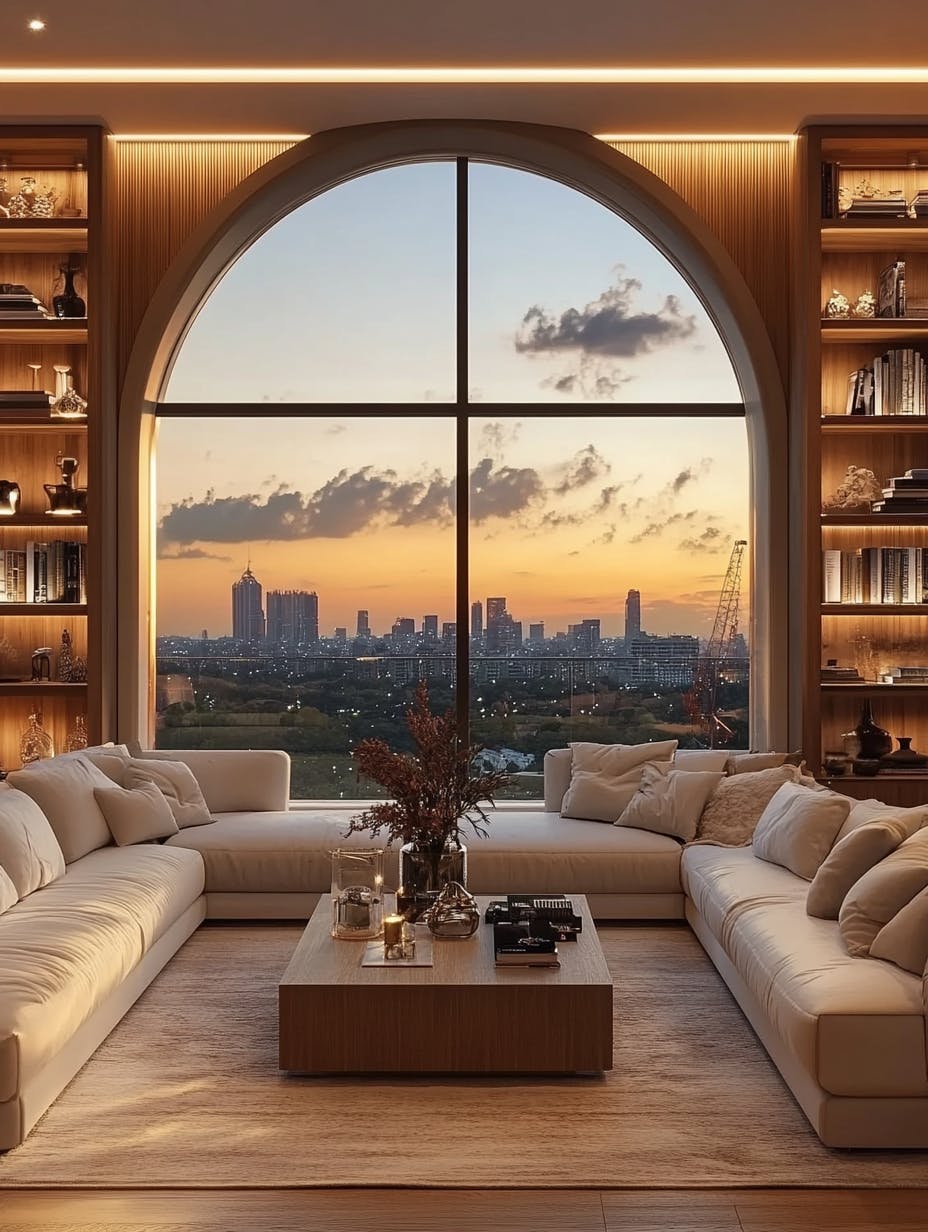 Elegant apartment living room, large arched window with a breathtaking view at sunset, warm golden hour lighting, cozy white sectional sofas with plush cushions, wooden coffee table with decorative vases, soft beige patterned rug, built-in bookshelves with warm lighting, natural wooden flooring, modern yet inviting ambiance, soft candlelight glow, luxurious and serene atmosphere. --chaos 10 --ar 3:4