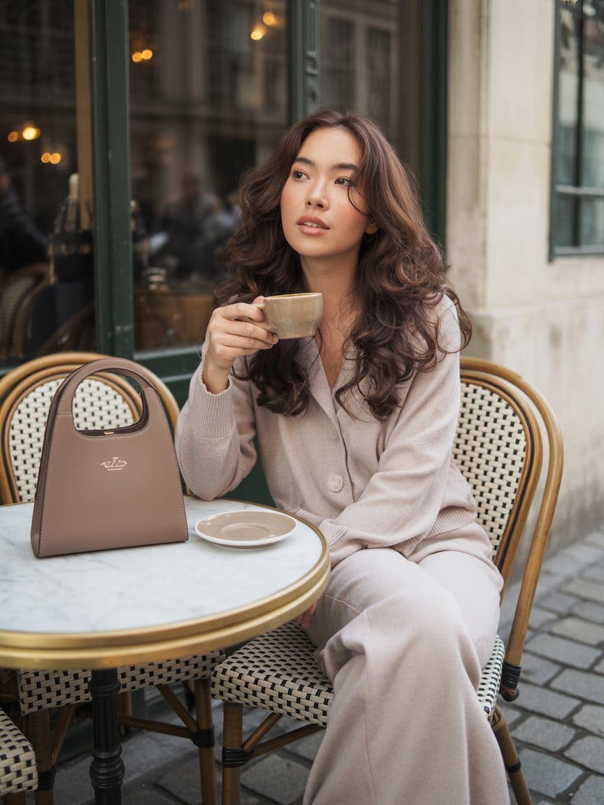 Elegant Asian woman sitting at a Parisian outdoor café, wearing a soft beige knit lounge set, relaxed and graceful pose, long wavy dark brown hair, holding a neutral-toned coffee cup, vintage rattan bistro chairs, round marble café table with gold trim, minimalist brown designer handbag without logo placed on the table, French street fashion, neutral tones, cozy and chic autumn atmosphere, soft natural light, candid fashion editorial style, cobblestone street setting, calm and stylish mood, effortless elegance