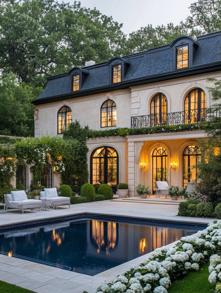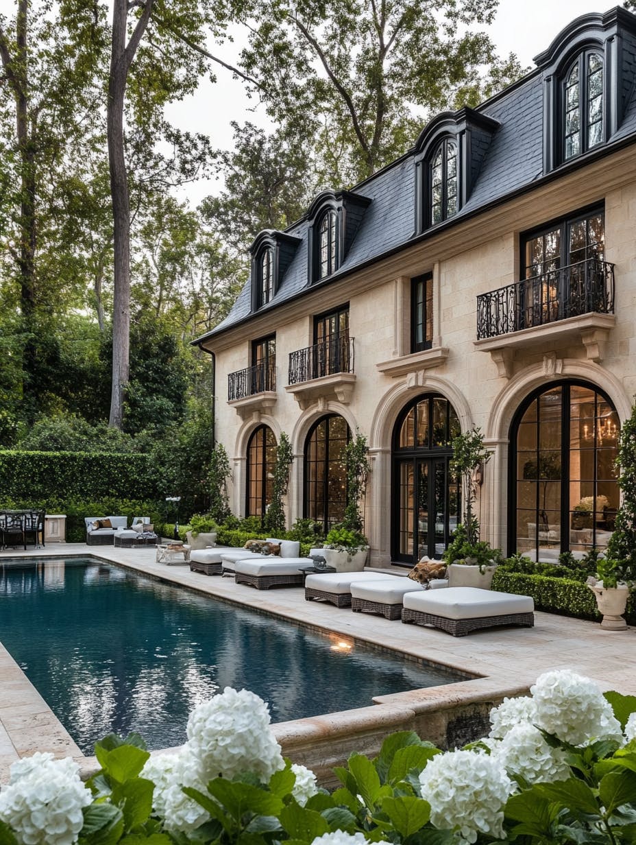 Elegant French-style mansion with a luxurious backyard, featuring a pristine swimming pool surrounded by lush greenery and blooming white hydrangeas. The exterior of the house showcases classic beige stone walls, black mansard roofing, and large arched windows with intricate wrought iron detailing. A spacious outdoor lounge area with plush white seating and decorative potted plants creates a serene and sophisticated ambiance. The warm evening light filters through tall trees, adding a timeless charm to this exquisite estate. --ar 3:4