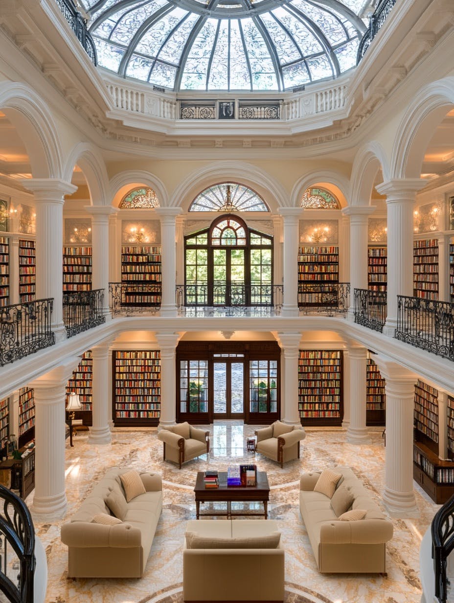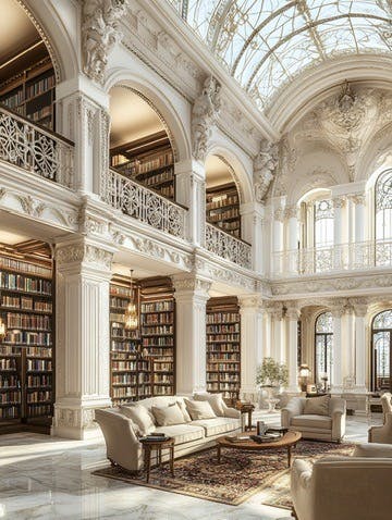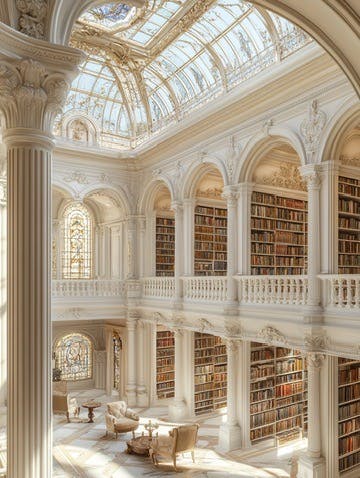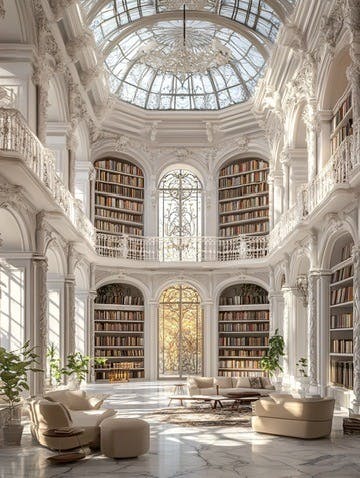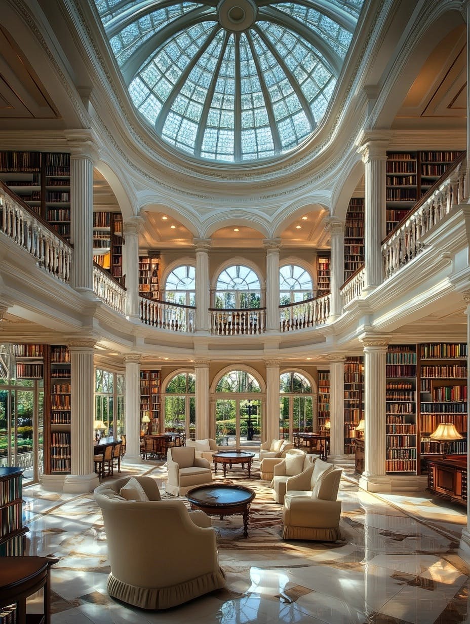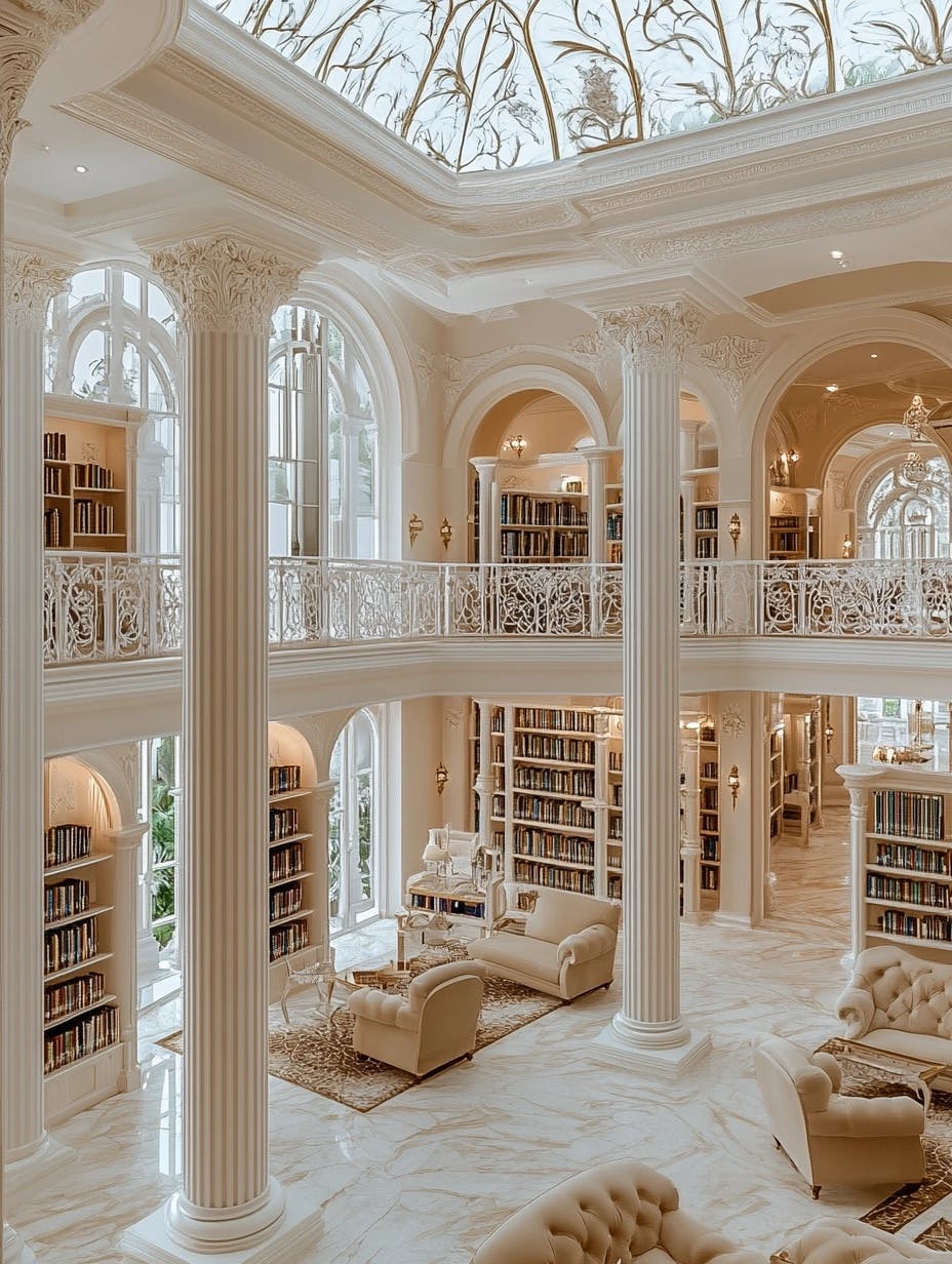 Elegant grand library, soaring white marble columns with intricate carvings, ornate arched balconies lined with thousands of books, white wrought-iron railings with delicate floral details, massive glass dome ceiling allowing natural light to flood the room, large arched windows with stained glass patterns, polished marble floors with subtle patterns, cozy beige lounge seating and reading tables arranged in spacious clusters, luxurious and opulent Victorian style, warm ambient lighting highlighting architectural details, serene and majestic atmosphere, high level of detail and realism, timeless and classic European design, airy and spacious feel, pristine and meticulously organized --chaos 10 --ar 3:4 --v 6.1