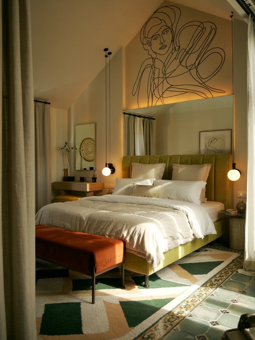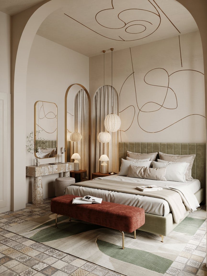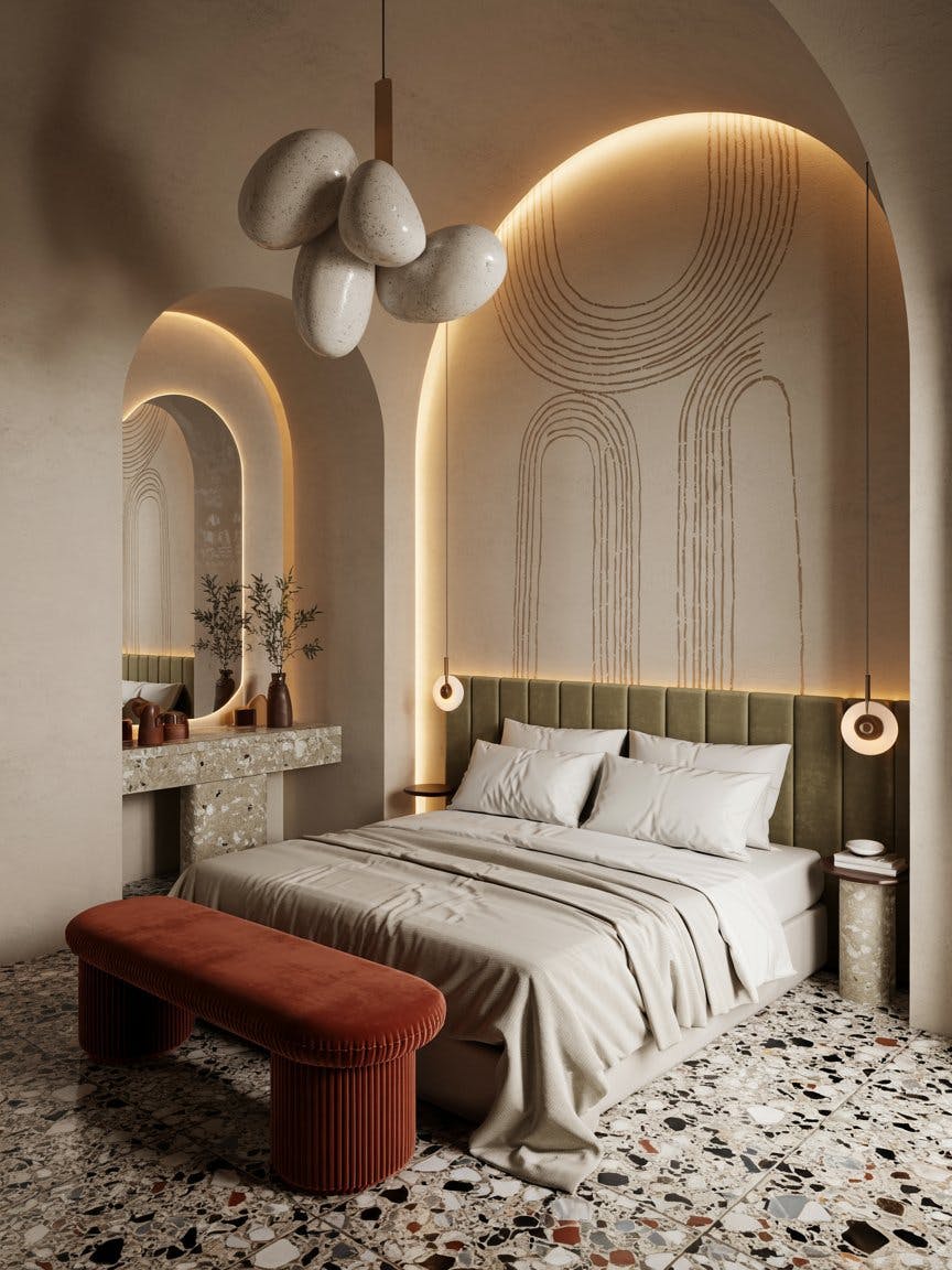 Elegant Mediterranean bedroom, sculptural architecture, soft earth tones, vaulted ceiling with modern line art mural, arched doorway and curved wall details, sophisticated pendant lighting in matte white and brass, vintage-style terrazzo floor tiles in black and terracotta pattern, custom olive green velvet headboard, white layered bedding with natural linen textures, rust velvet bench with pleated base, minimalist stone vanity table with organic decor, large abstract mirror reflecting mural, sheer white curtains filtering warm daylight, harmonious composition of classical and modern elements, refined and serene atmosphere, luxurious hotel suite, high-end editorial interior photography, photorealistic rendering, ambient light, ultra-detailed