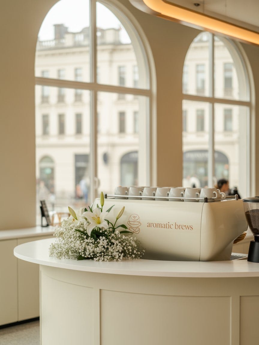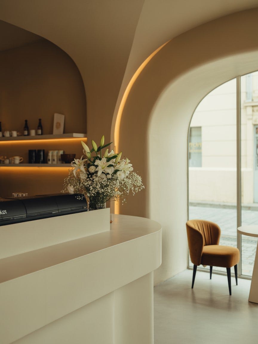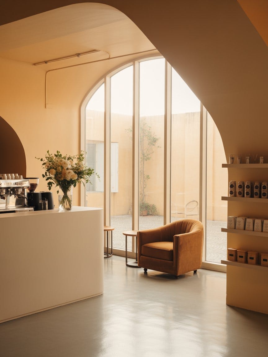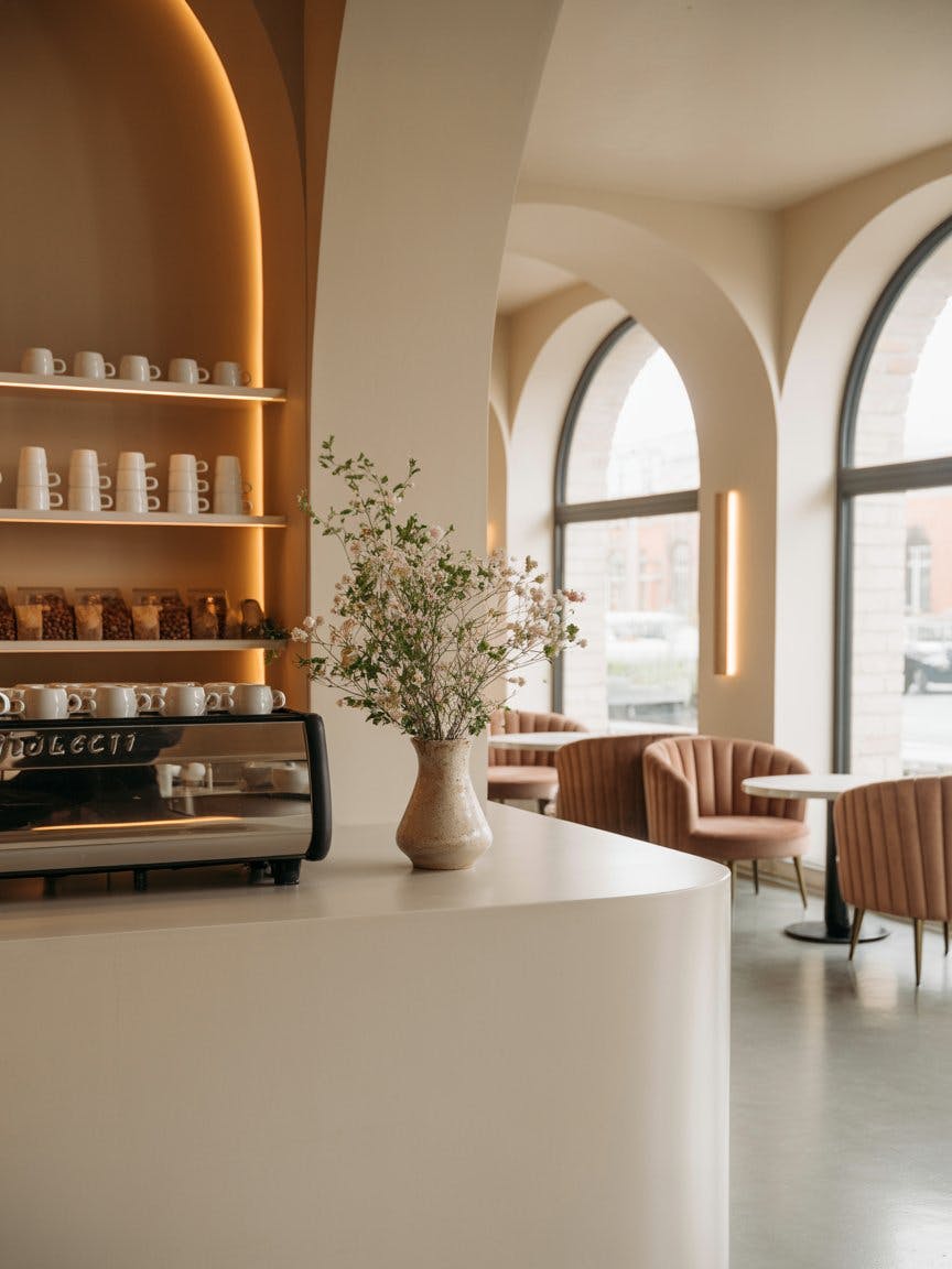 Elegant modern cafe interior, minimalist curved architecture, soft ambient lighting, arched floor-to-ceiling windows, neutral beige and cream color palette, sleek white coffee counter, golden warm light accents, shelves with neatly arranged coffee items, cozy velvet chairs in rich brown tones, delicate flower arrangement on the counter, Scandinavian design influence, serene and inviting atmosphere, high-end aesthetic, morning light streaming through windows, luxury coffee shop vibe, minimalist decor
