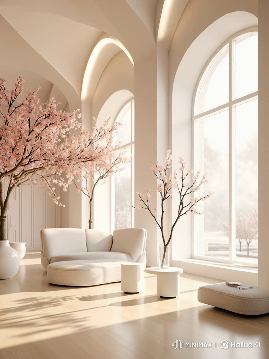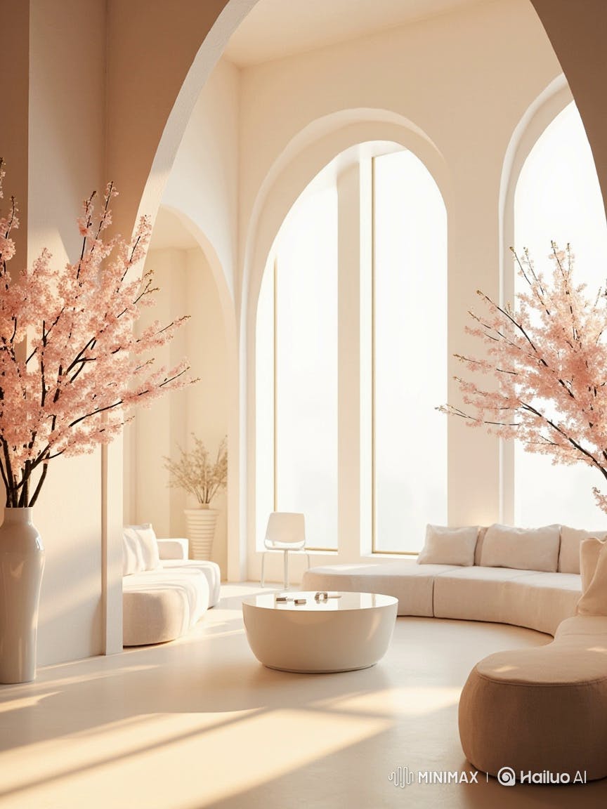 Elegant modern interior, curved arch architecture, soft ambient lighting, pastel pink cherry blossom trees indoors, minimalist white furniture, sculptural coffee table with soft edges, soft beige wooden flooring, luxury boutique design, calming neutral tones, light-filled space with large windows, floral arrangements in white vases, high-end aesthetic, serene and sophisticated atmosphere, refined contemporary decor, subtle textures and smooth surfaces, dreamy upscale lounge setting, interior photography style, ultra-realistic rendering, high definition, cinematic composition