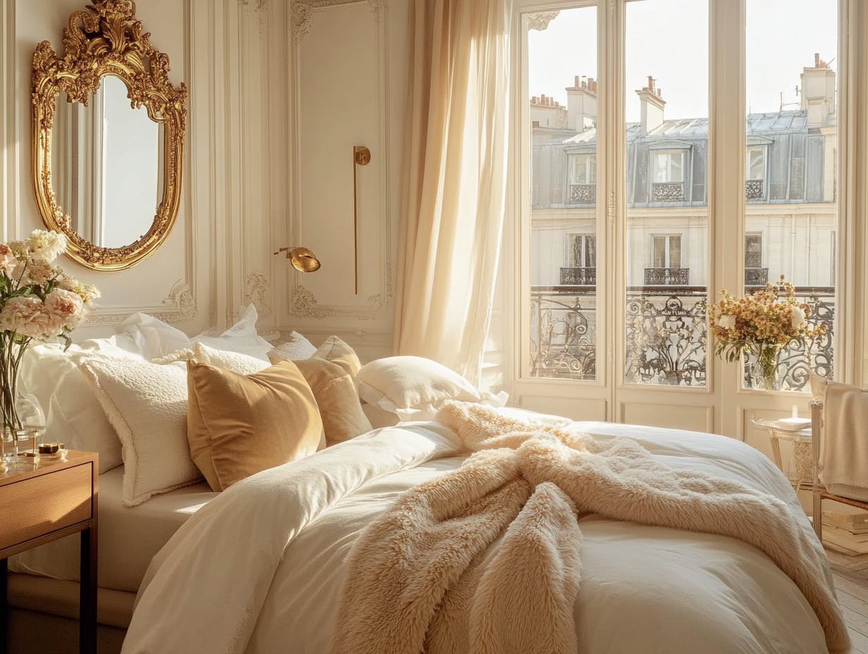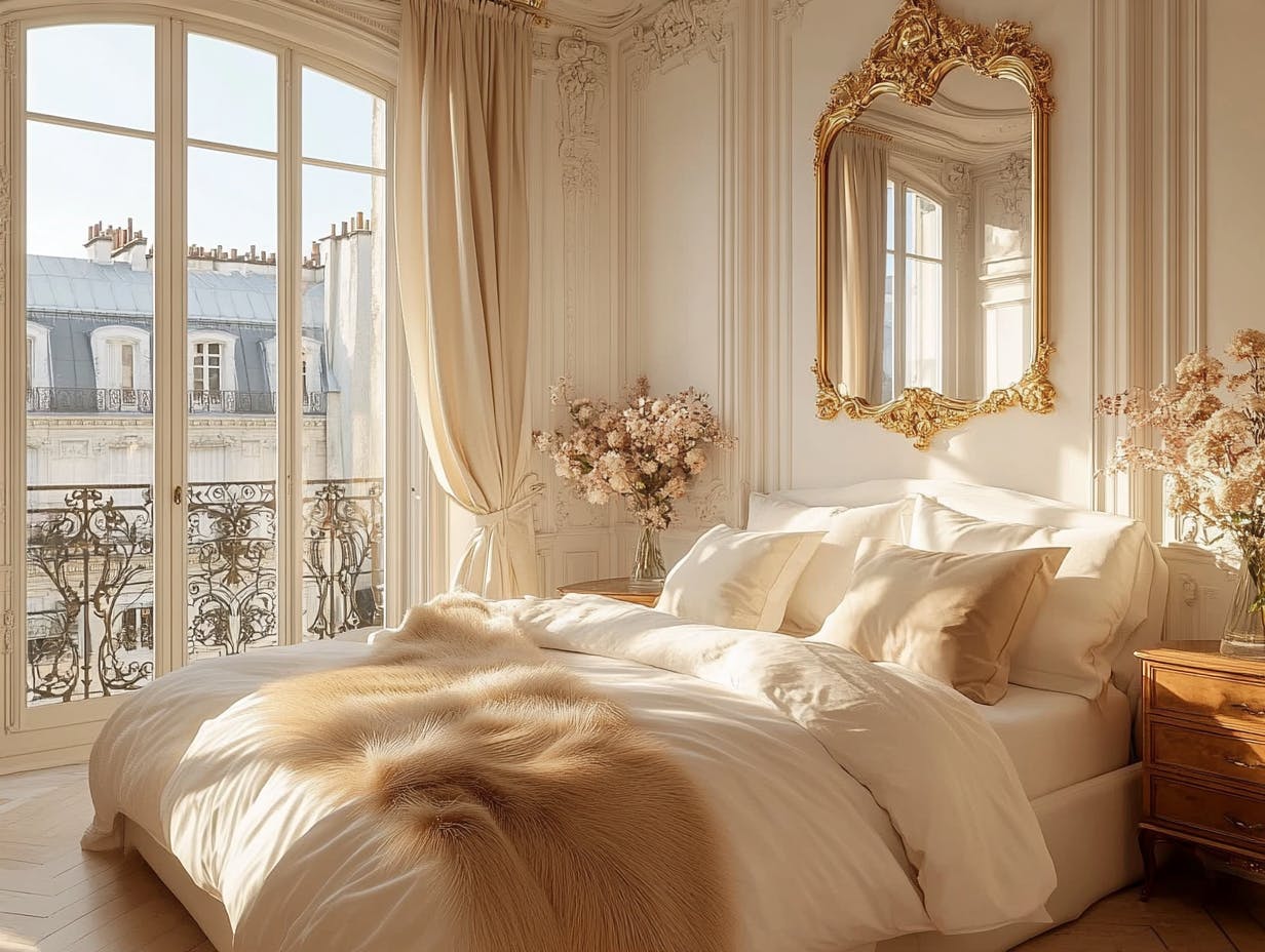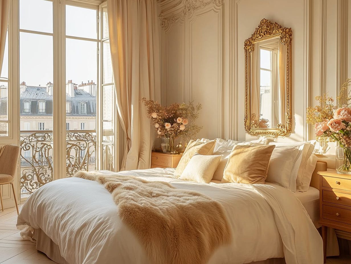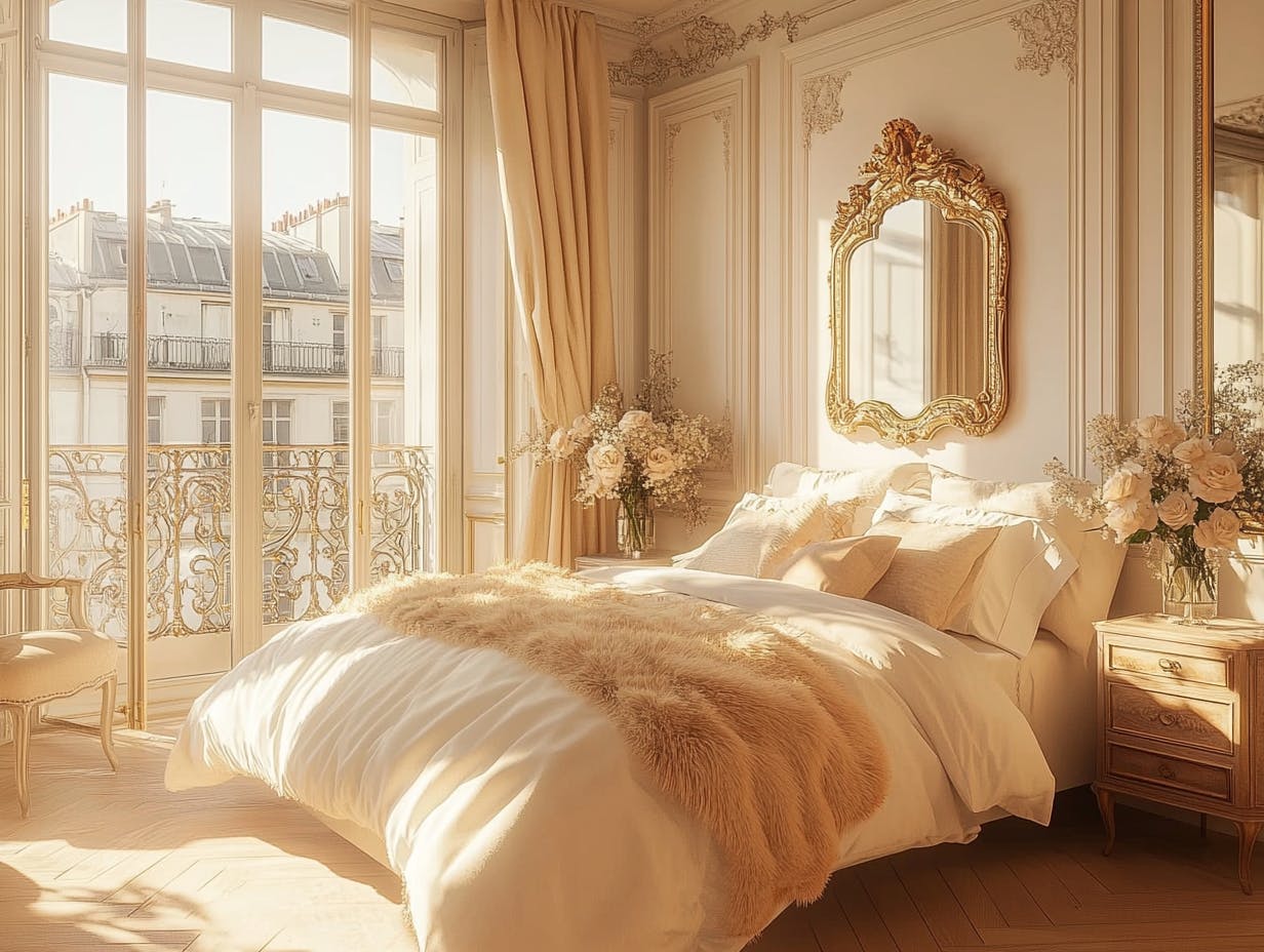 Elegant Parisian bedroom, bathed in warm golden sunlight, luxurious white bedding with plush beige and gold accent pillows, soft faux fur throw draped over the bed, classic Haussmann-style architecture with intricate wall moldings, ornate gold-framed mirror above the bed, delicate floral arrangements in golden vases, vintage wooden nightstands, floor-to-ceiling French windows with flowing cream curtains, charming wrought-iron balcony overlooking classic Parisian rooftops, soft and inviting ambiance, warm and cozy atmosphere, sophisticated and timeless design. --ar 4:3