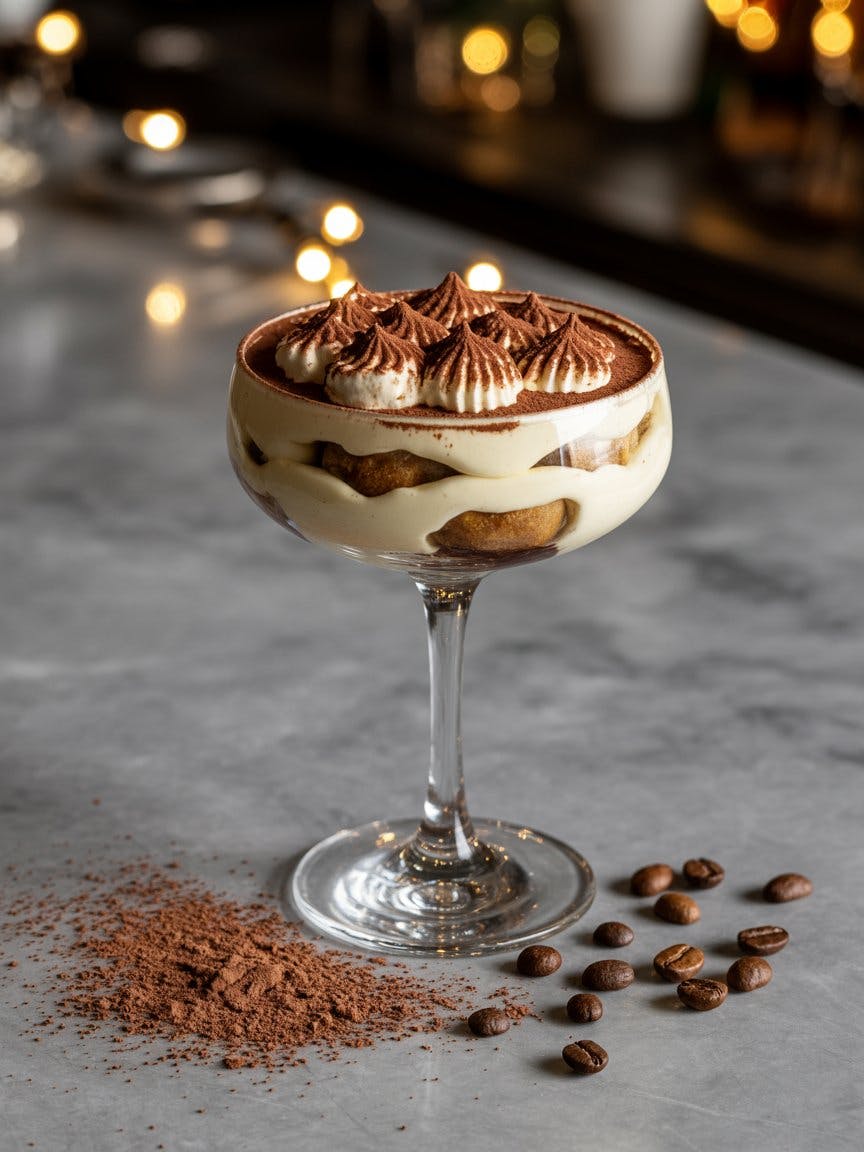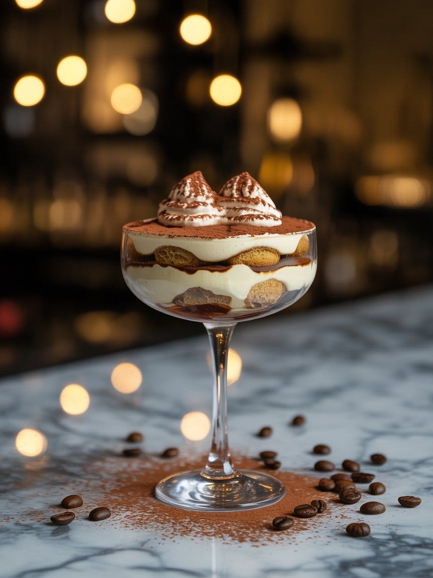 Elegant tiramisu dessert in a coupe glass, layered with creamy mascarpone and rich espresso chocolate, topped with whipped cream, cocoa powder dusting, and ladyfinger biscuits, warm bokeh lights in the background, marble countertop with scattered coffee beans and cocoa powder, cozy and luxurious dessert scene, Italian-inspired ambiance, rich tones, high-end food photography, evening dessert vibes, gourmet presentation, soft focus background, cinematic lighting, romantic café atmosphere