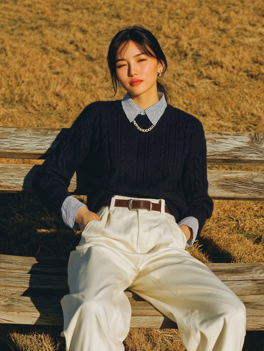 Chic autumn outfit, pretty korean woman in her early 20s, influencer, extremely beautiful, fair skin, navy cable-knit sweater layered over striped white collared shirt, tucked into high-waisted ivory wide-leg trousers, brown leather belt, minimalist jewelry with a silver necklace, sitting on a wooden park bench, dry autumn grass in the background, warm sunlight casting soft shadows, Korean preppy fashion style, natural daylight photography, casual elegance, fall fashion mood --ar 3:4 --quality 2 --raw