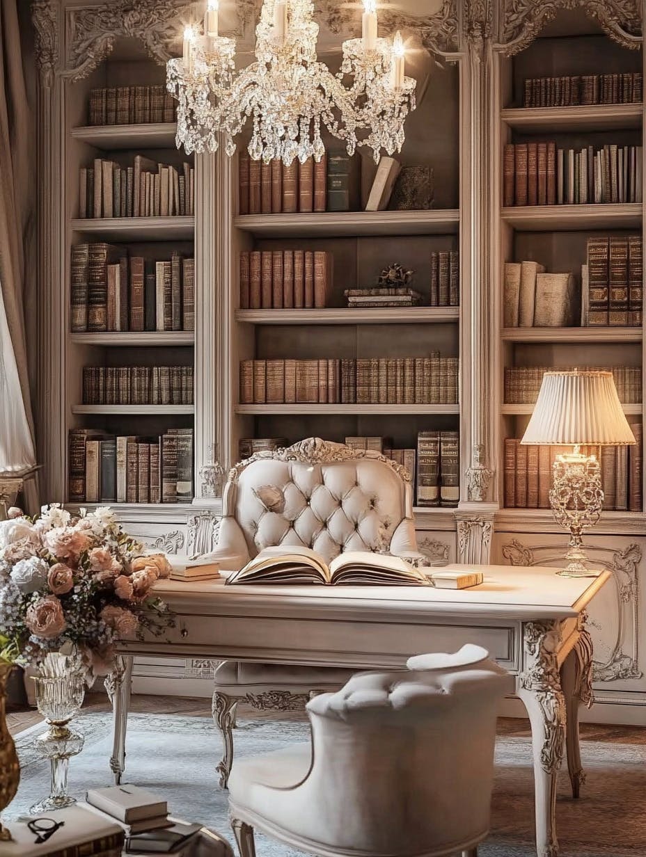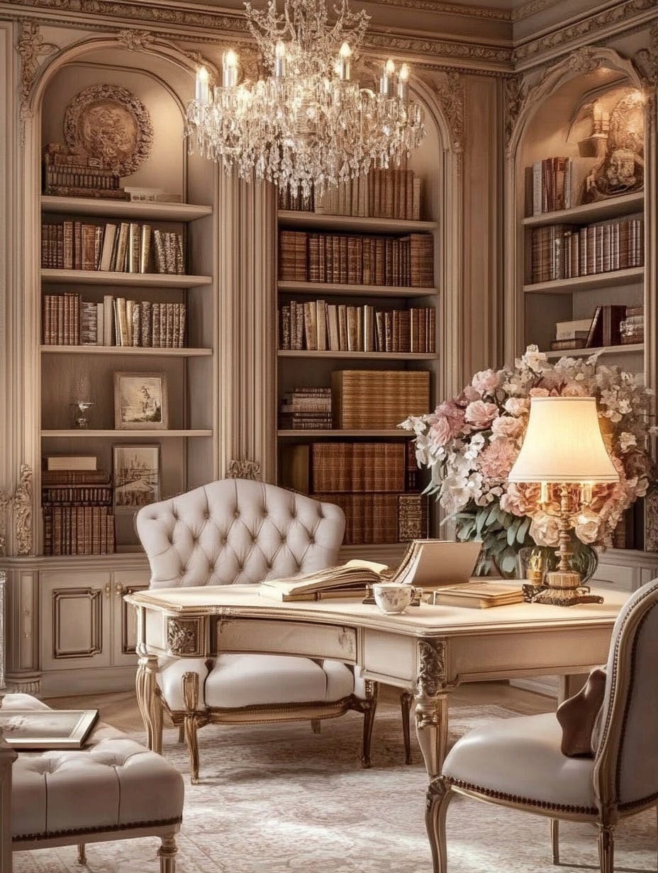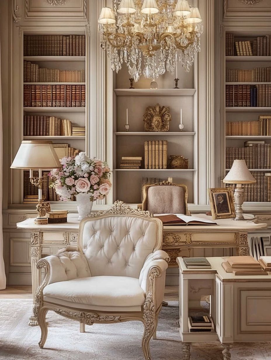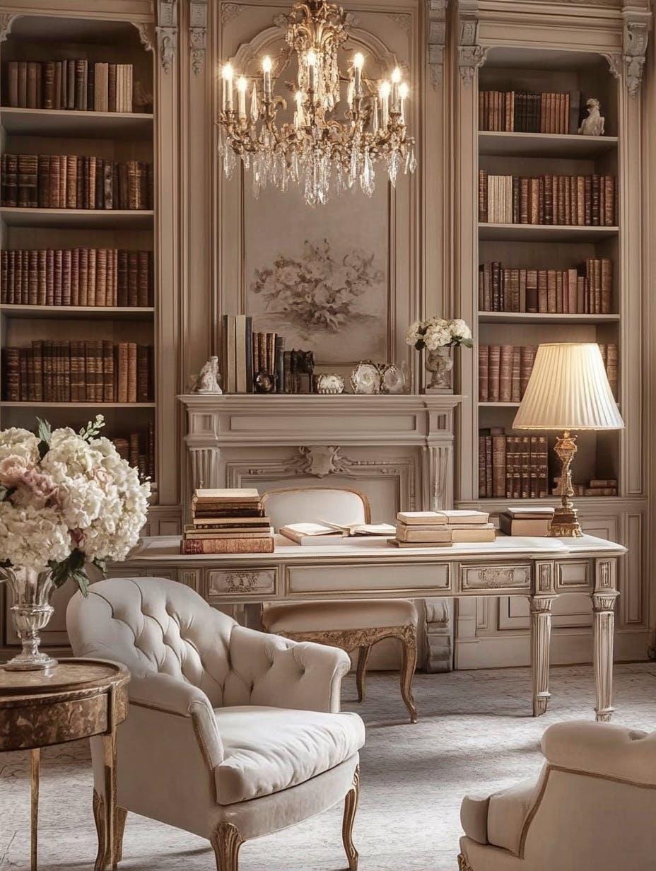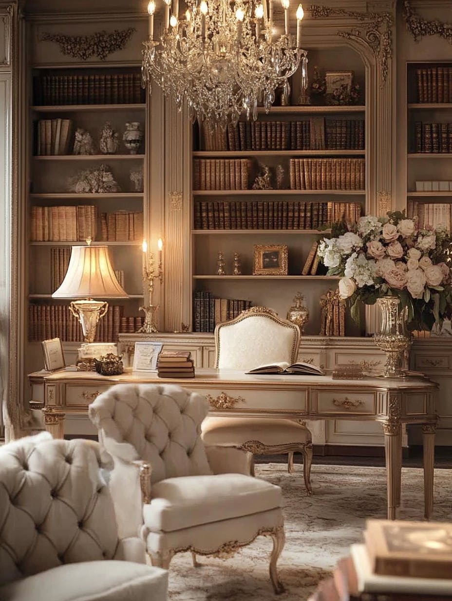 Elegant vintage study, luxurious French-inspired interior, ornate cream-colored wooden furniture, tufted armchair with plush cushions, antique bookshelves filled with leather-bound books, soft warm lighting from classic table lamps, crystal chandelier casting a golden glow, delicate floral arrangements in porcelain vases, intricate wall moldings with a timeless aesthetic, a grand desk adorned with open books and writing accessories, sophisticated and cozy ambiance, high-definition details, romantic and nostalgic atmosphere. --ar 3:4