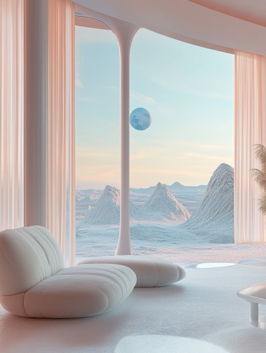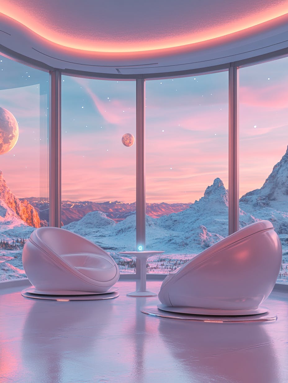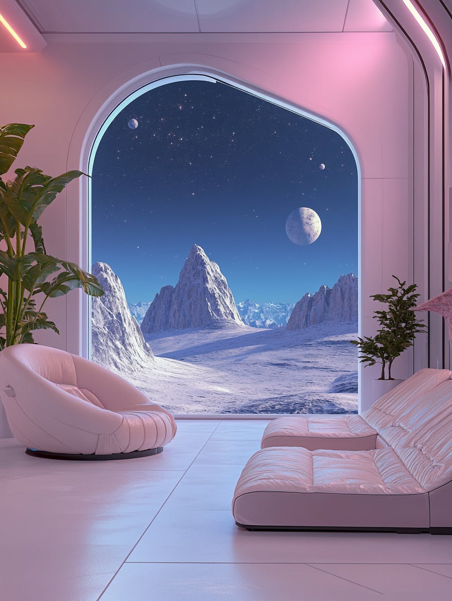 futuristic cozy living room, minimalist, beige interior, modern and aesthetic, intricate details, the view from the window, on the surface of a distant planet with moons and mountains in the distance, pink blue white, minimalistic interior clean floor, high resolution, Nikon D850 DSLR 4k, award winning photography --ar 3:4