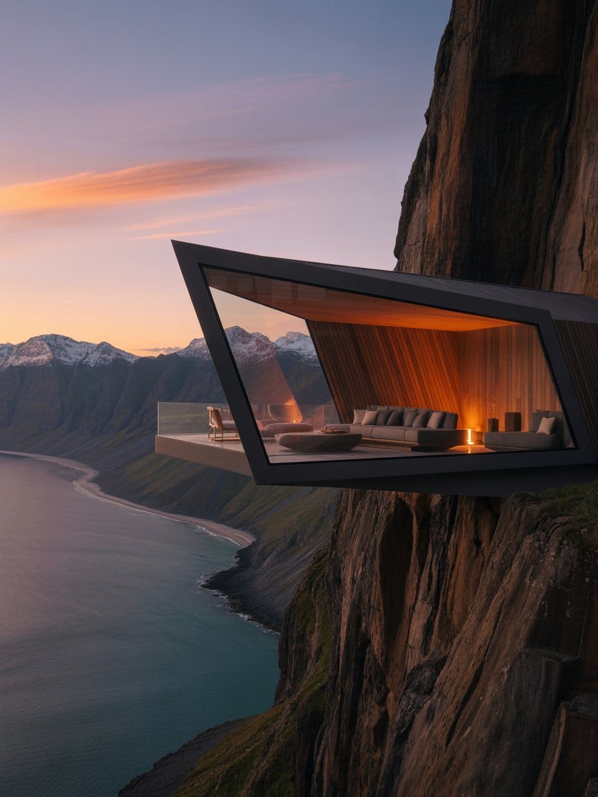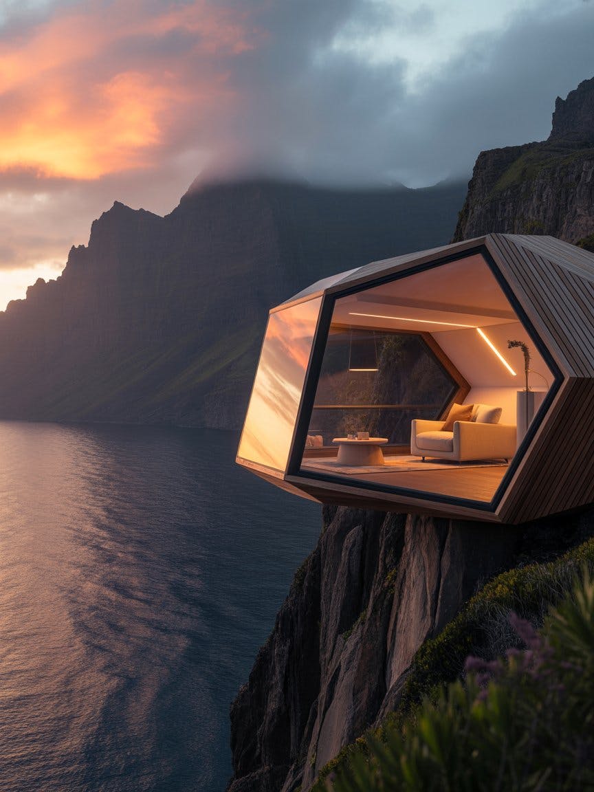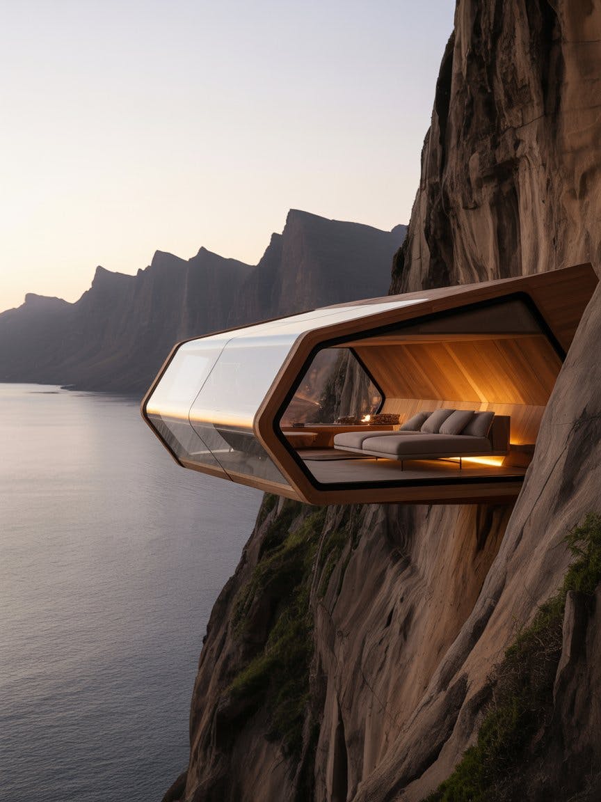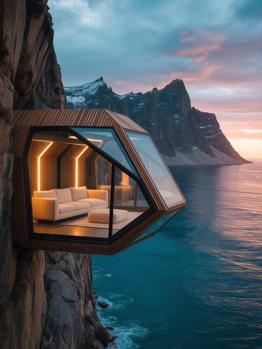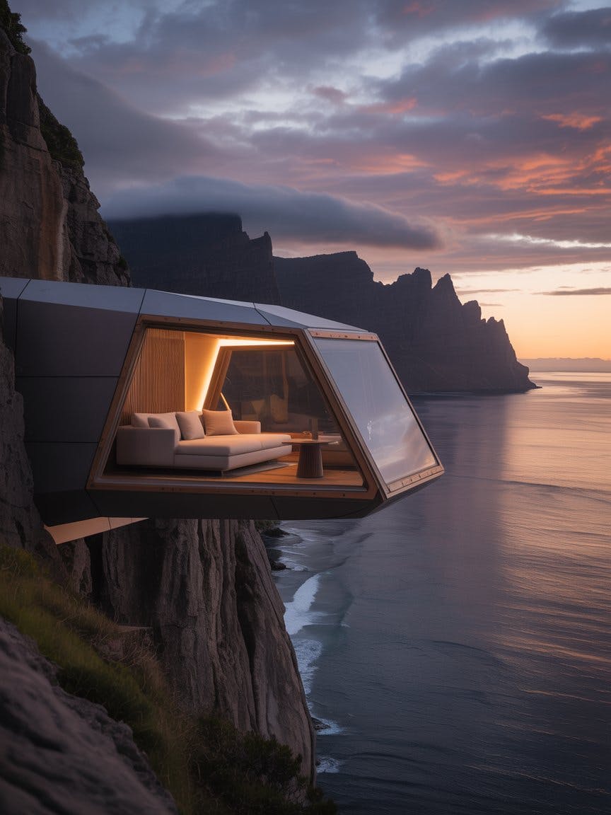 Futuristic geometric cliffside pod, hanging on a vertical rock face, overlooking a serene ocean at sunset, angular wooden and glass architecture, warm ambient lighting glowing from within, panoramic window with modern minimalist interior, dramatic natural setting, tranquil sea and rugged mountains in the distance, surreal and innovative eco-retreat design, luxury off-grid living, harmony with nature, high-definition realism, soft atmospheric lighting, photorealistic style, ultra-detailed textures