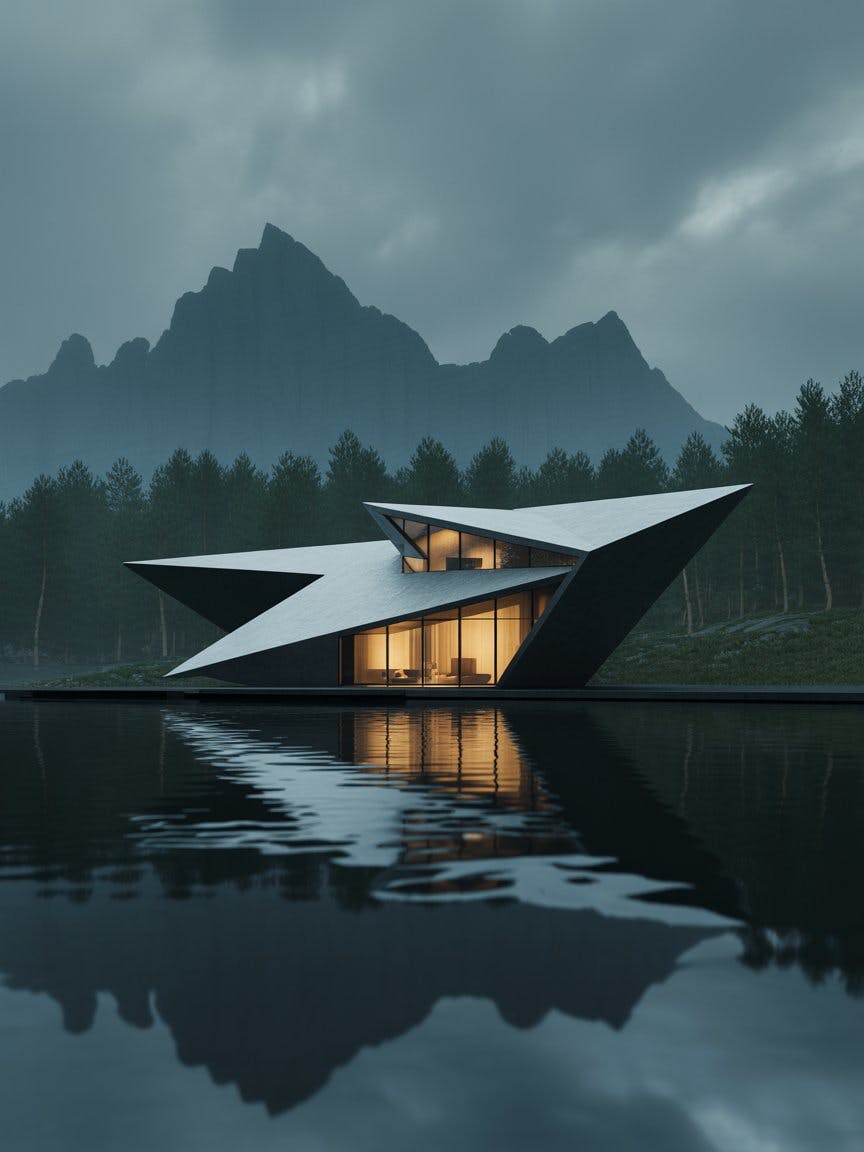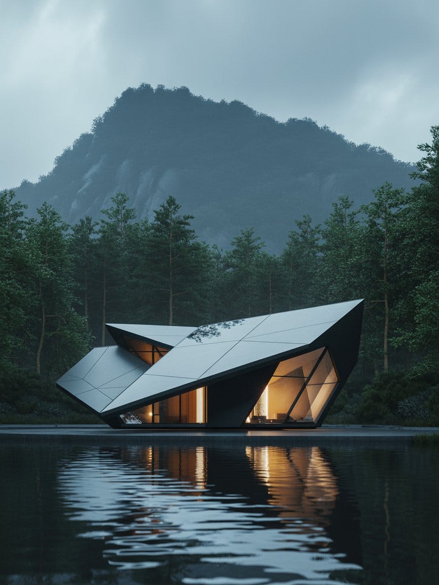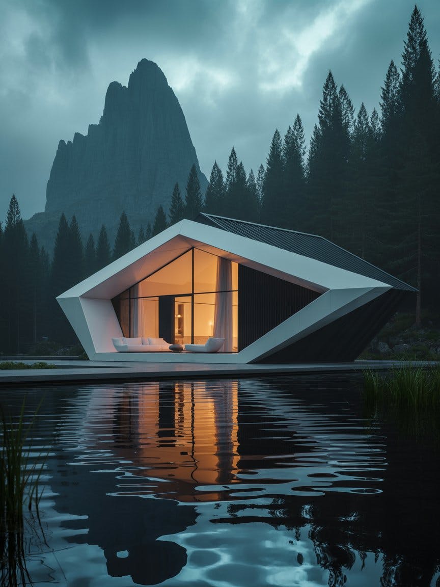 Futuristic geometric house, sharp angular roof design, minimalist white and black exterior, warm glowing interior lights, modern architecture, surreal reflective water surface, set against dramatic mountain silhouette, moody overcast sky, abstract architectural concept, high-contrast lighting, serene forest background, conceptual home design, sharp edges and clean lines, peaceful remote location, cinematic atmosphere