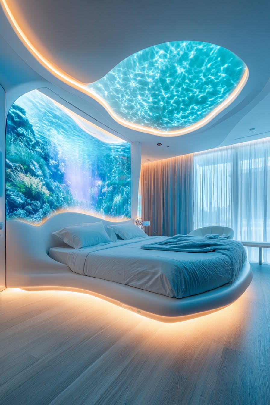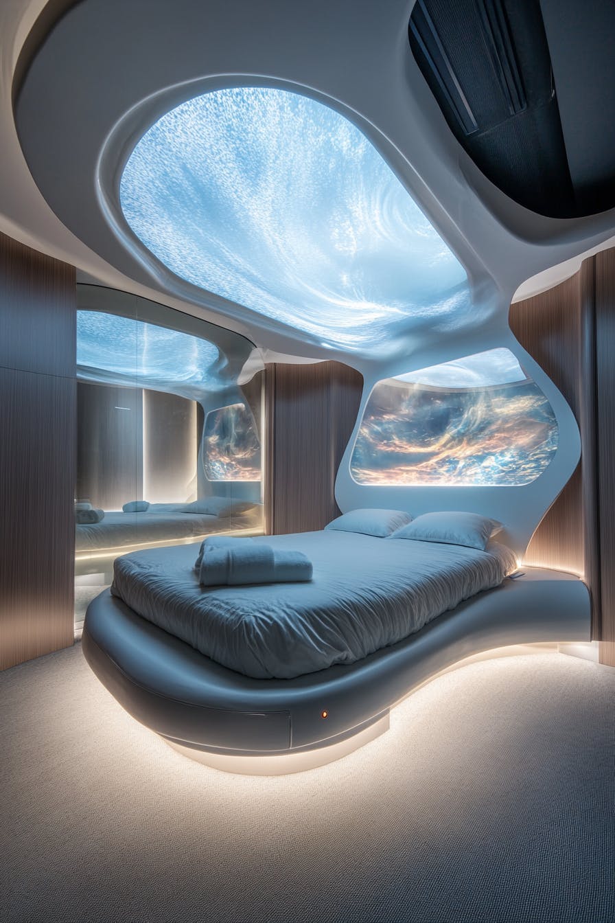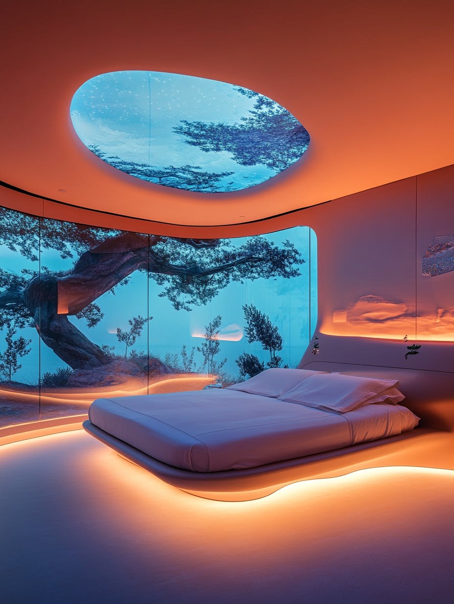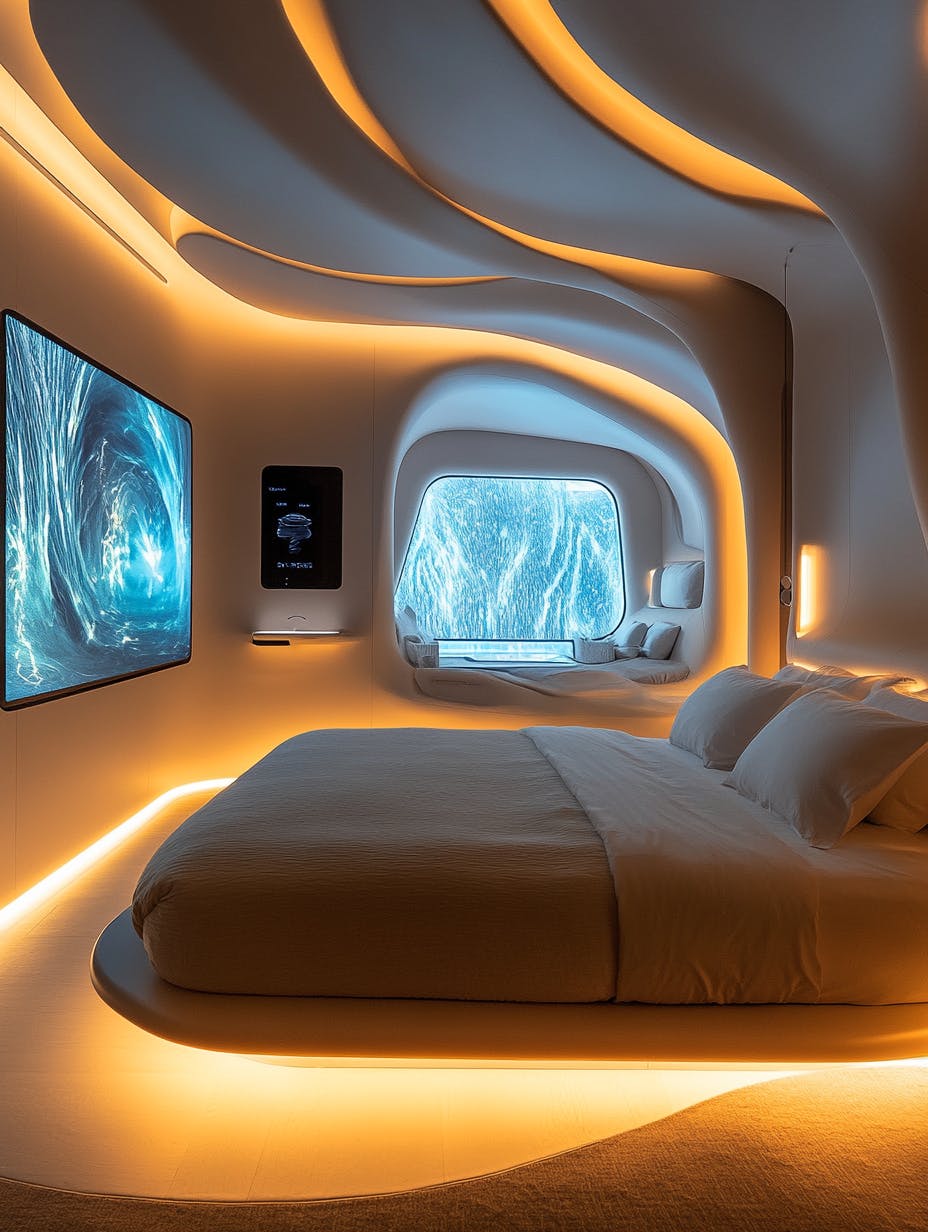 A fully interactive hotel suite featuring walls made of smart glass that display customizable artwork and digital landscapes, a floating bed with embedded LED strips, and a voice-activated climate and lighting system. The ceiling is a curved organic shape embedded with soft glowing ambient light, enhancing the space’s ultra-modern serenity. --ar 2:3