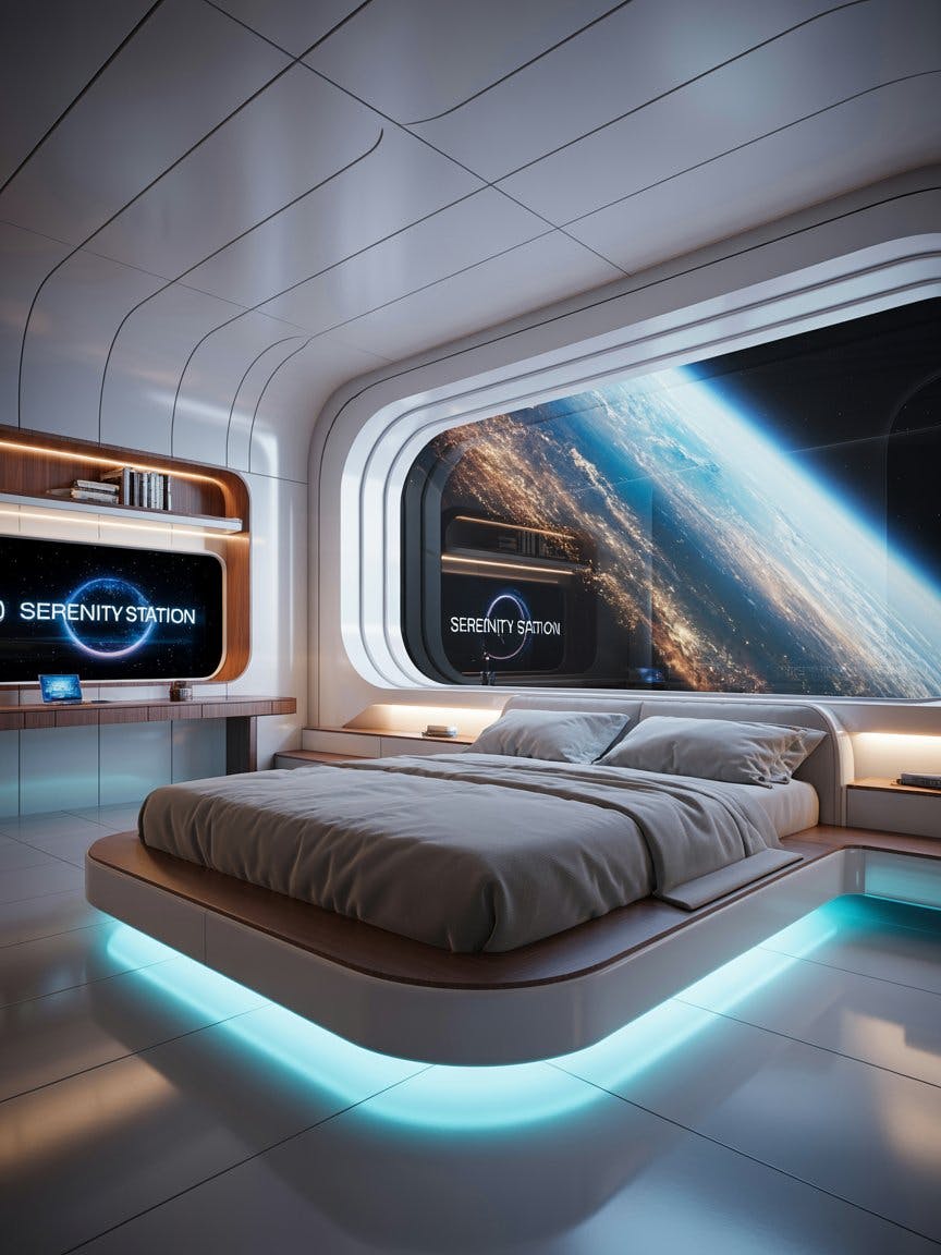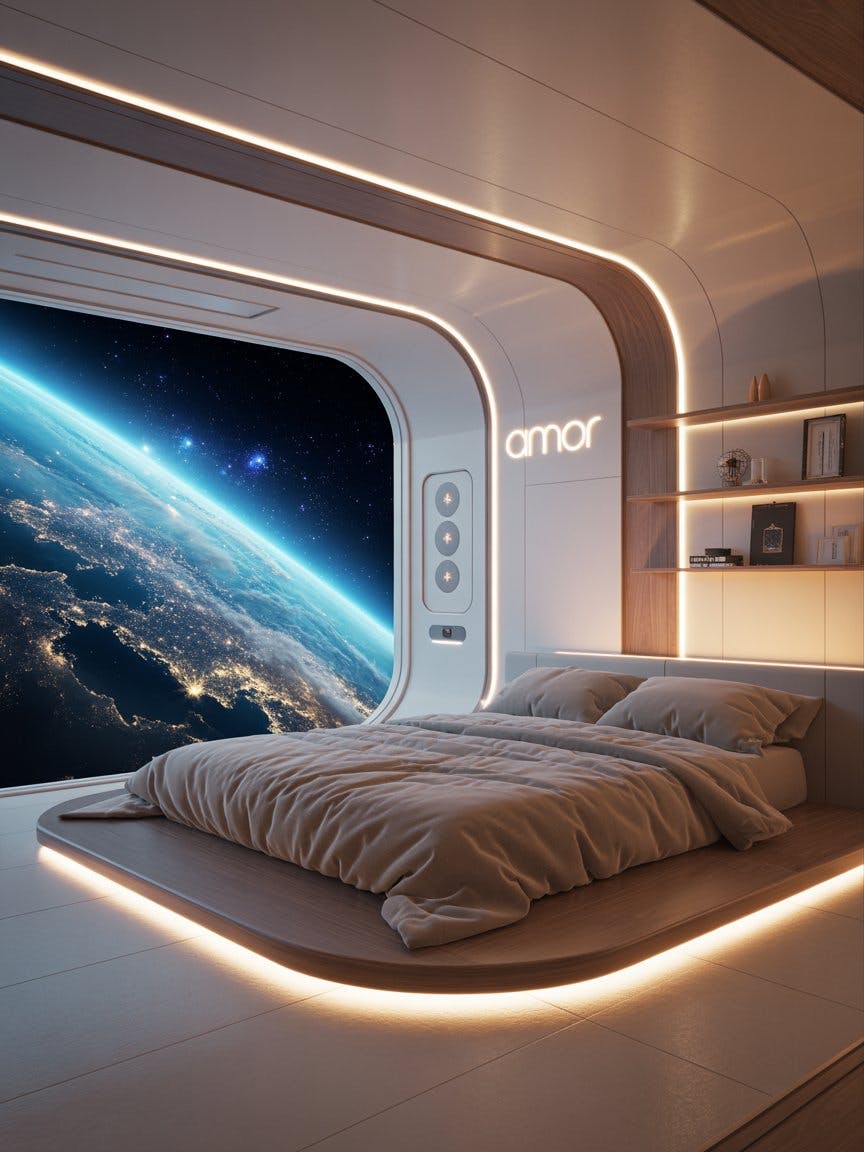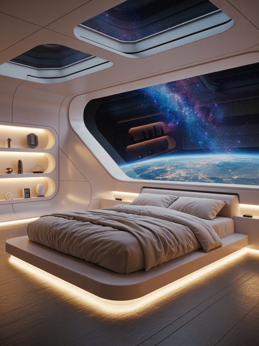 Futuristic luxury bedroom inside a space station, curved panoramic windows revealing a star-filled galaxy and Earth in the distance, sleek modern architecture with smooth white panels and integrated ambient LED lighting, floating bed with soft neutral-toned bedding, warm wood accents and high-tech shelving, minimalistic yet cozy aesthetic, advanced smart home features subtly embedded in walls, glowing under-bed lights, ultra-modern interior design, peaceful space ambience, cinematic lighting, sci-fi dreamscape, high-detail 3D rendering, ultra-realistic textures, concept art style