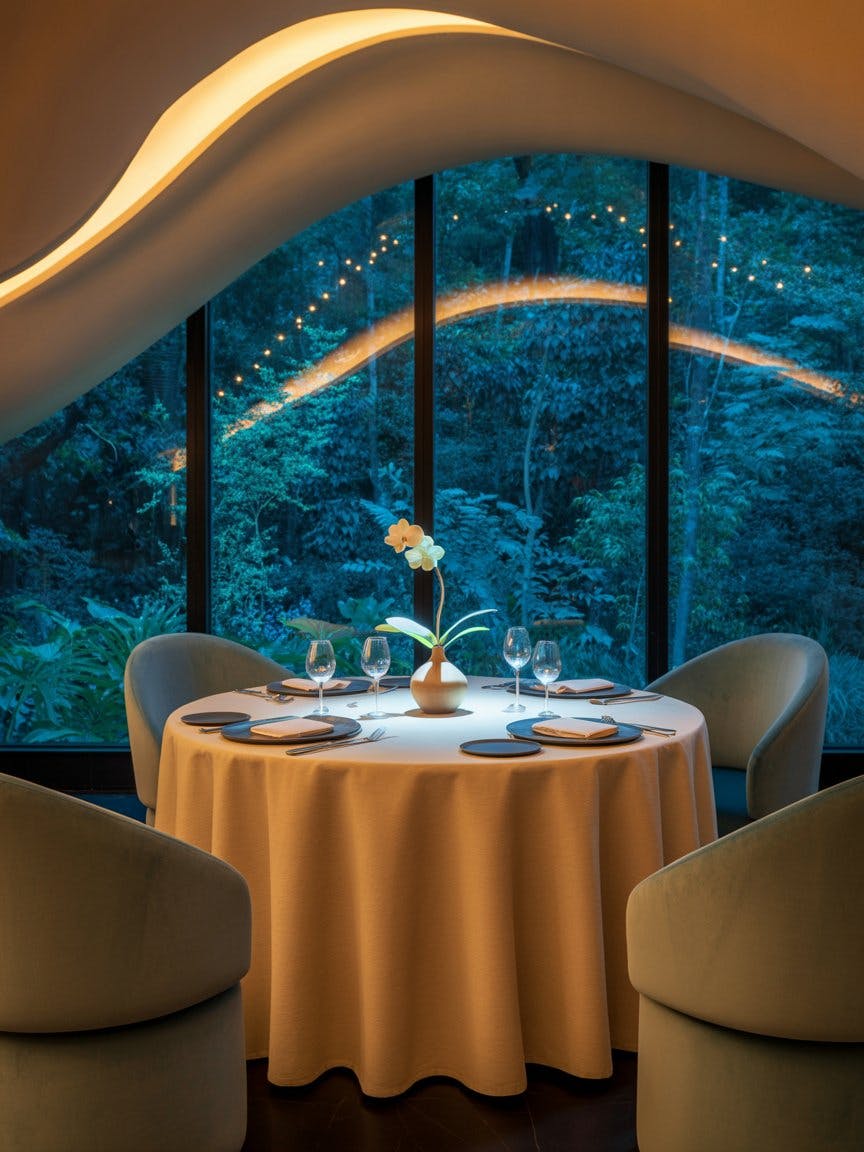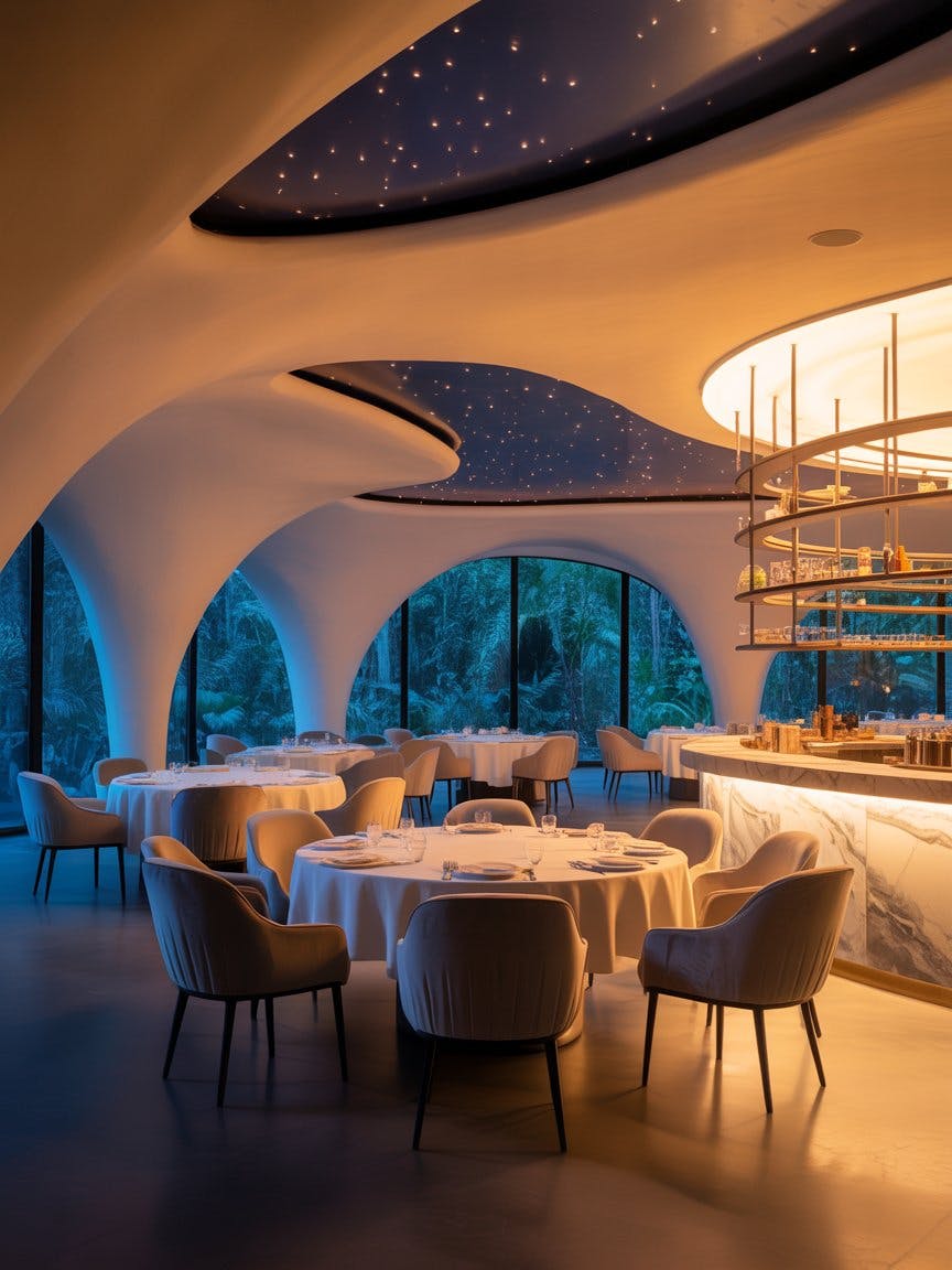 Futuristic luxury restaurant interior, organic flowing architecture with sculptural ceiling arches, starry night ceiling lights, ambient warm lighting, curved furniture in muted tones, elegant round dining tables, velvet upholstered chairs, floor-to-ceiling windows revealing lush forest outside, nature-inspired design, modern bar with artistic glass shelving, serene atmosphere, biophilic design elements, cinematic lighting, high-end contemporary aesthetic