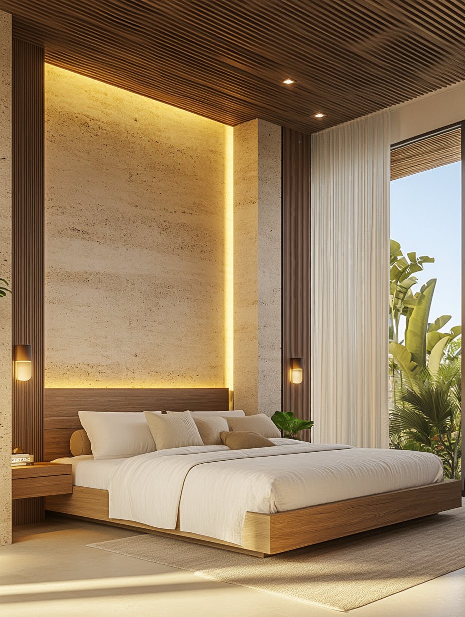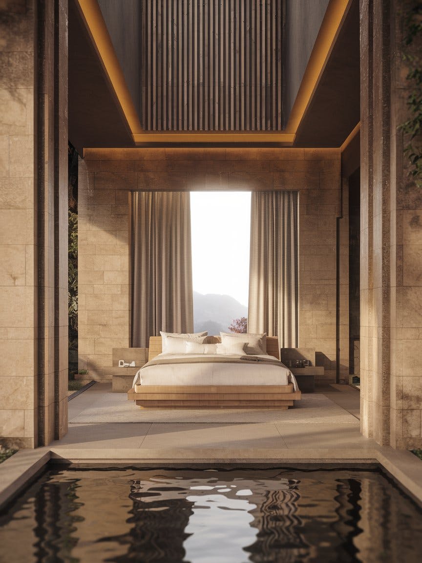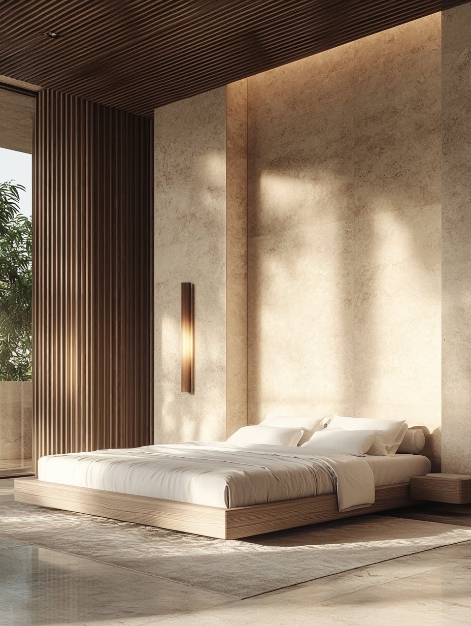 Modern luxury bedroom interior, grand architectural design, tall stone columns, marble-textured walls in warm beige and brown tones, minimalist wooden bed with white linens and neutral pillows, soft natural lighting pouring through large floor-to-ceiling windows, vertical wood slat ceiling detail, elegant wall sconces with warm glow, serene and tranquil atmosphere, contemporary furniture with clean lines, open space concept, earthy color palette, high-end resort aesthetic, photorealistic rendering, ultra high definition, cinematic composition
