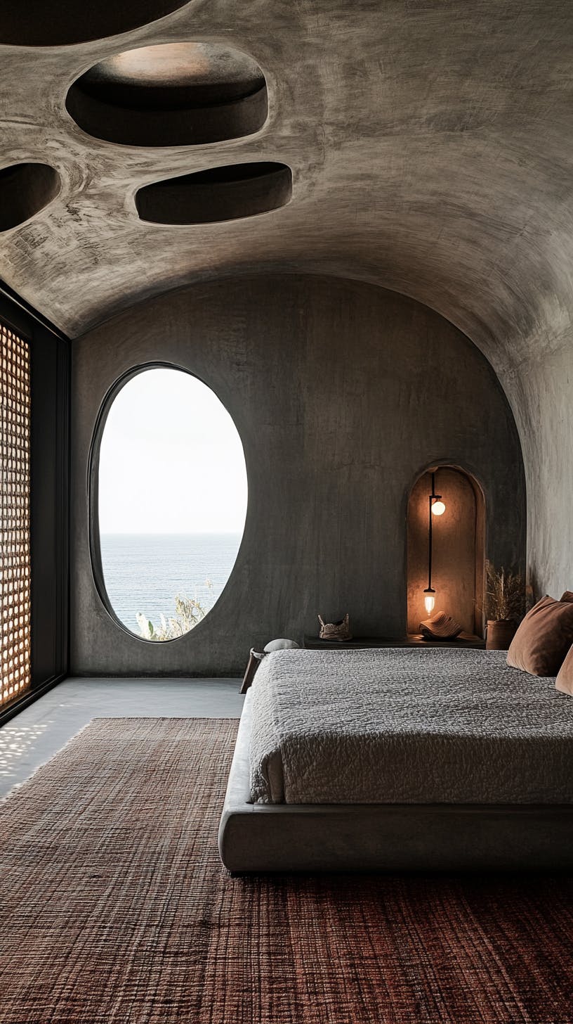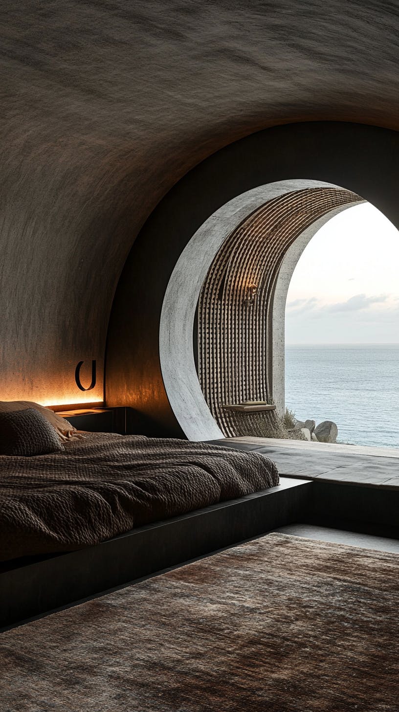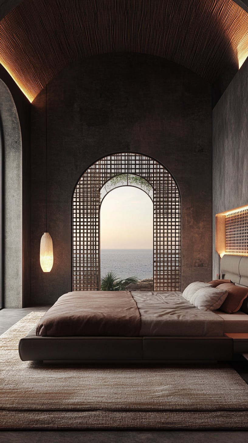 high-end bedroom in futuristic seafront villa, dark-toned concrete walls, arched window with wood lattice, built-in ambient lighting, minimalist low bed with rich fabrics, warm indirect lights, curved architectural ceiling, soft rugs, calm and serene vibe, ocean breeze through the window, consistent brutalist-mediterranean fusion